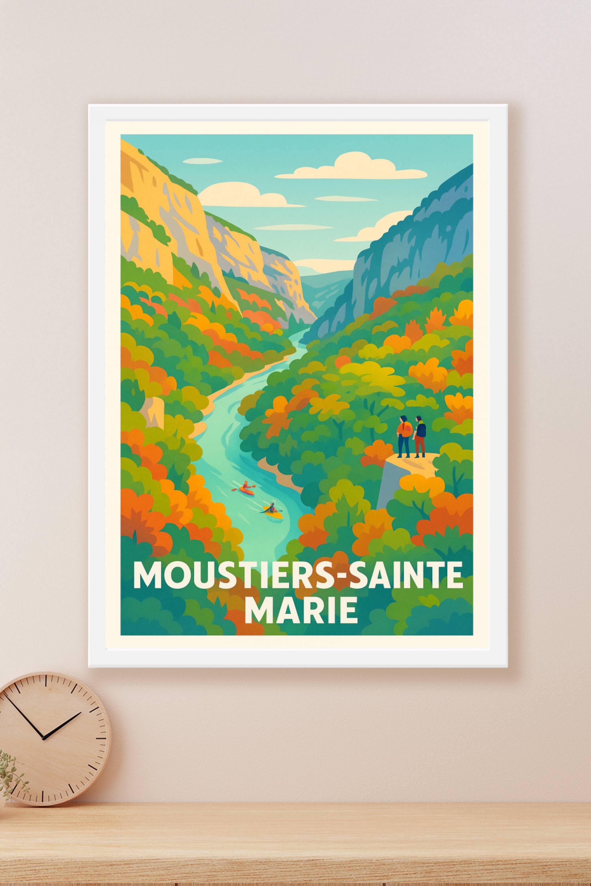 Découvrez la beauté naturelle spectaculaire de Moustiers-Sainte-Marie à travers cette affiche illustrée pleine de couleurs chaudes et apaisantes. L...