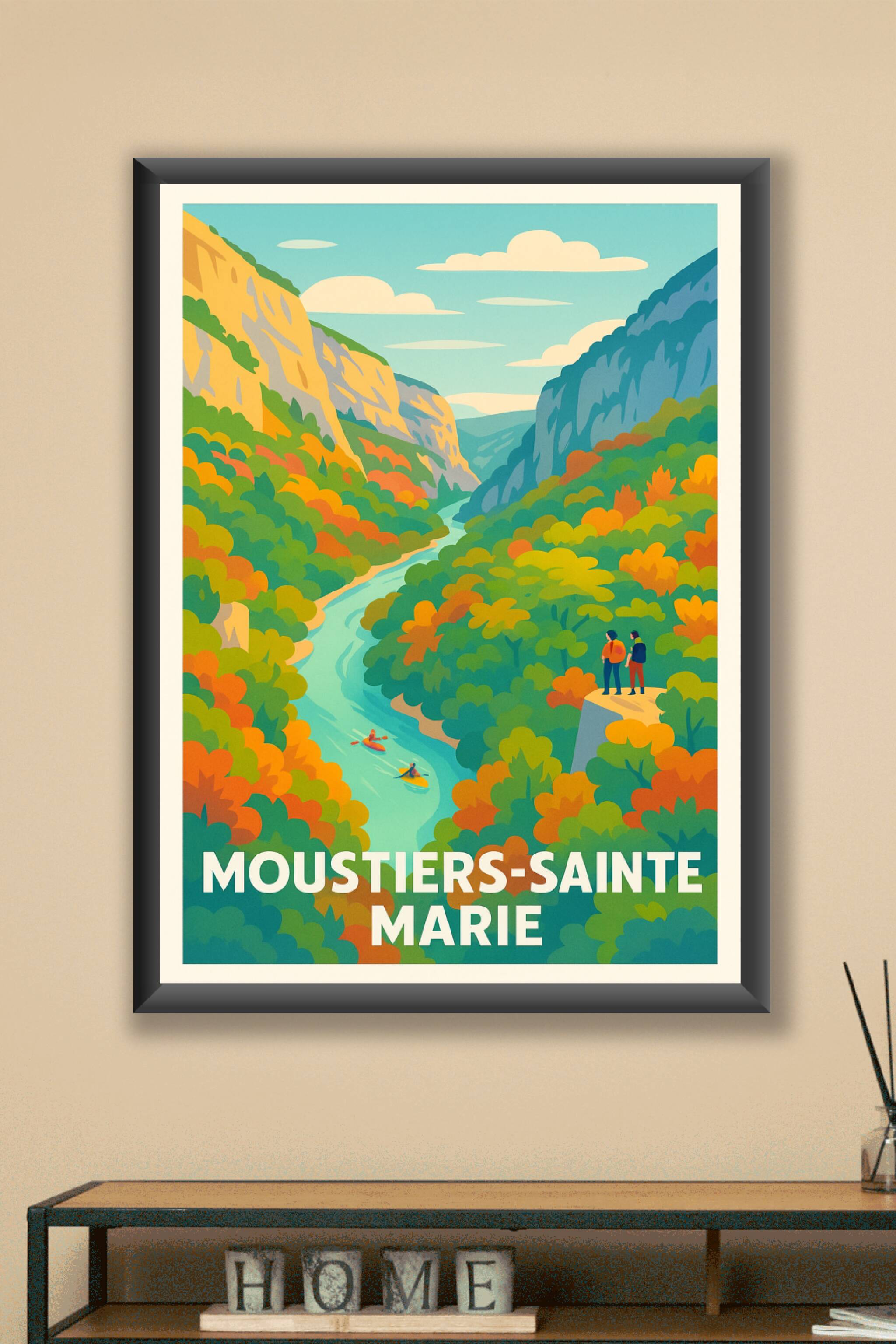 Découvrez la beauté naturelle spectaculaire de Moustiers-Sainte-Marie à travers cette affiche illustrée pleine de couleurs chaudes et apaisantes. Le poster met en valeur le canyon impressionnant où serpente une rivière turquoise, bordée de falaises majestueuses et d'une végétation luxuriante, avec deux kayakistes en pleine aventure et des randonneurs contemplant le paysage. Disponible en tirage "Fine Art" sur papier 305g coton, cette affiche garantit une qualité d'impression exceptionnelle, pour sublimer votre décoration intérieure. Choisissez parmi les formats A1 à A4, avec ou sans cadre, pour apporter une touche d’évasion et de nature authentique à votre intérieur ou pour offrir un cadeau unique et raffiné à un amateur de paysages grandioses.