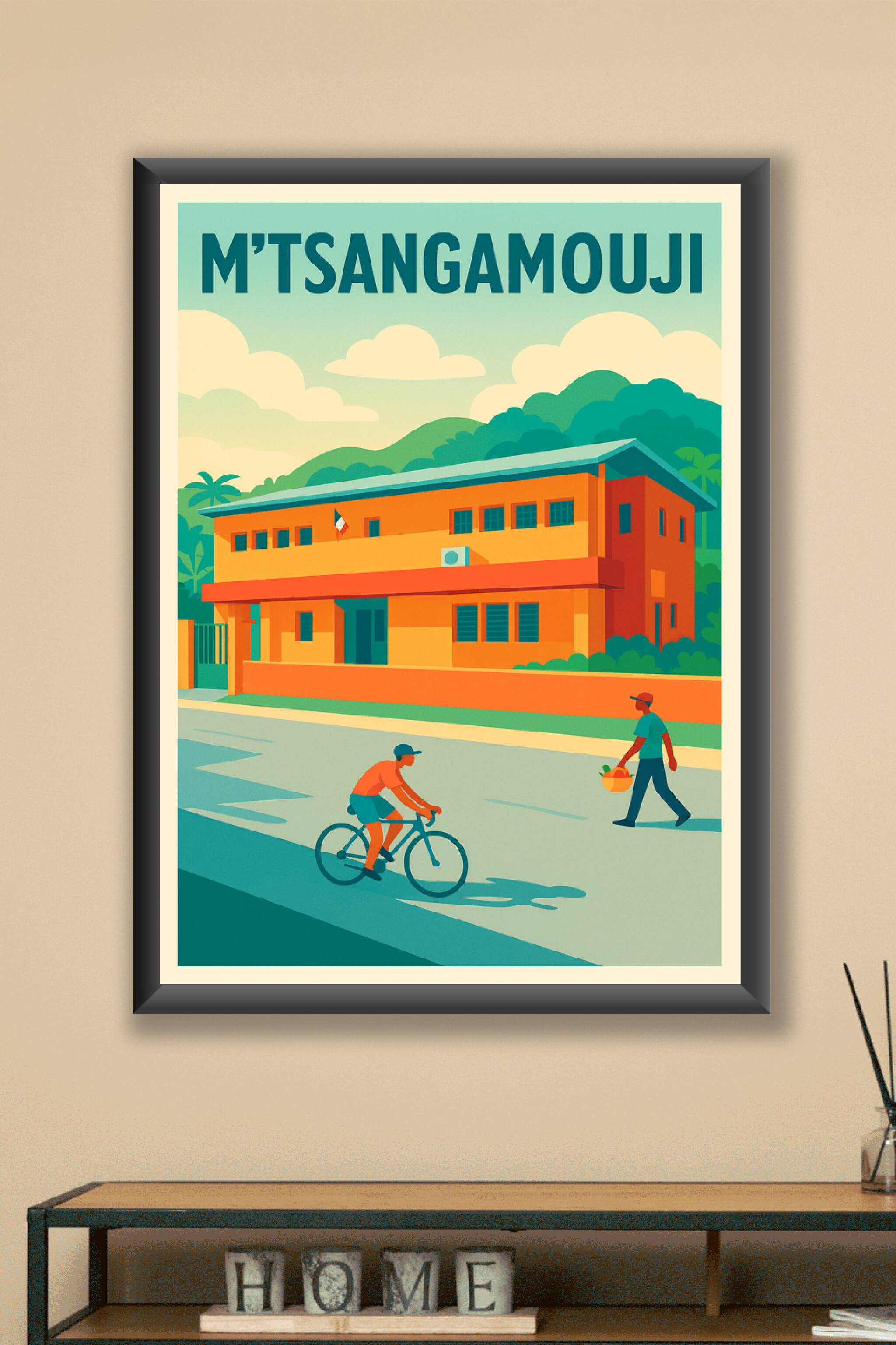 Découvrez l'ambiance paisible et lumineuse de M'Tsangamouji à travers cette affiche stylisée mettant en scène la vie locale et l'architecture color...