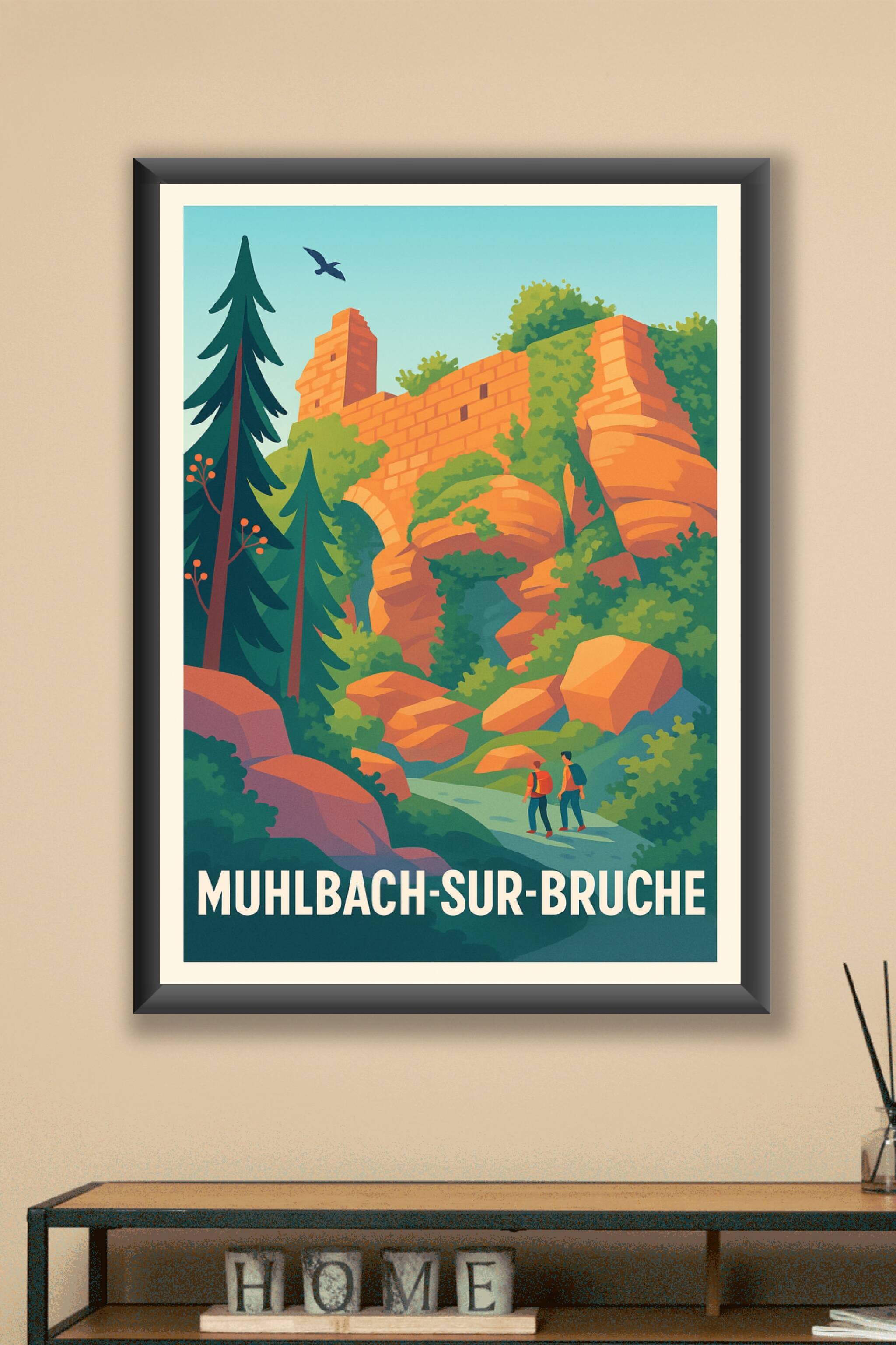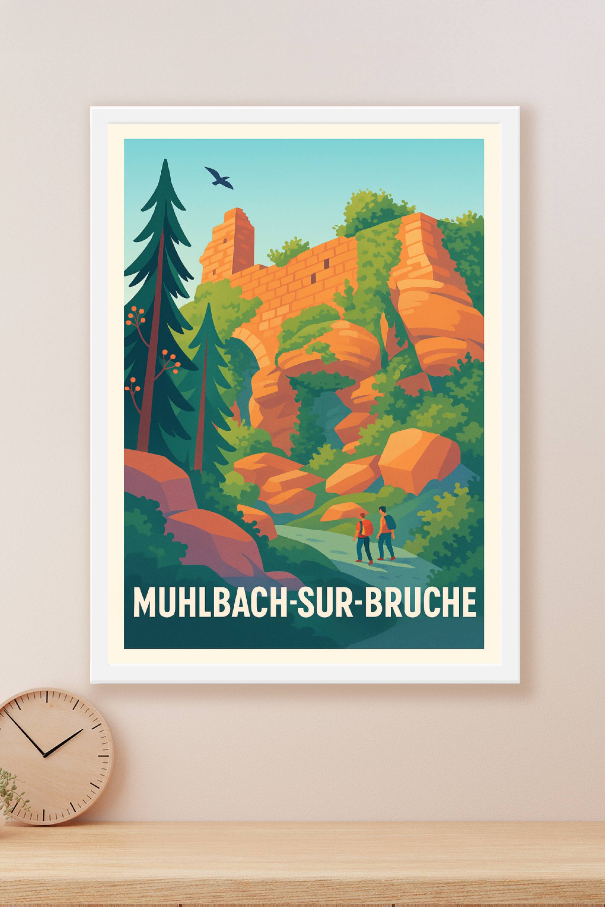 Découvrez l'esprit authentique de Muhlbach-sur-Bruche avec cette affiche illustrée mettant en avant ses paysages rocheux et ses vestiges historique...