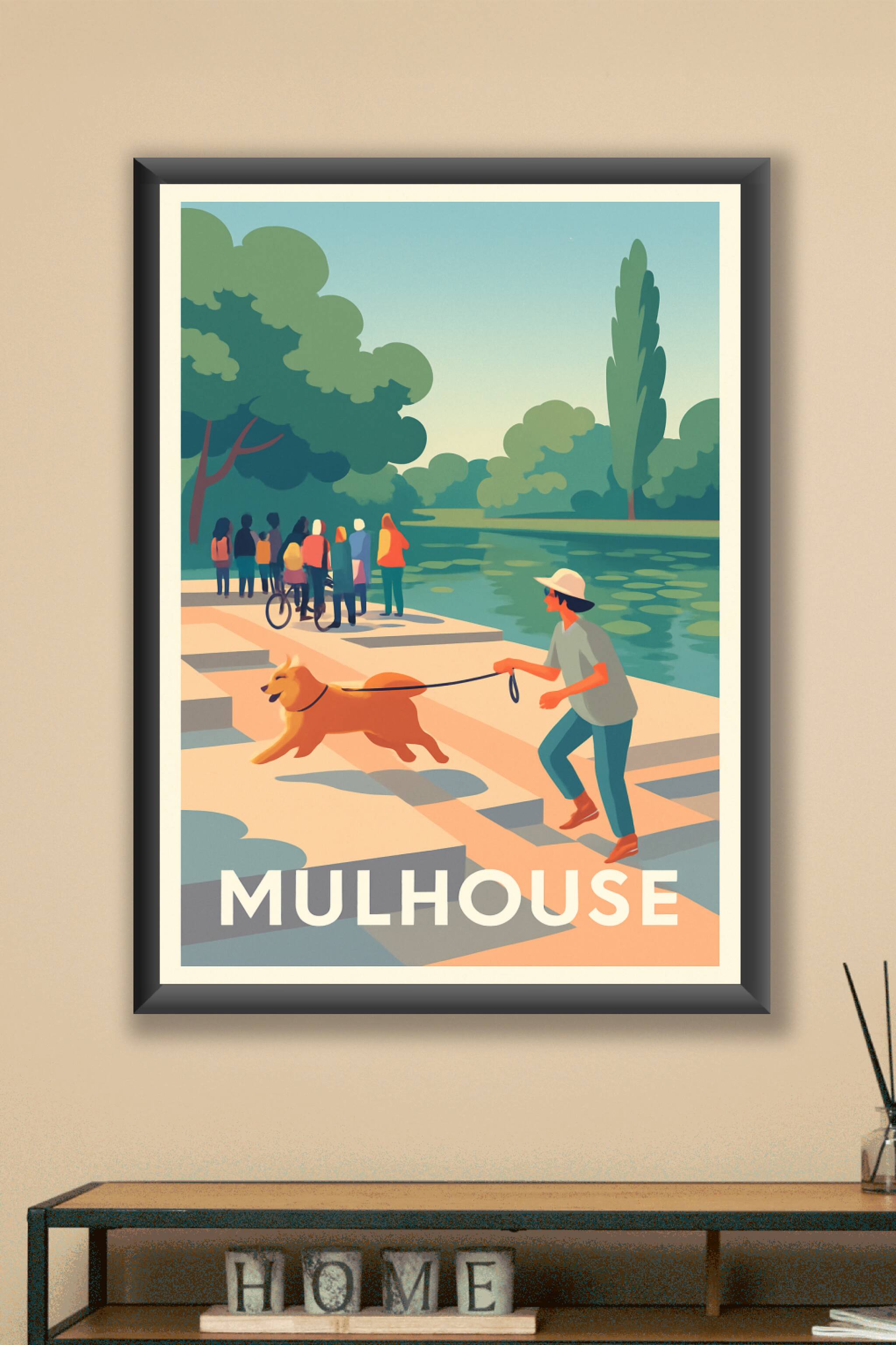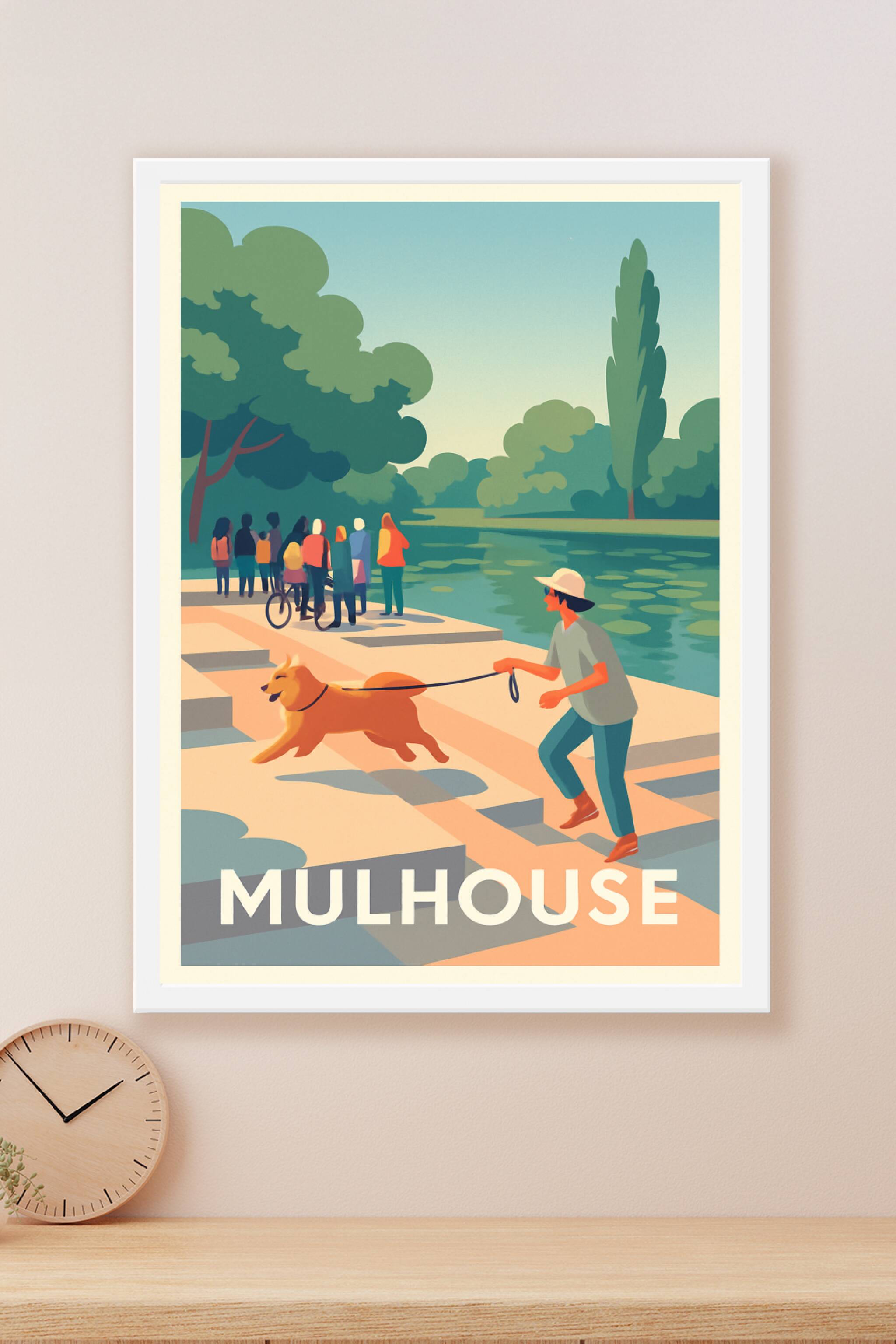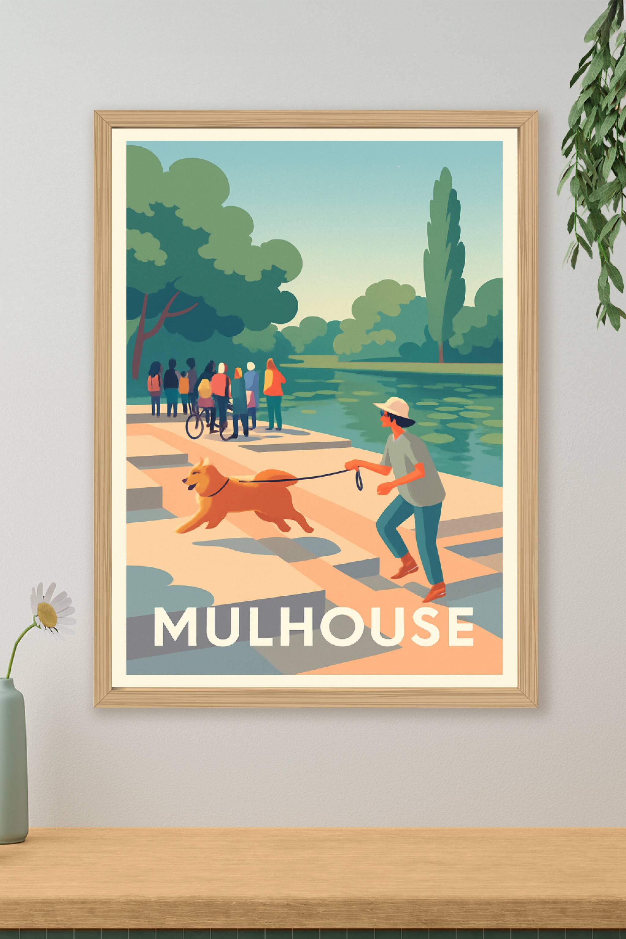 Découvrez cette affiche au style vintage mettant en scène une promenade paisible au bord de l'eau à Mulhouse, où nature et convivialité se rencontr...