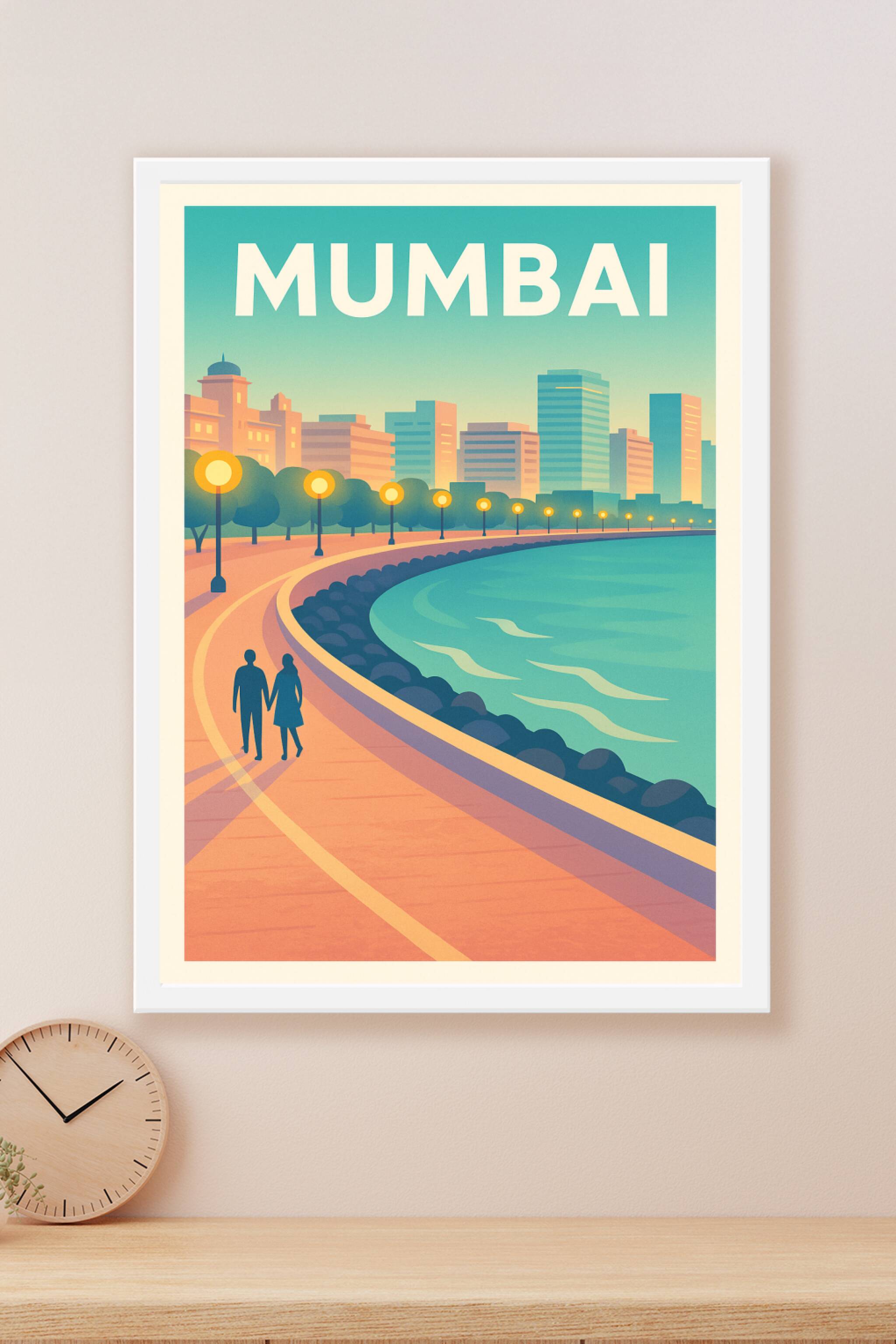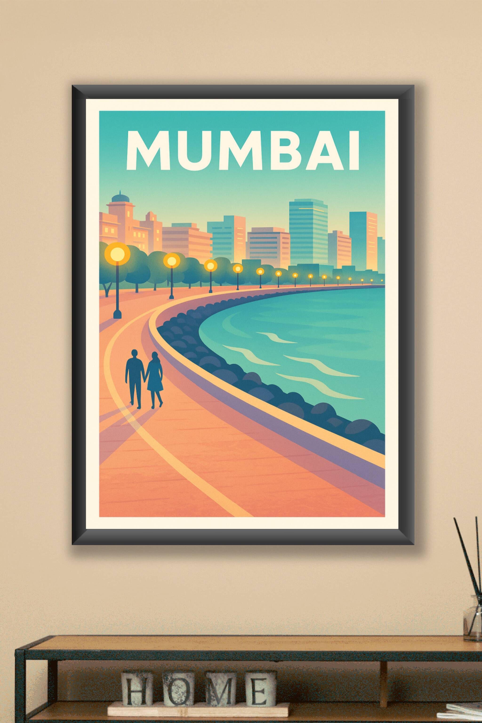 Cette affiche élégante capture la douceur d'une promenade en fin de journée le long de la baie de Mumbai, avec la silhouette de la ville illuminée ...