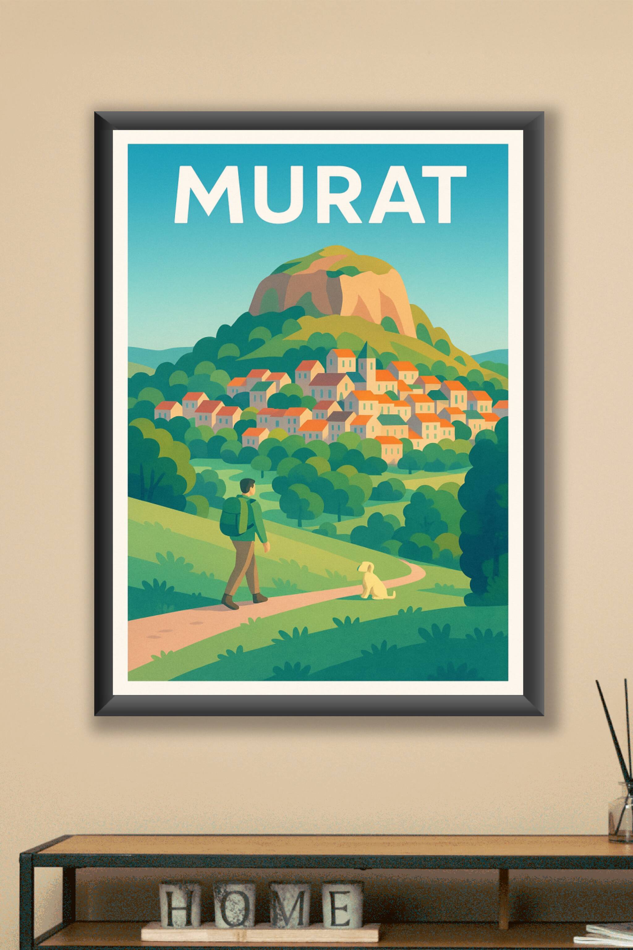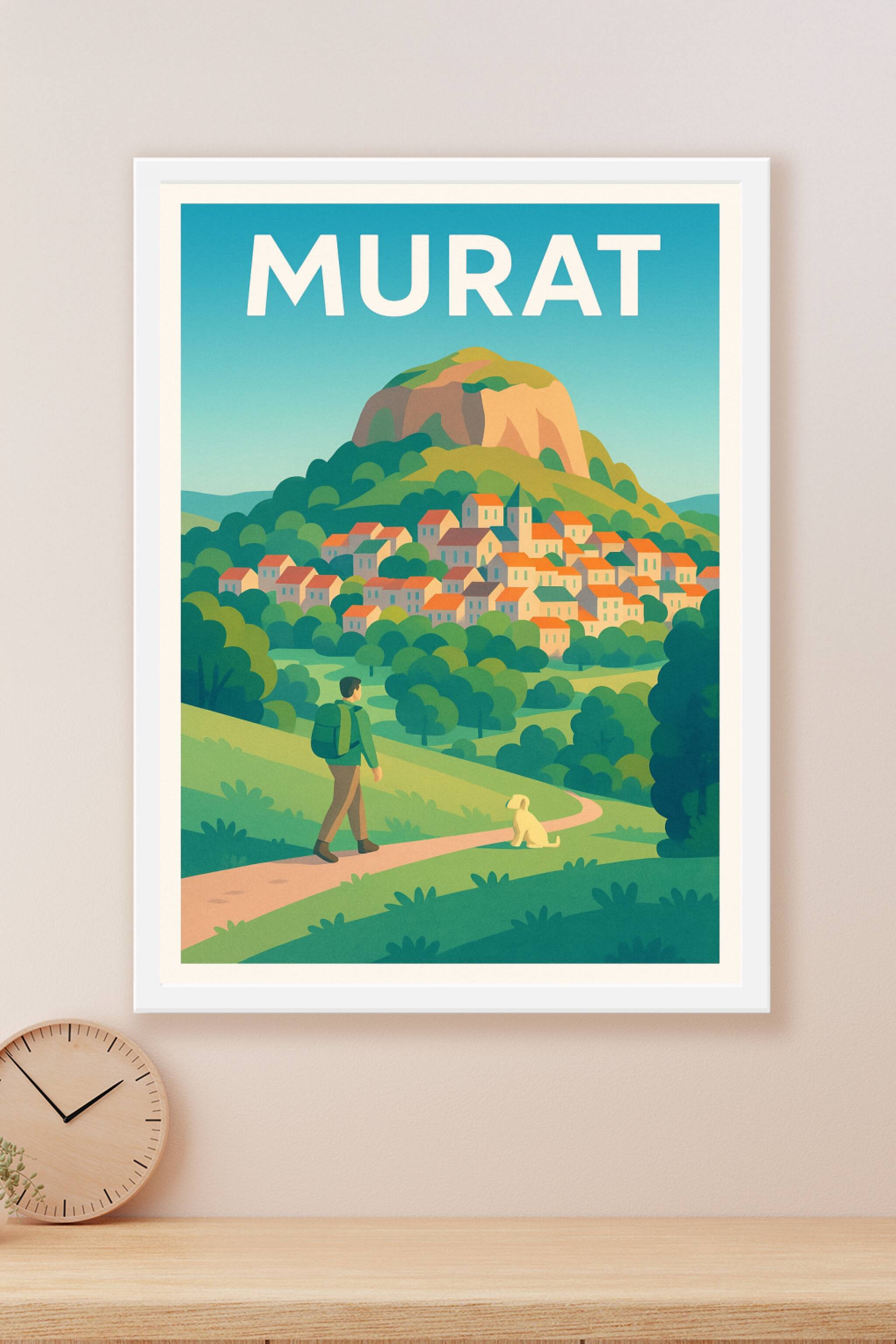 Découvrez la beauté paisible du village de Murat avec cette affiche illustrée au style vintage moderne. Entre collines verdoyantes et toits rouges,...