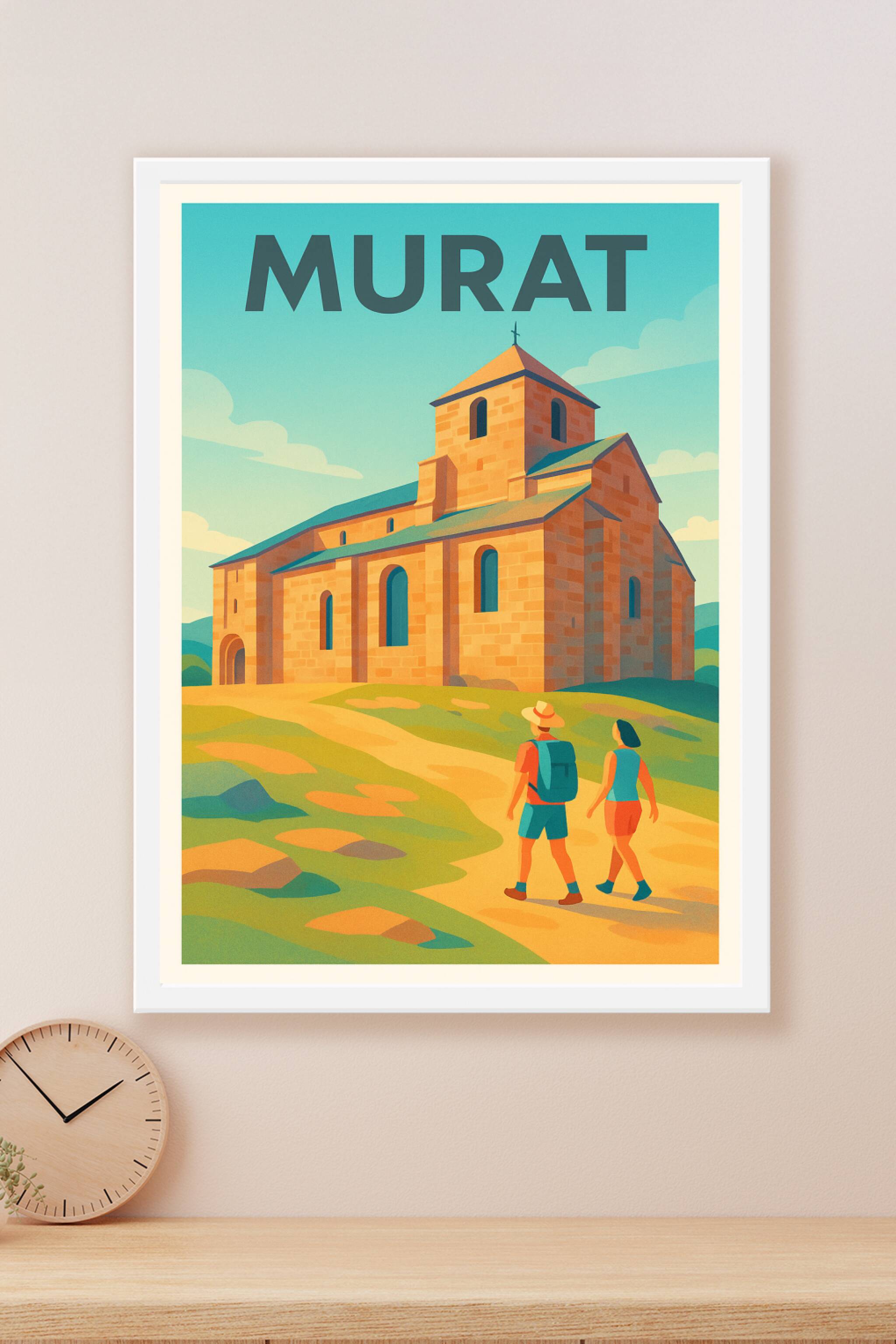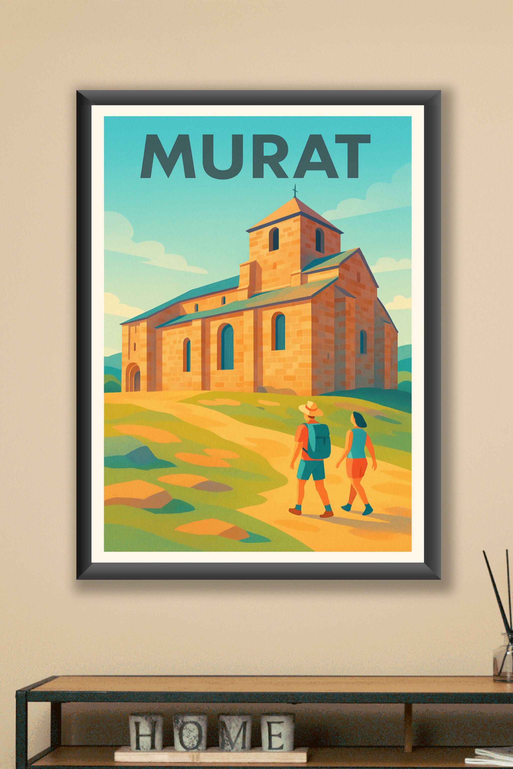 Découvrez l'affiche Murat, une invitation à la balade au pied de cette jolie église romane emblématique d'Auvergne. Ce poster illustré capture la l...