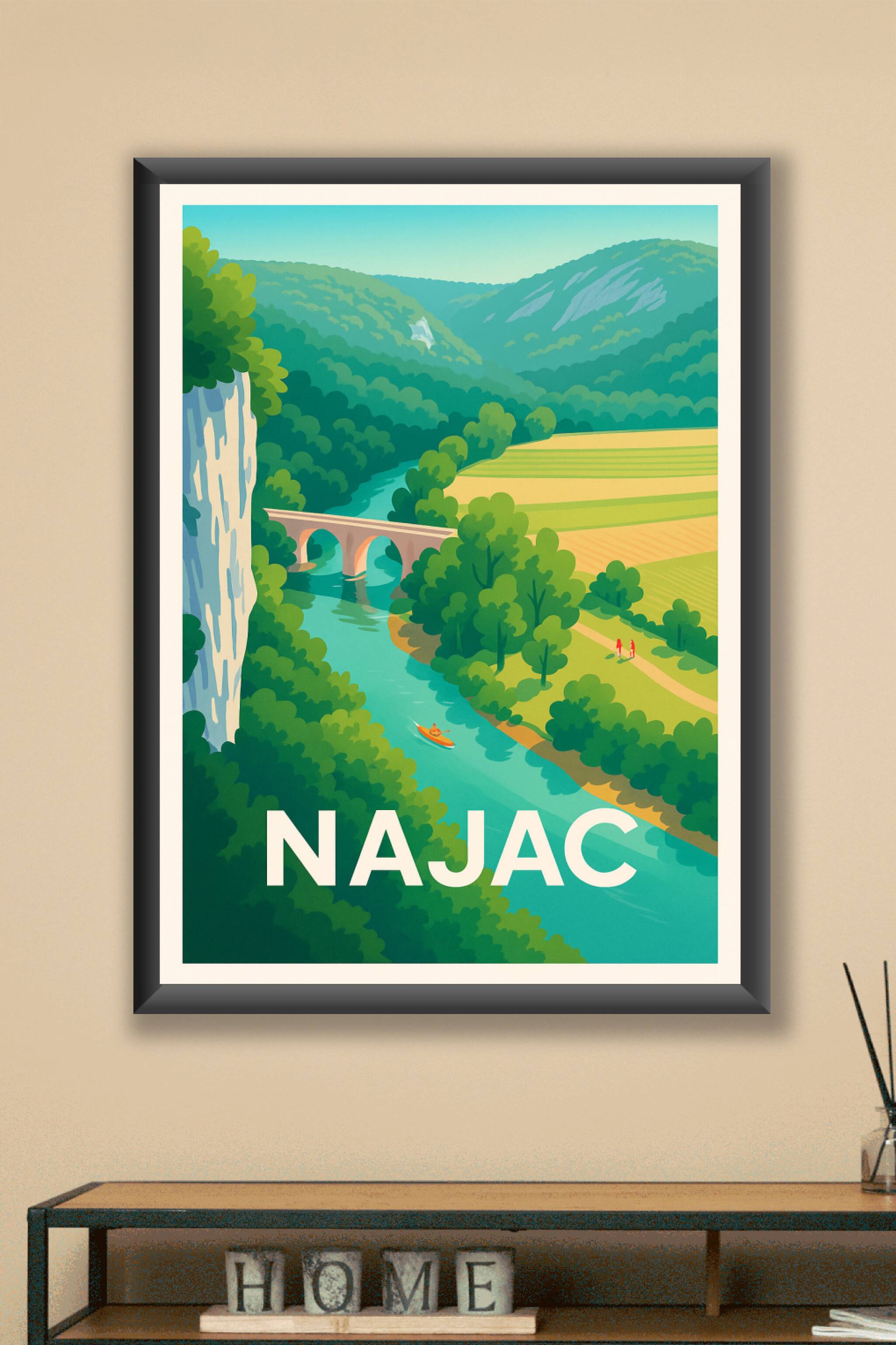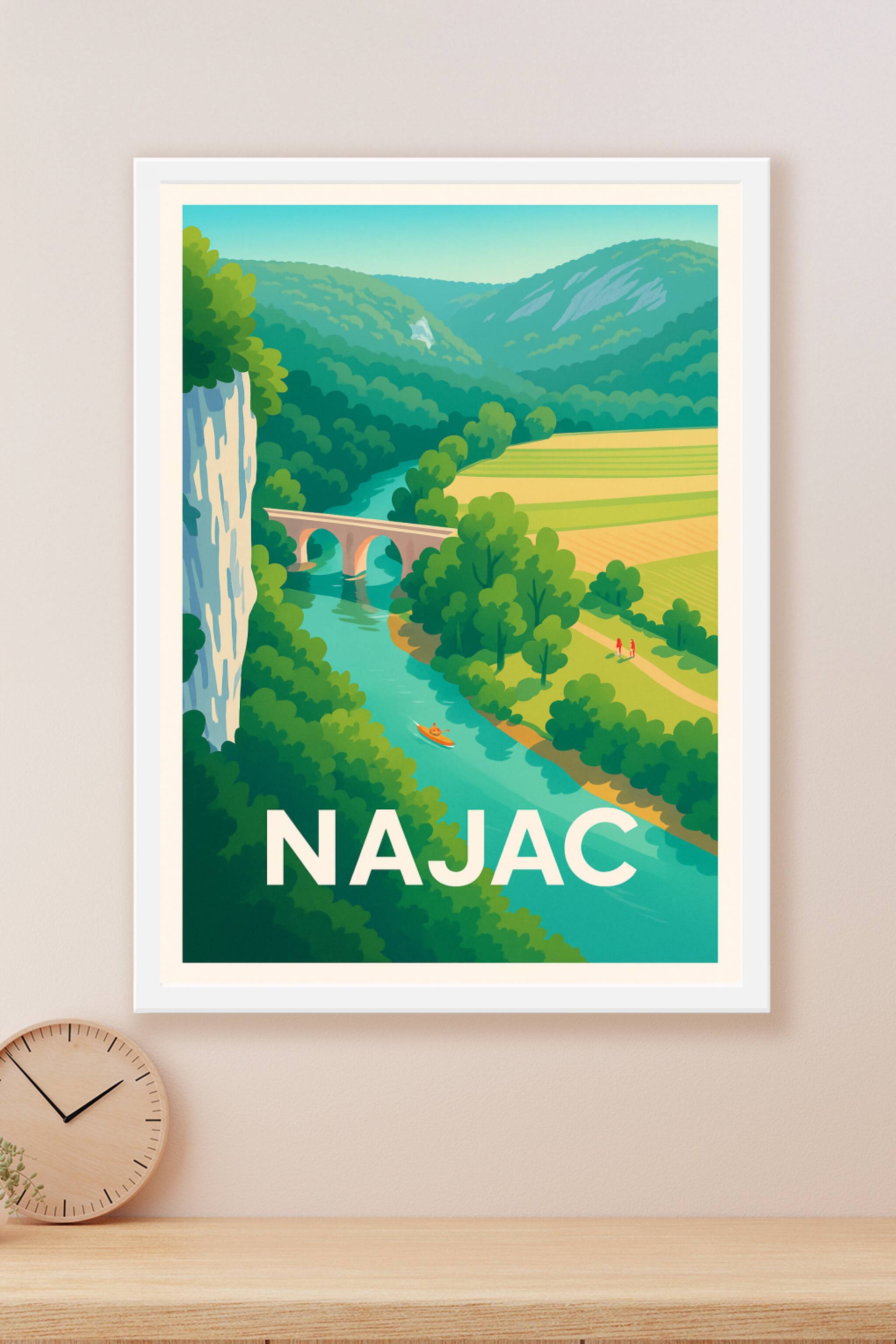 Découvrez la beauté paisible de Najac à travers ce poster illustré qui met en valeur ses paysages verdoyants, sa rivière scintillante et son pont e...