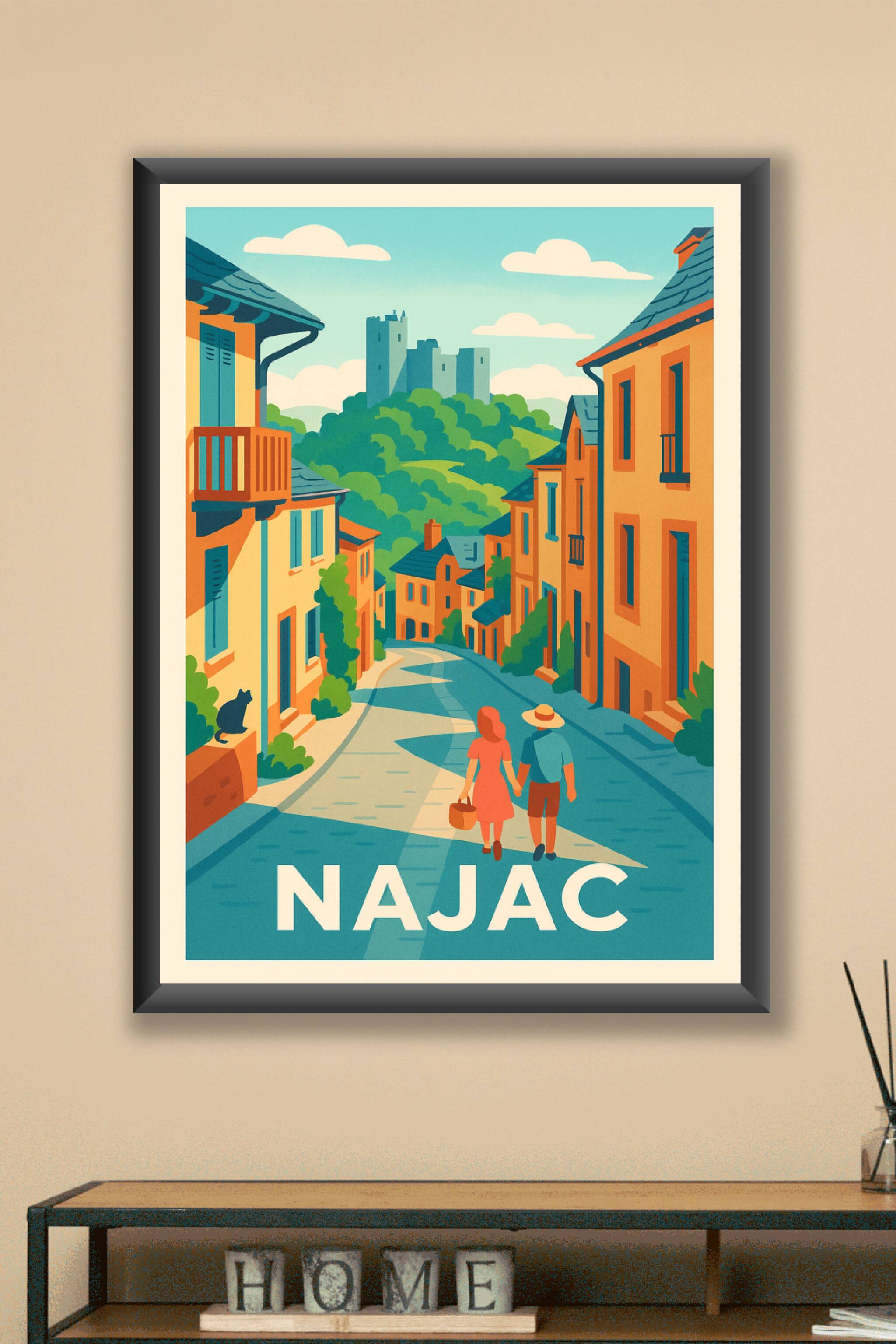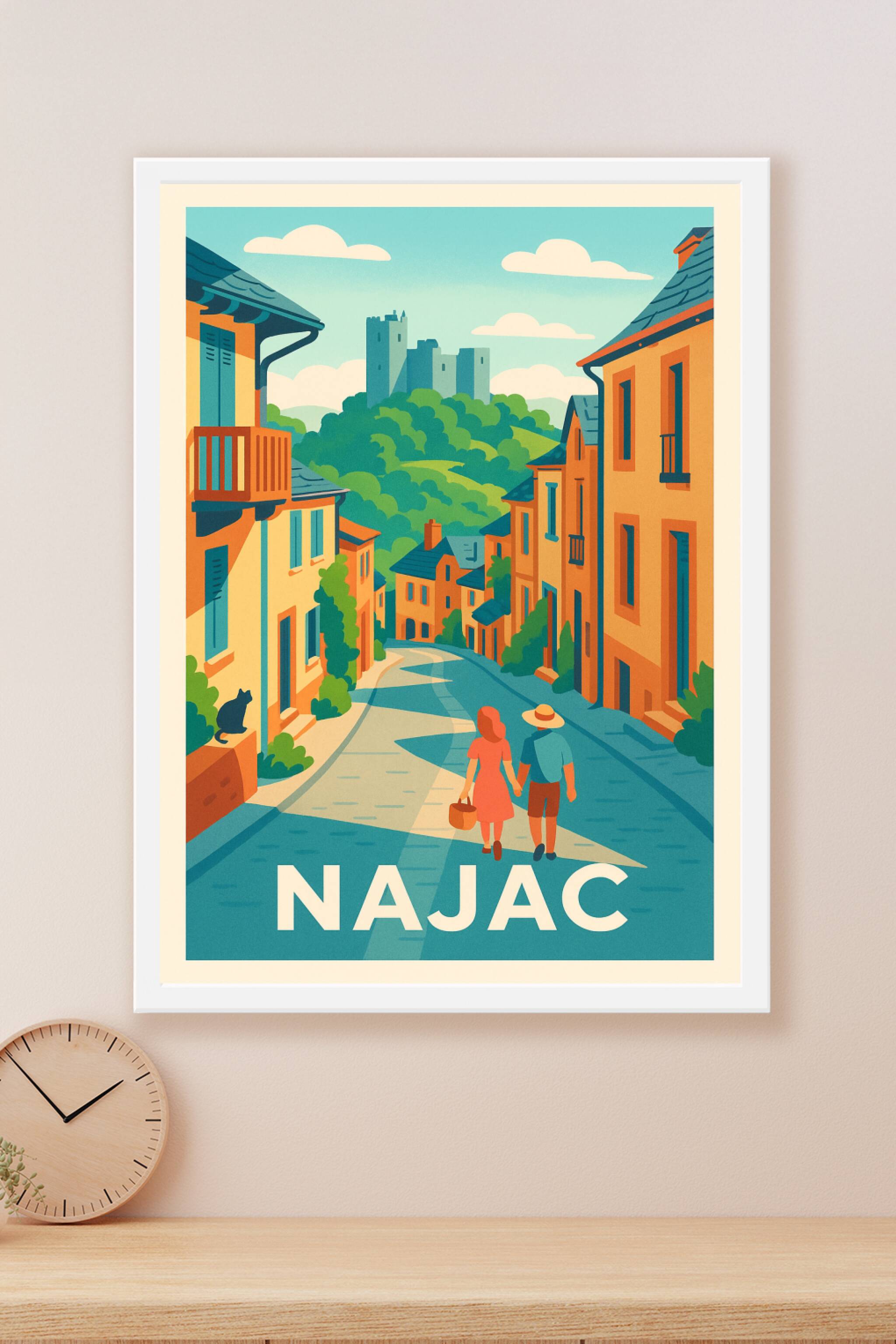 Découvrez le charme intemporel de Najac avec cette affiche illustrée mettant en scène une paisible rue du village bordée de maisons colorées et dom...