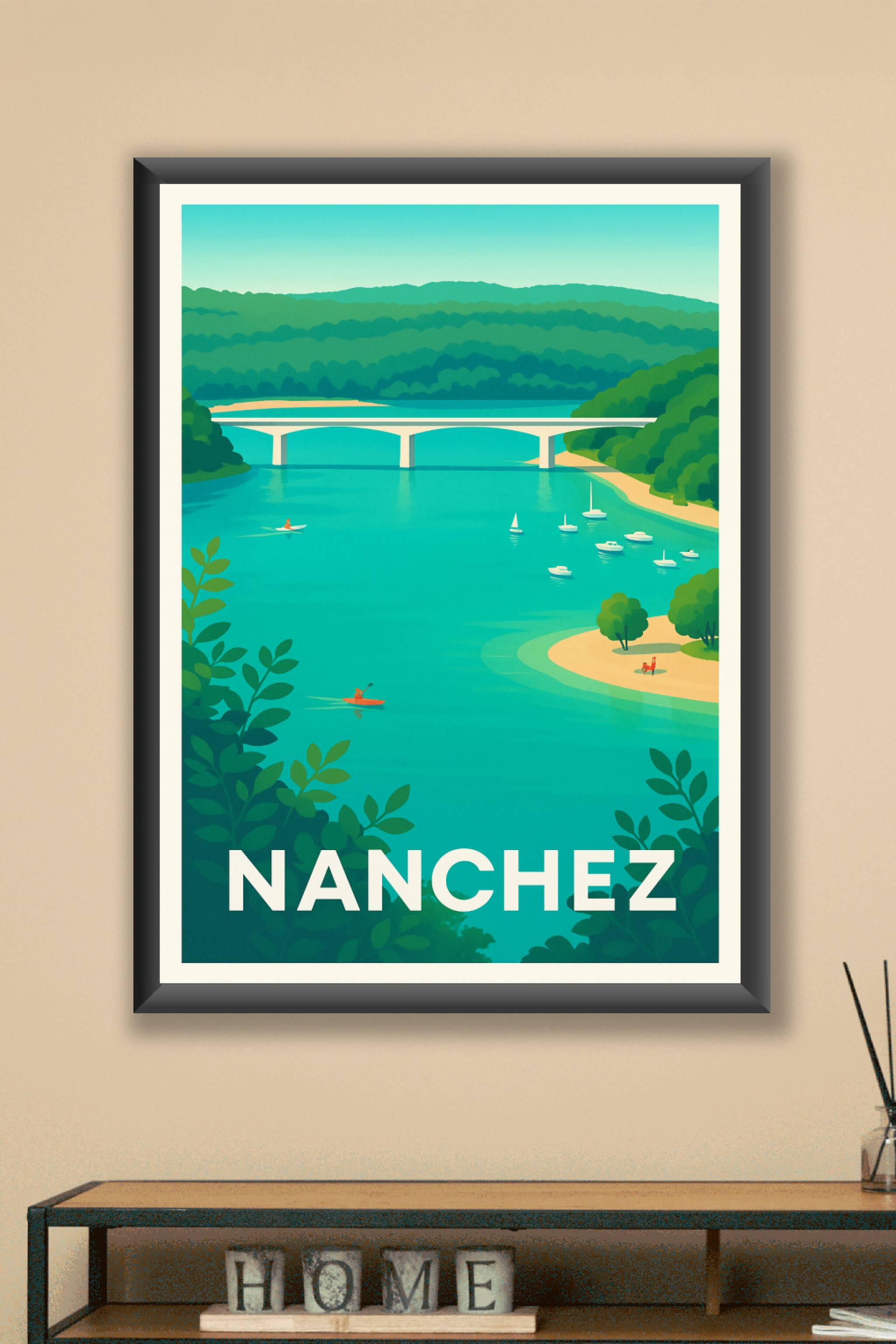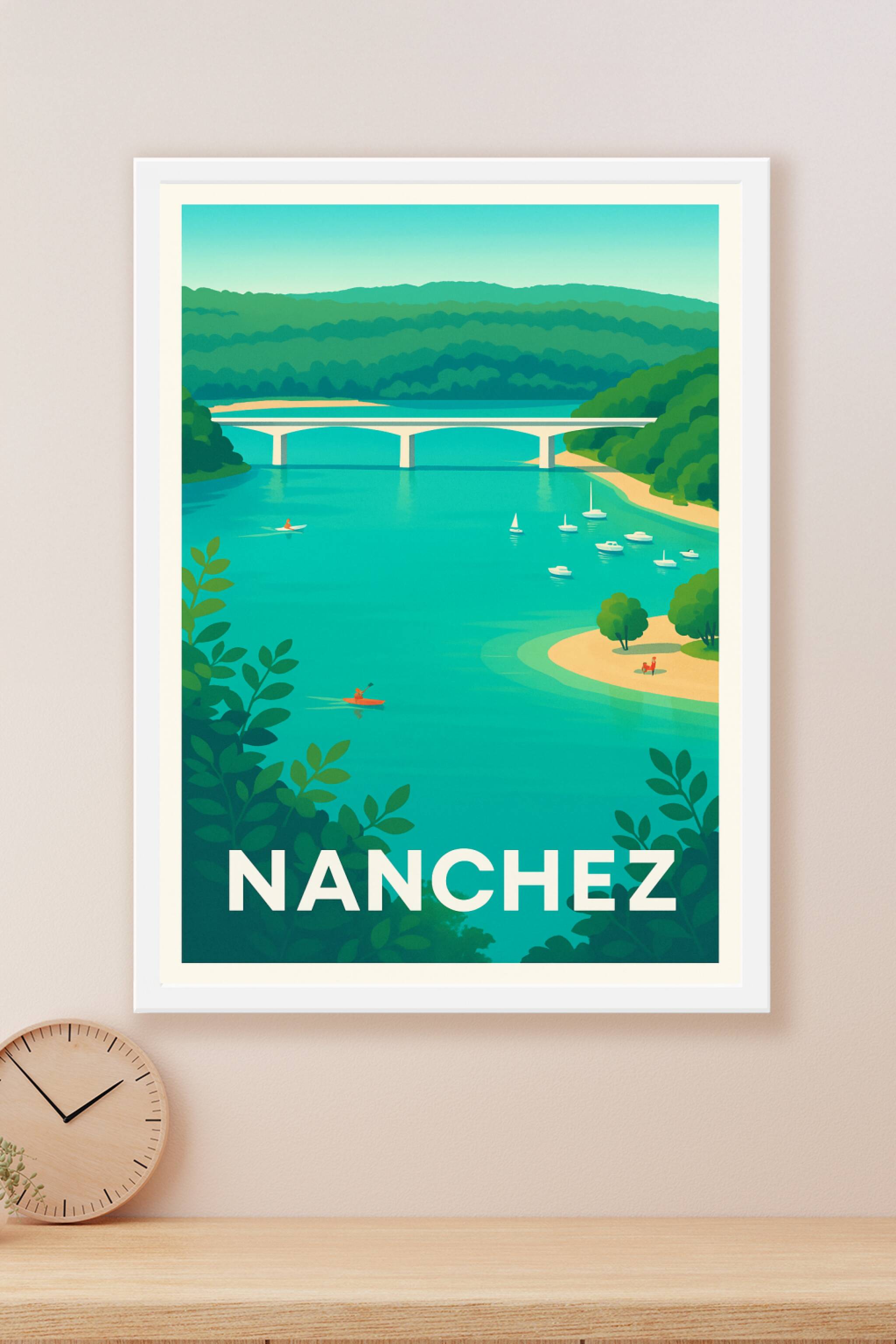 Découvrez la sérénité du paysage aquatique de Nanchez avec cette affiche illustrée offrant une vue apaisante sur les eaux calmes, les petites embar...