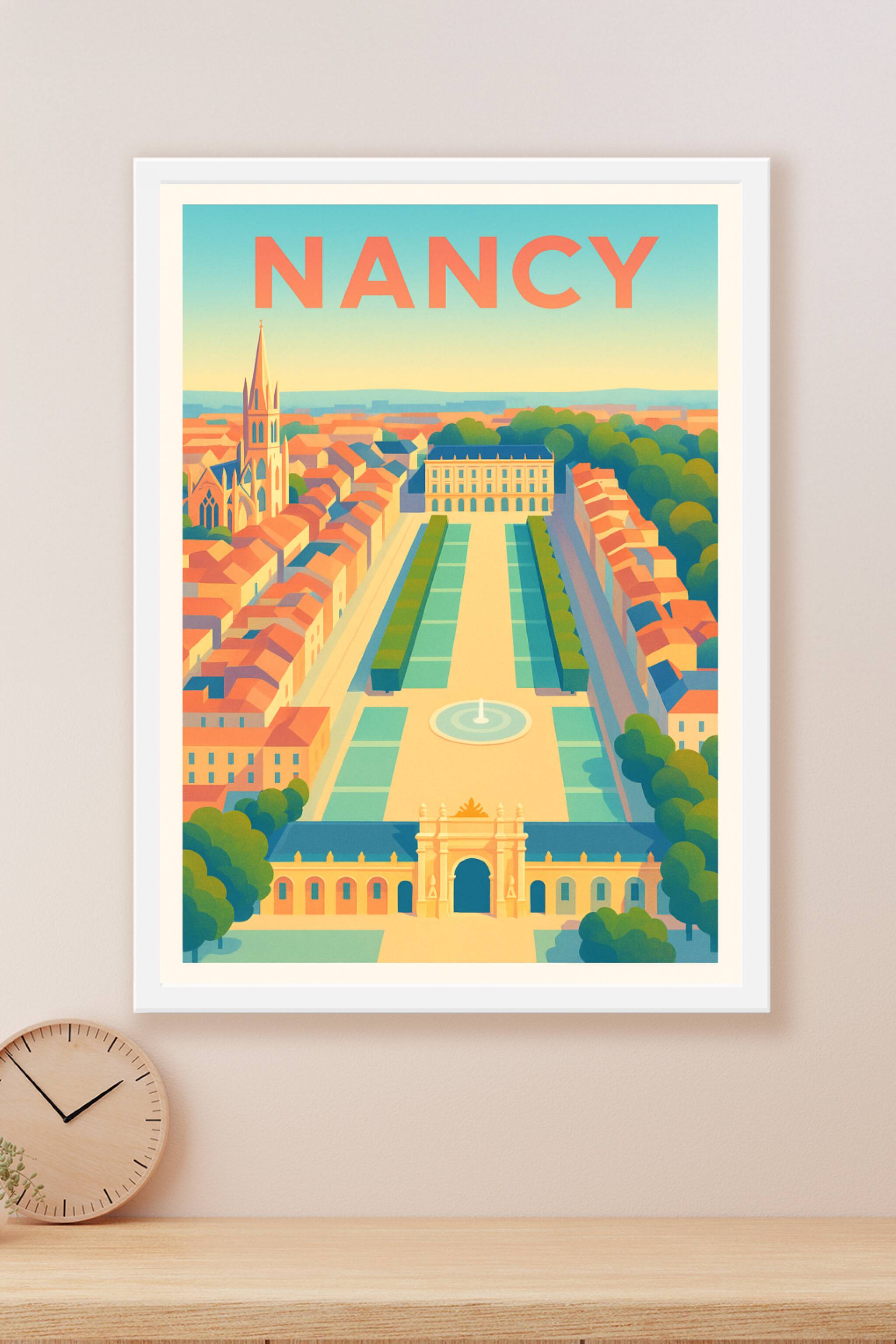 Découvrez cette magnifique affiche illustrant la splendeur architecturale et les jardins ordonnés de Nancy, capturant la douceur d'une journée enso...