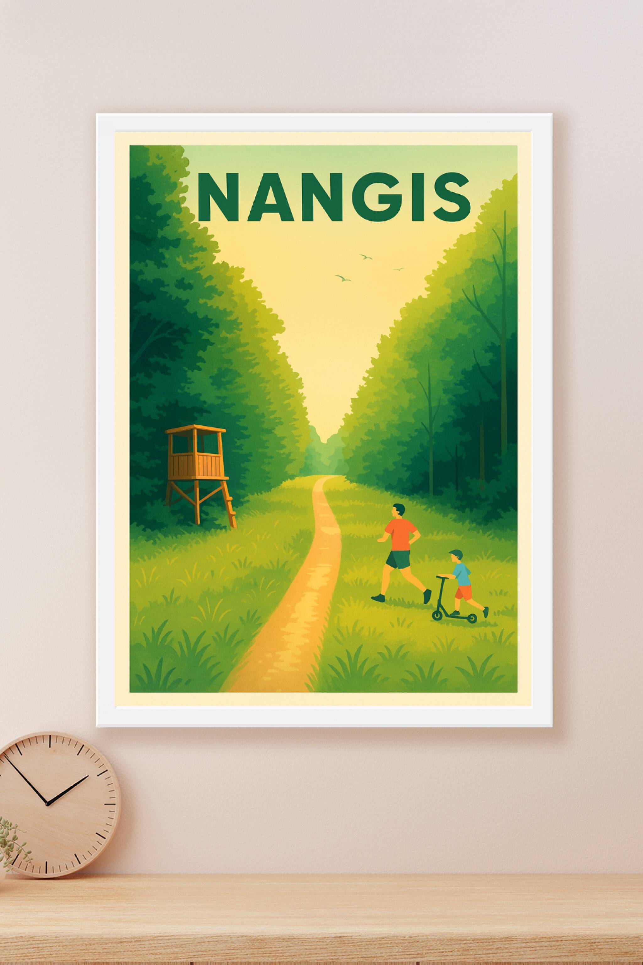 Découvrez l'ambiance paisible et verdoyante de Nangis avec cette affiche illustrée, mettant en scène une promenade en pleine nature entre un adulte...