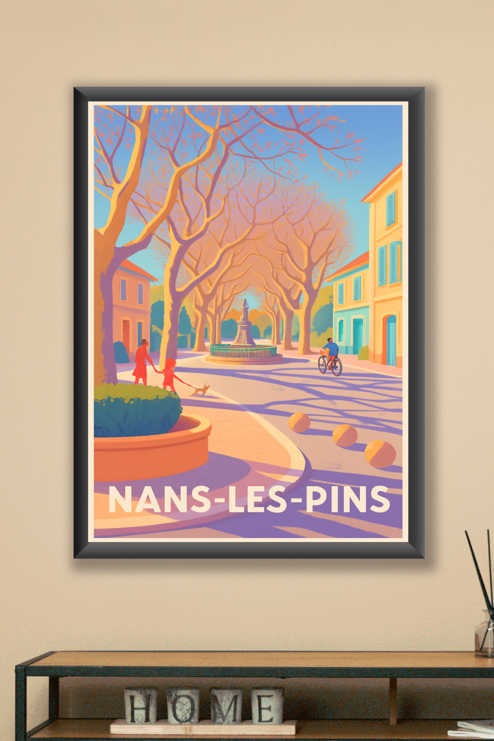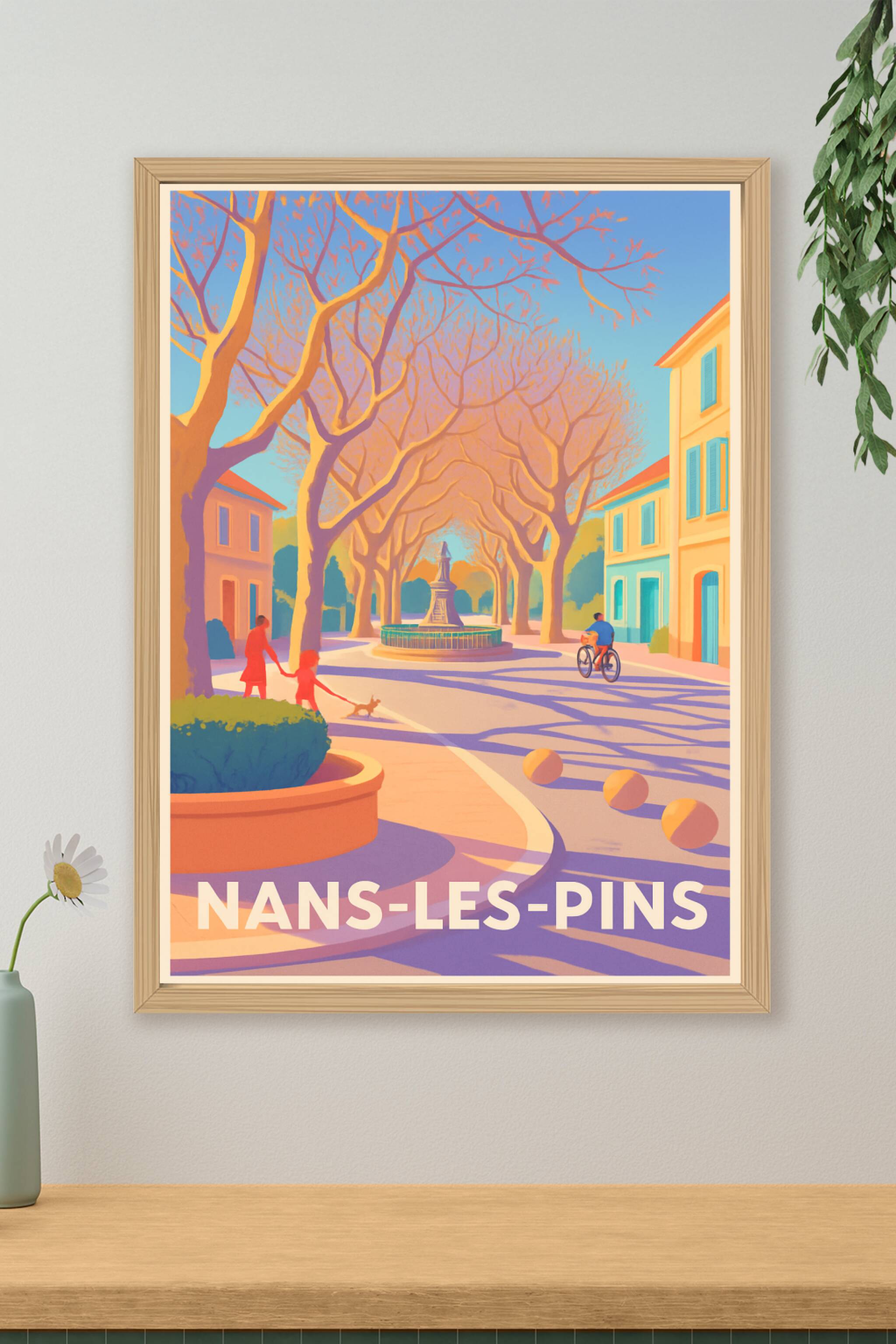 Découvrez l'atmosphère douce et ensoleillée de Nans-les-Pins avec cette affiche illustrée d'une ruelle typique bordée d'arbres majestueux et de mai...