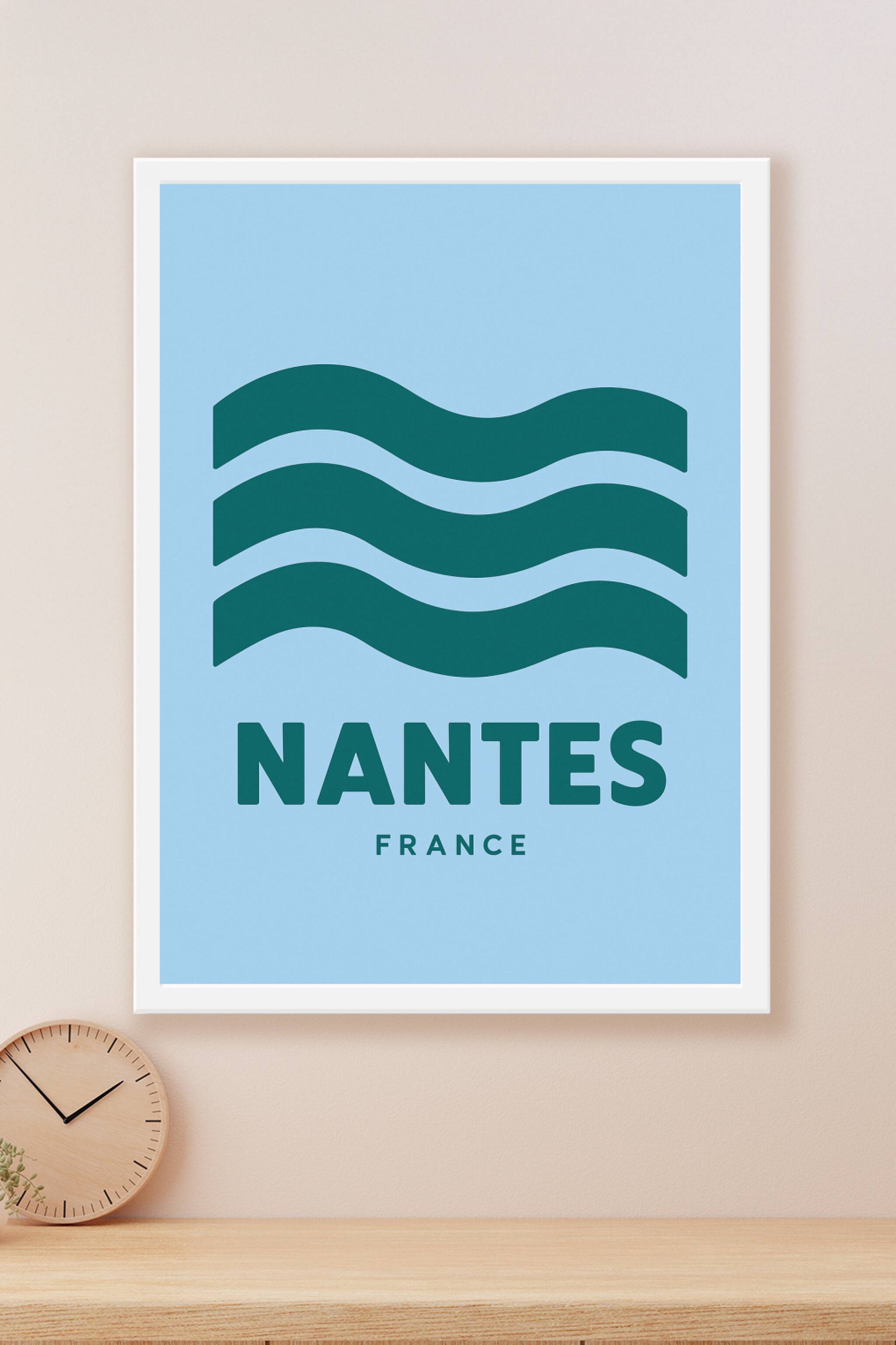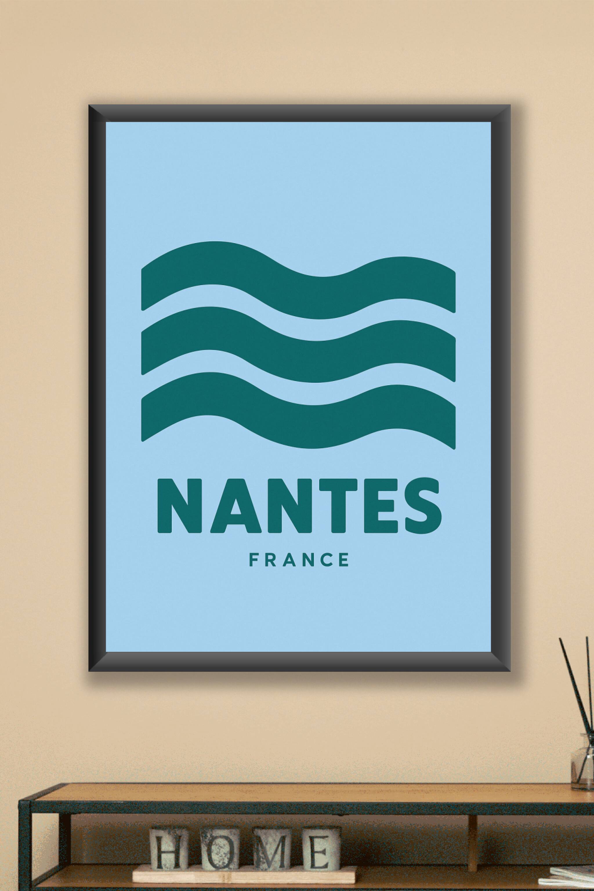 Découvrez cette affiche au design épuré mettant en valeur Nantes avec ses trois lignes ondulées symbolisant ses rivières et son dynamisme. Ce poste...