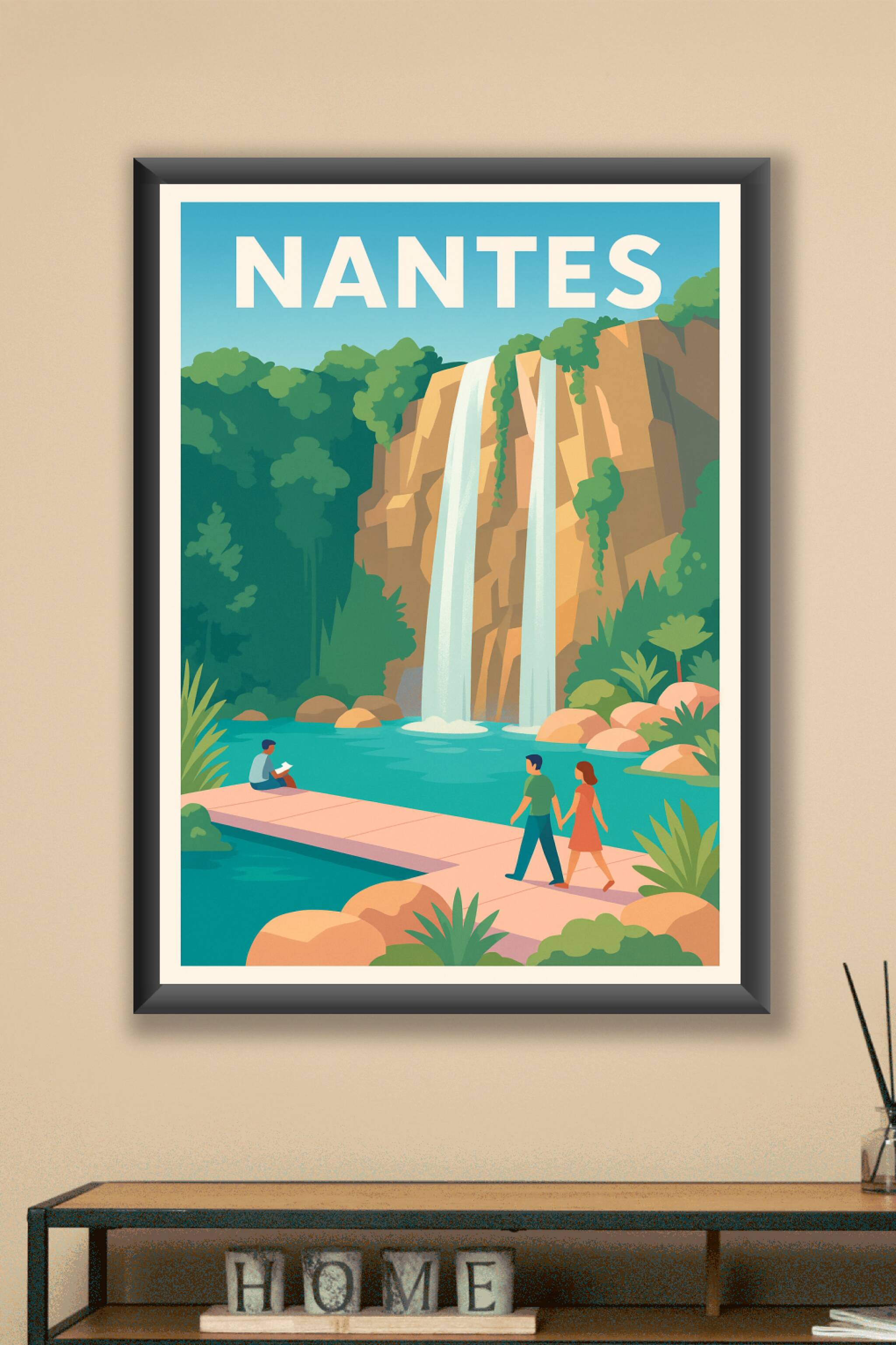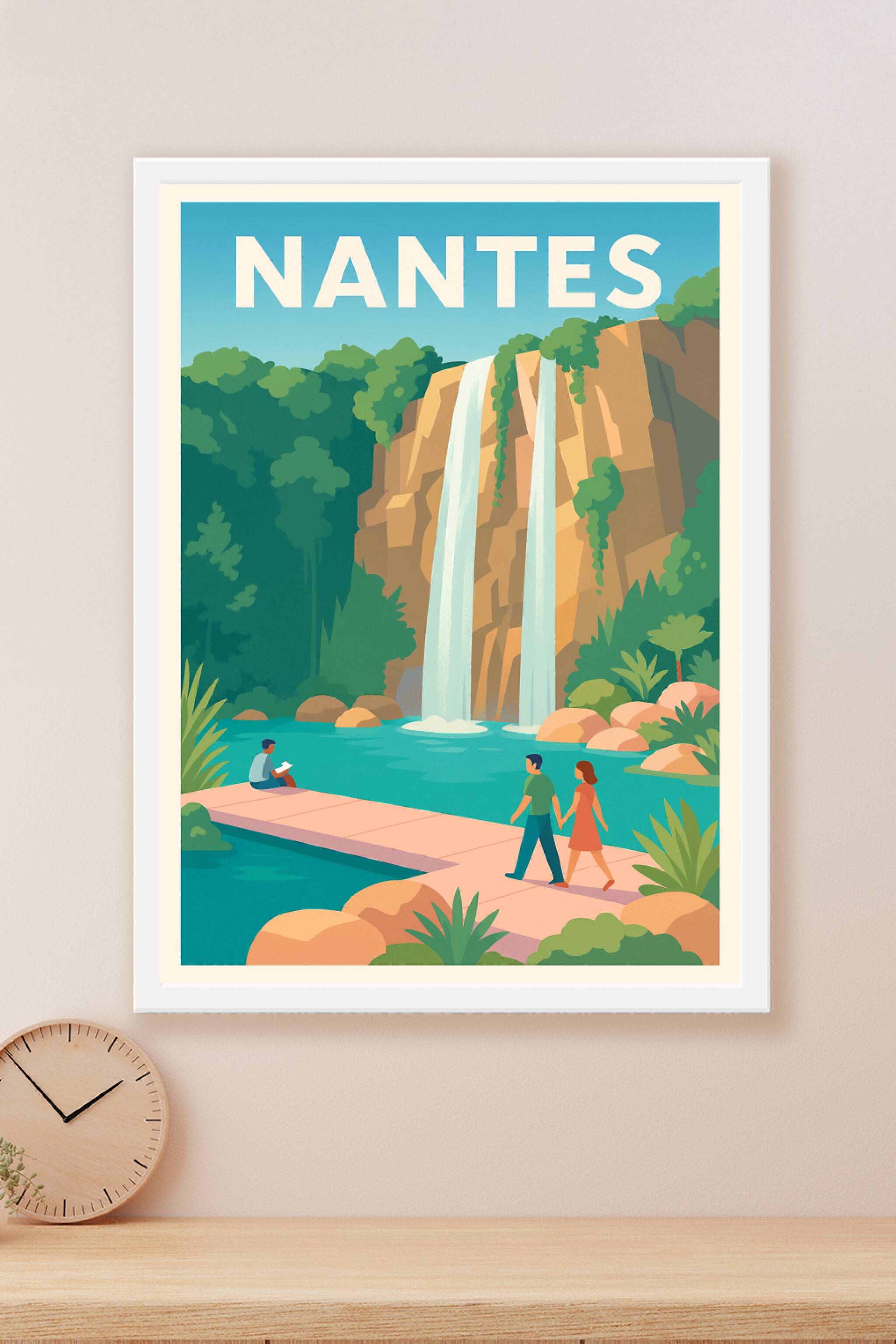 Découvrez l'élégance naturelle de Nantes avec cette affiche illustrée mettant en scène une cascade paisible et un cadre verdoyant, symbole de la ri...