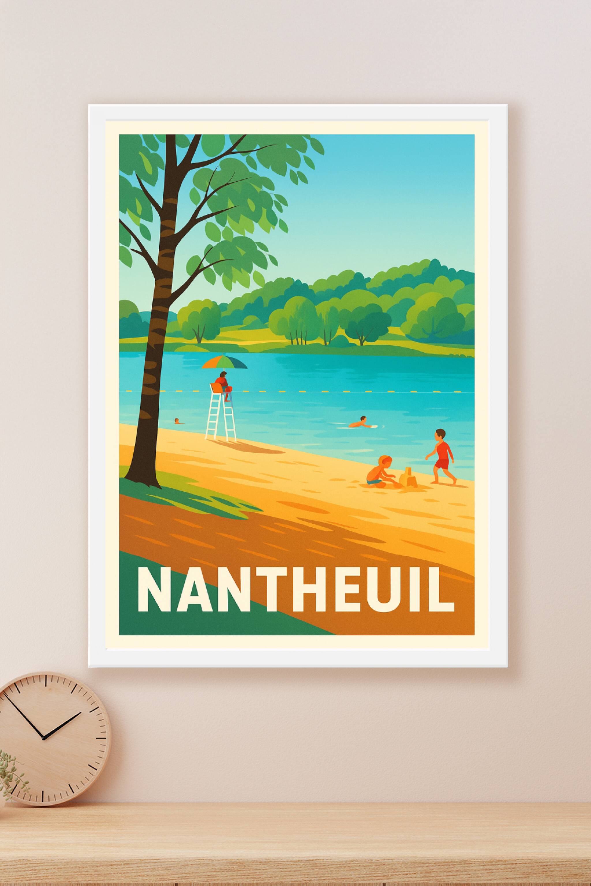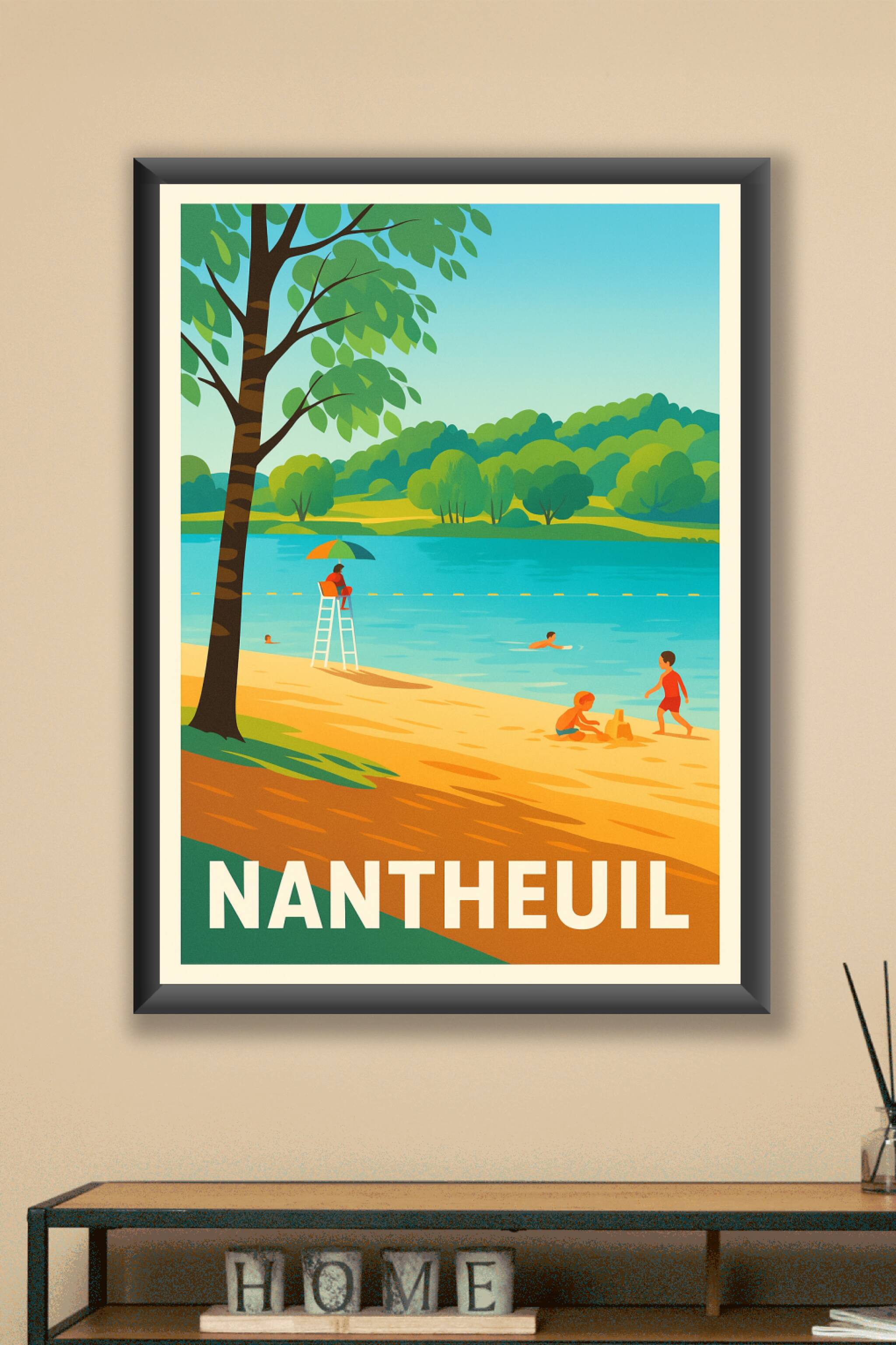 Découvrez la quiétude des longues journées d'été à Nantheuil avec cette affiche au style rétro doux et coloré. Ce poster illustre une plage tranqui...