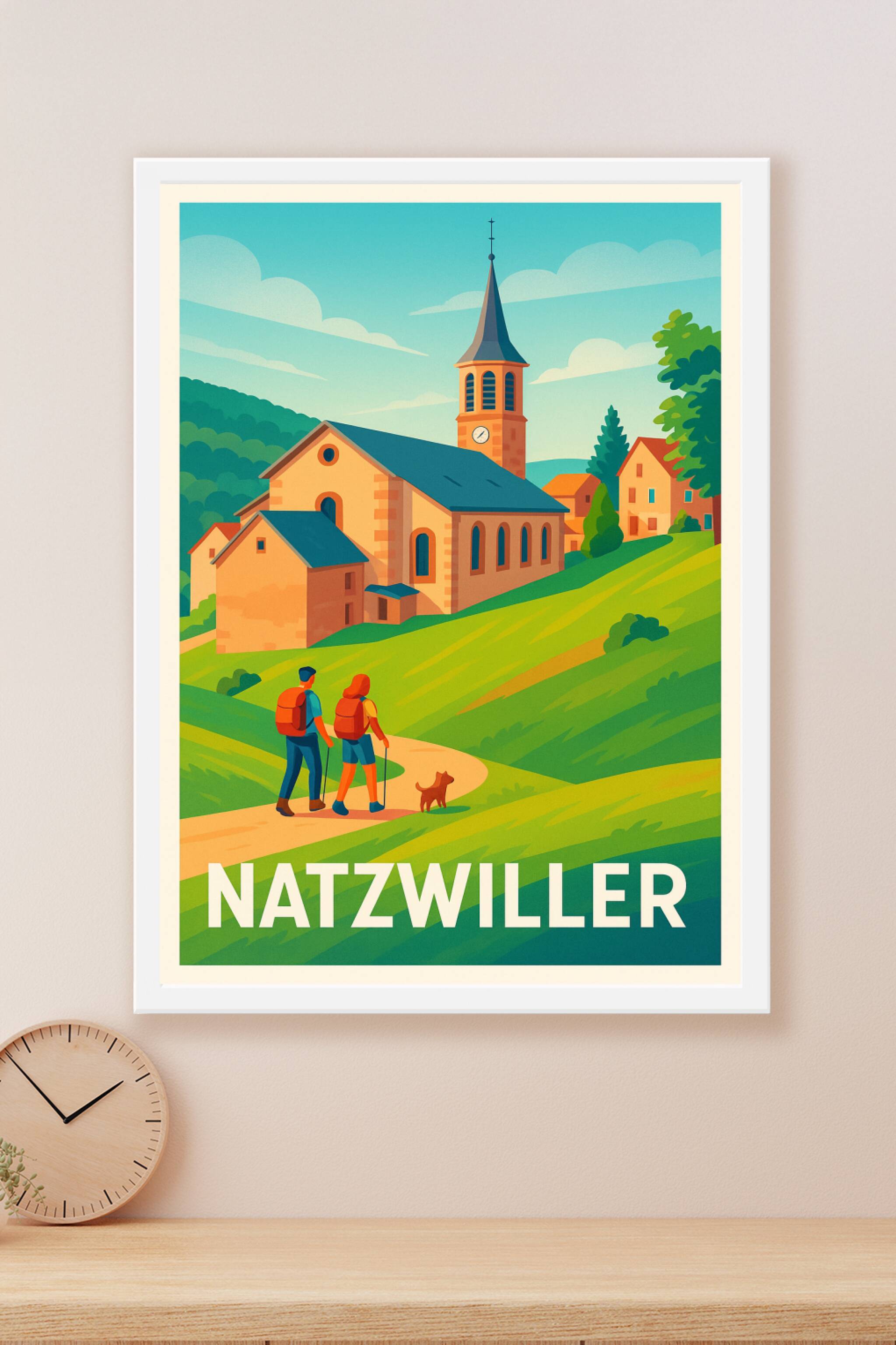 Découvrez la charmante commune de Natzwiller à travers cette affiche au style graphique lumineux et accueillant. Cette scène met en avant le calme ...