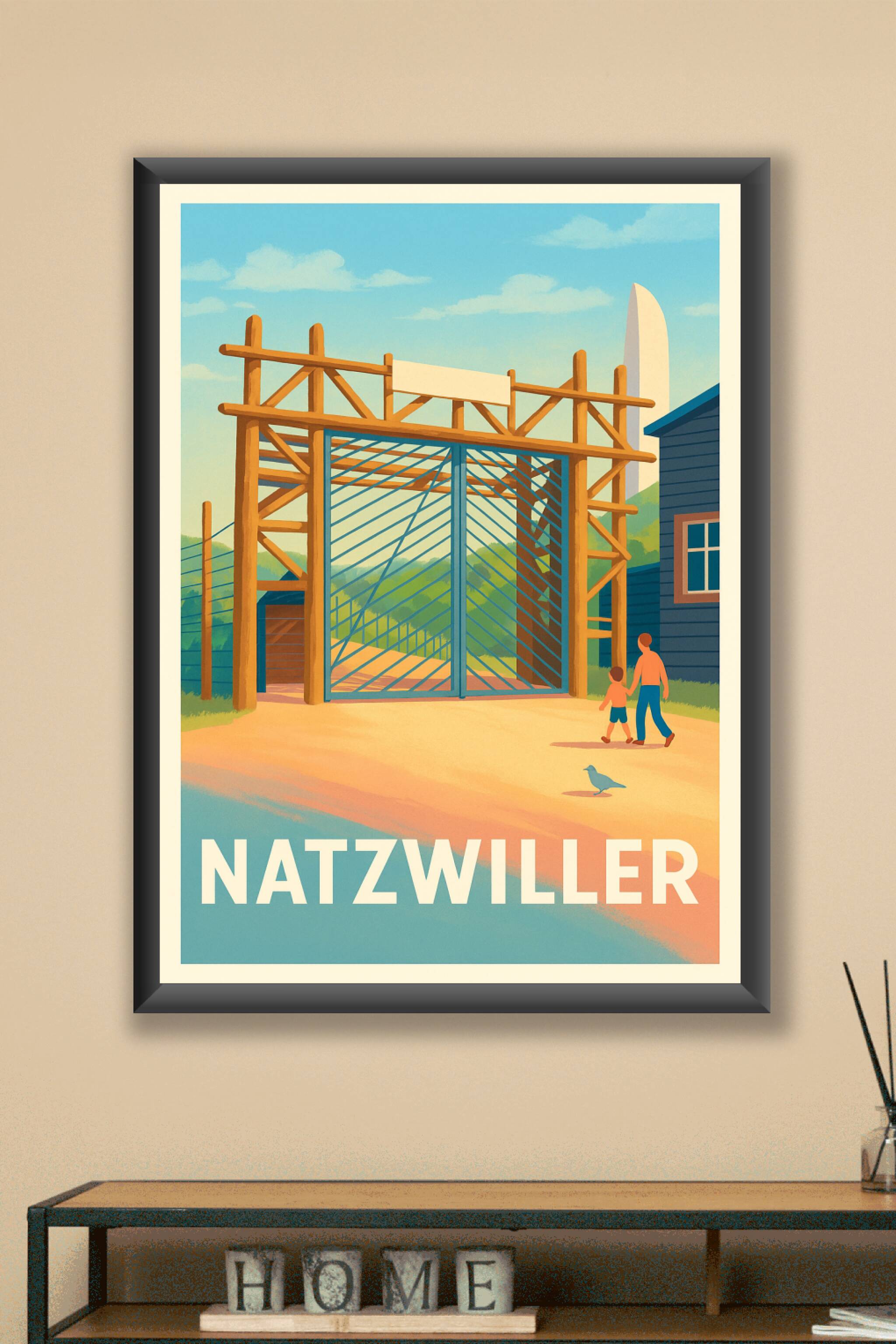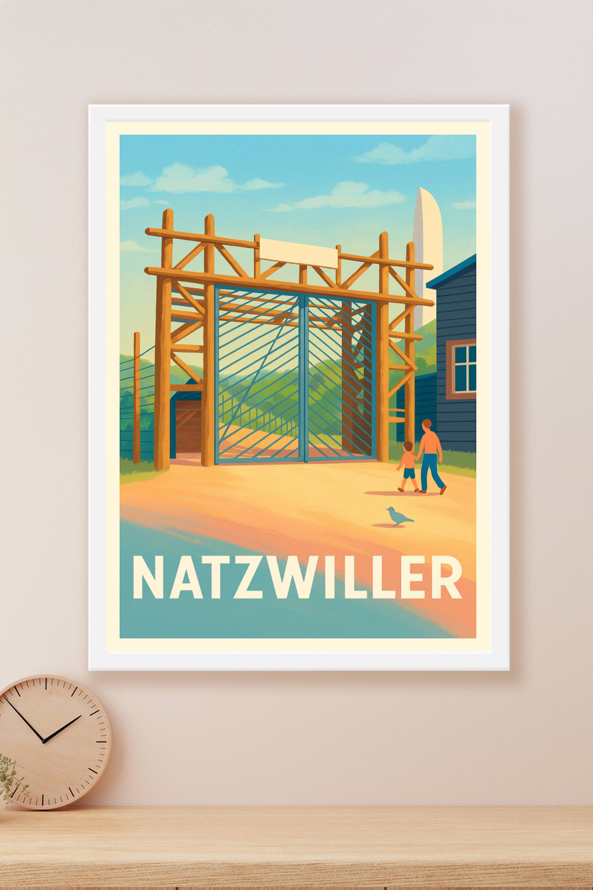 Découvrez cette affiche illustrée évoquant l'entrée historique de Natzwiller, un lieu chargé de mémoire et de symboles. Ce poster au style lumineux...