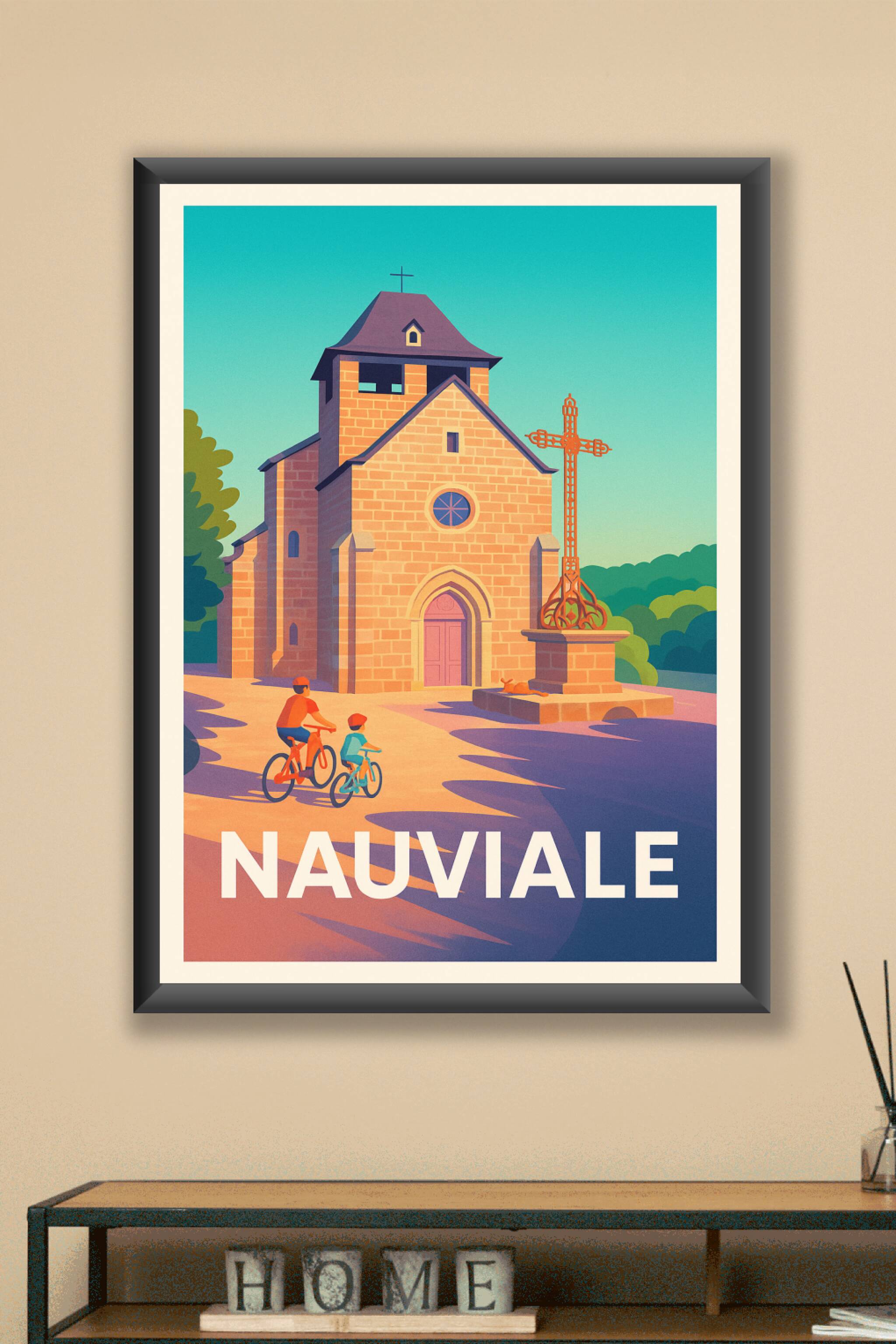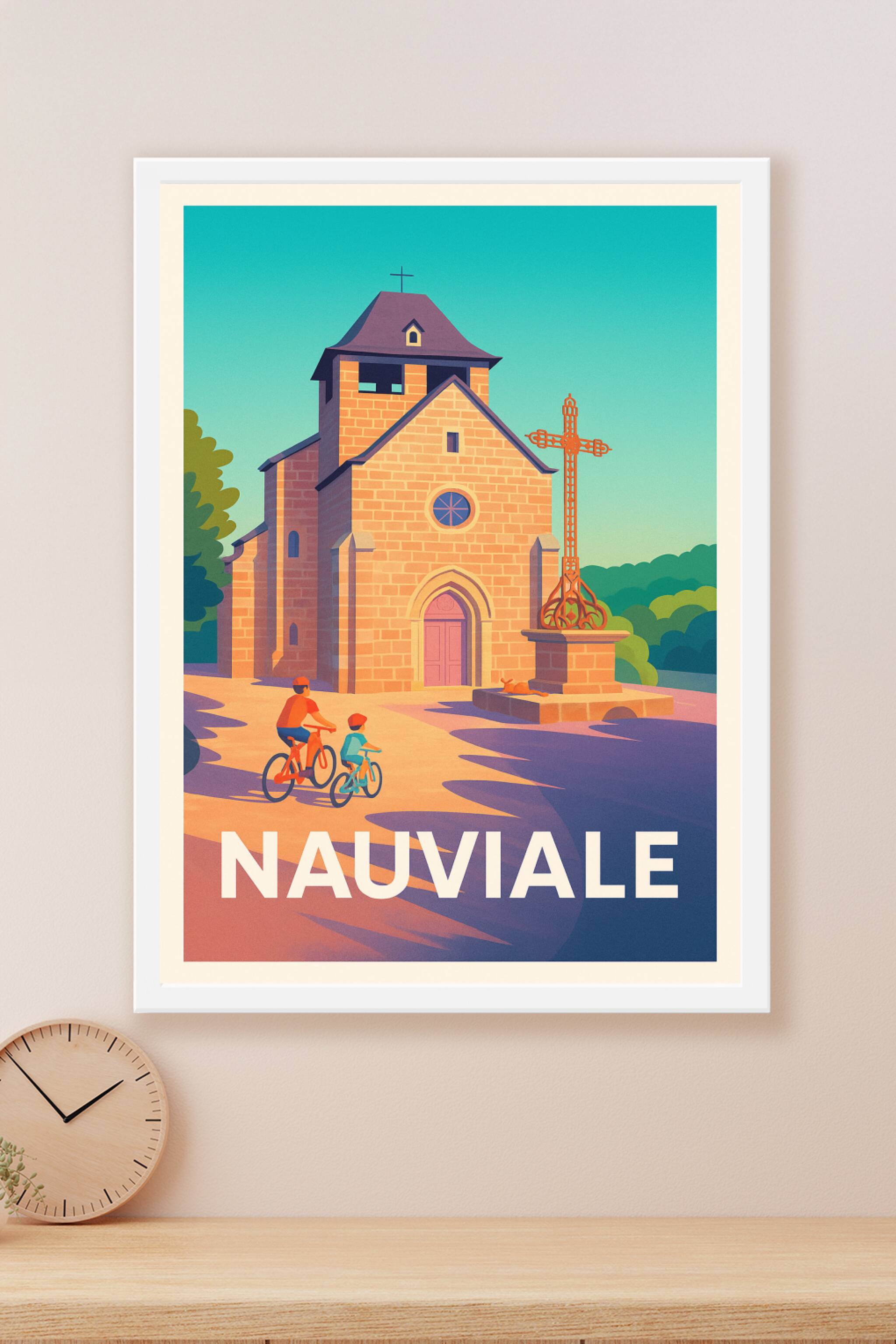 Découvrez la sérénité de Nauviale avec cette affiche illustrée mettant en scène une charmante église en pierre baignée par la lumière douce du soleil et deux cyclistes profitant d'une promenade tranquille. Ce poster, au style rétro et chaleureux, capture l'essence d'un village paisible et authentique. Imprimé en tirage "Fine Art" sur un papier 305g coton haut de gamme, il offre une qualité d'impression exceptionnelle pour sublimer votre décoration intérieure. Disponible en formats A1 à A4, avec ou sans cadre, cette affiche apportera une touche d'élégance et de douceur à votre maison ou fera un cadeau parfait pour les amateurs de paysages pittoresques et de petites villes françaises.