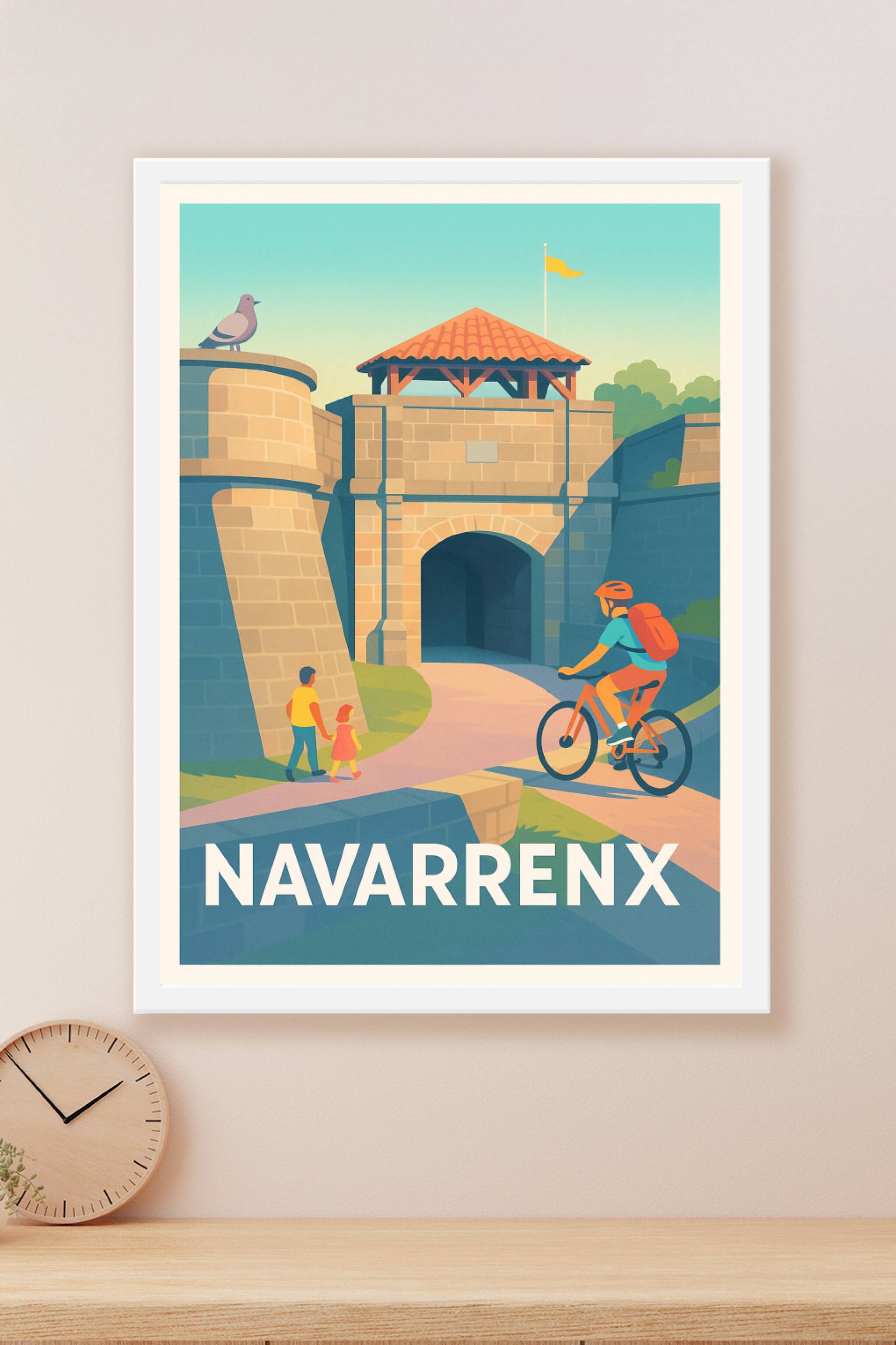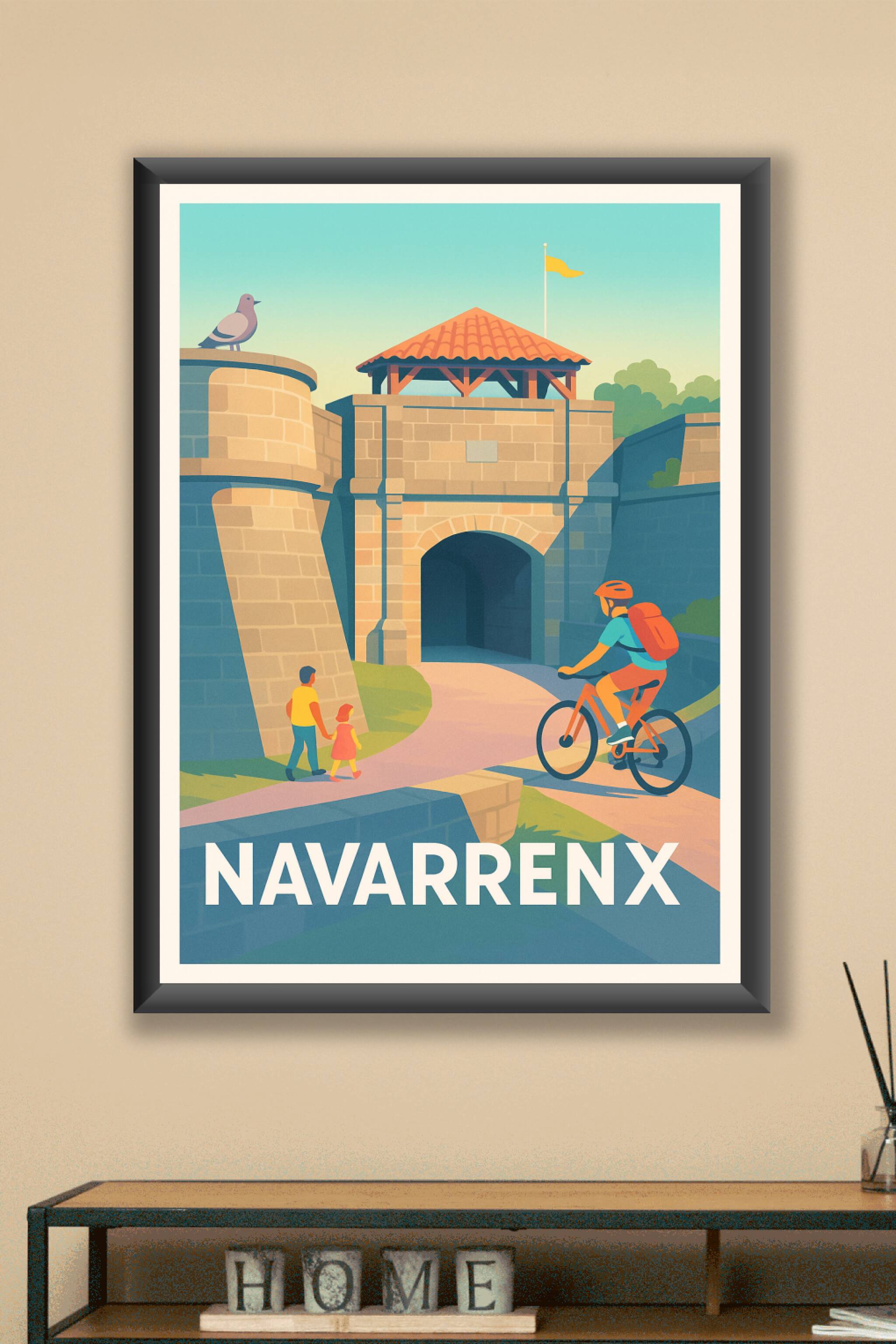 Plongez dans l'atmosphère paisible de Navarrenx, authentique bastide du Béarn à travers cette affiche au style vintage moderne. Le poster illustre la fameuse porte fortifiée, emblème historique, entourée de promeneurs et cyclistes profitant d'un cadre naturel préservé. Imprimée en tirage "Fine Art" sur papier coton 305g, cette affiche garantit une qualité d'impression exceptionnelle pour sublimer votre décoration intérieure. Disponible en formats A1 à A4, avec ou sans cadre, ce poster s'adapte parfaitement à toutes les ambiances, que ce soit dans un salon, un bureau ou une chambre. Offrez-vous ou offrez à un proche ce souvenir élégant et intemporel de Navarrenx, imprimé avec soin en France.