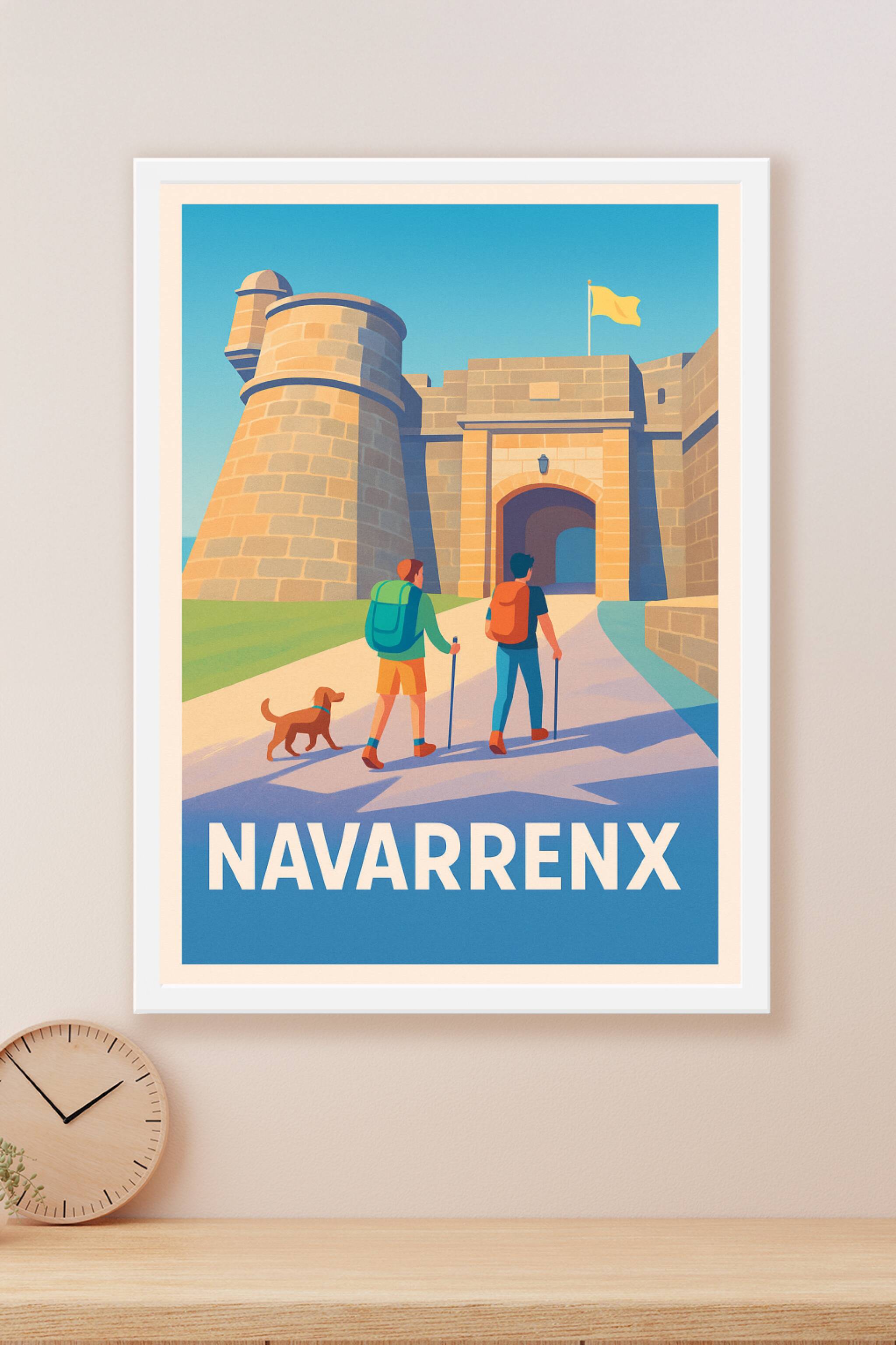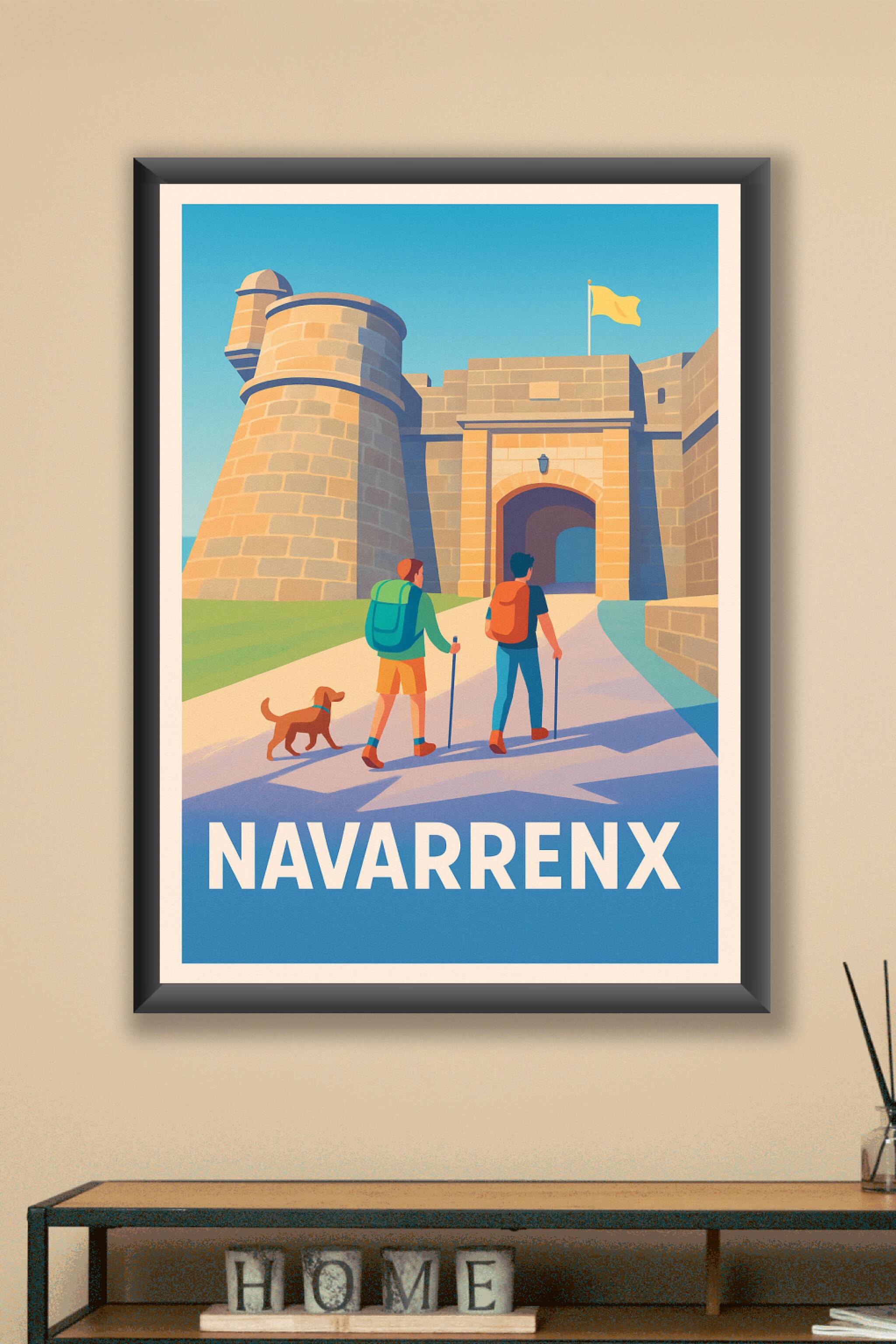 Découvrez l'atmosphère unique de Navarrenx avec cette affiche illustrée mettant en avant ses fortifications emblématiques et l'esprit de randonnée ...