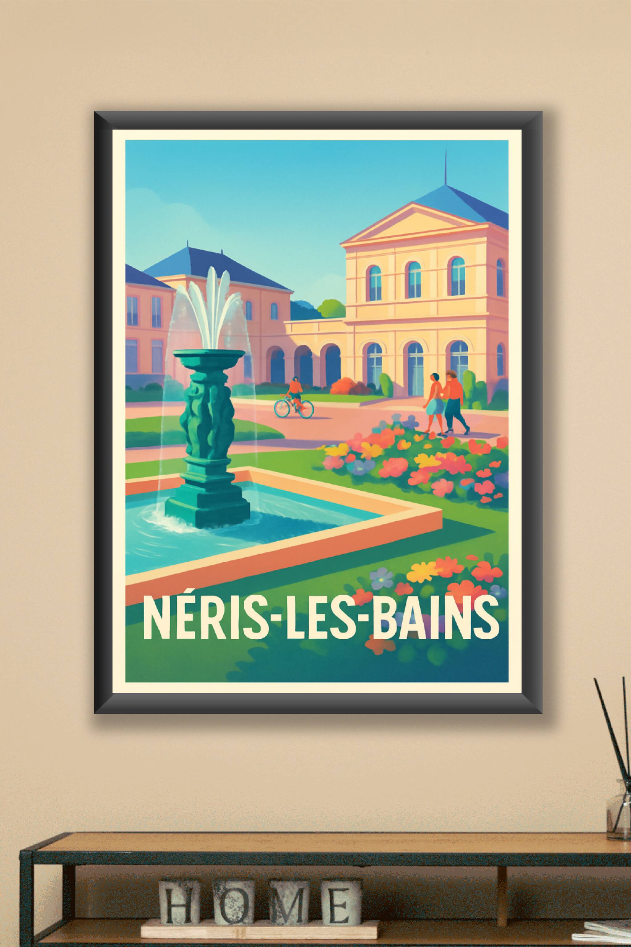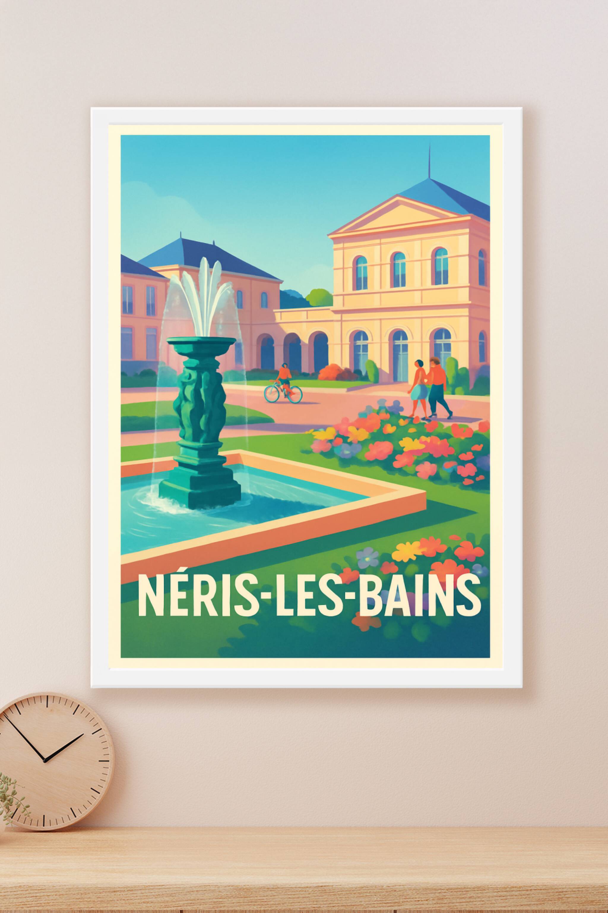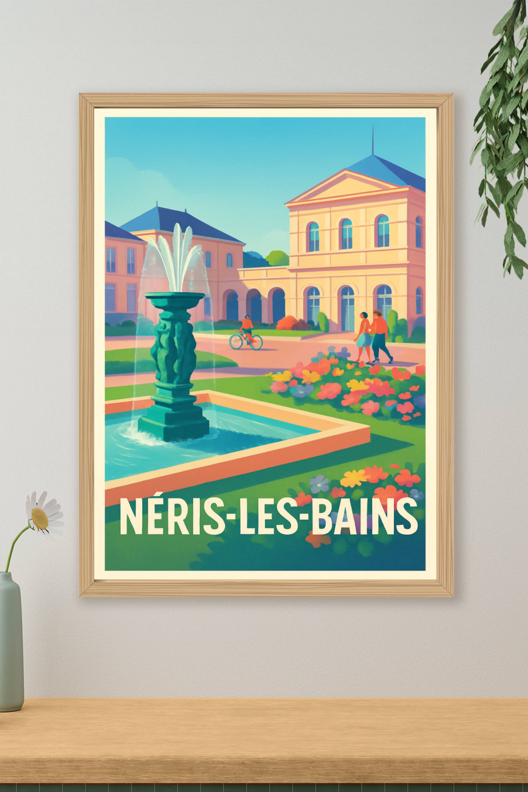 Découvrez la douceur de vivre à Néris-les-Bains avec cette affiche illustrée mettant en valeur l'élégance et la tranquillité de ses thermes et jard...