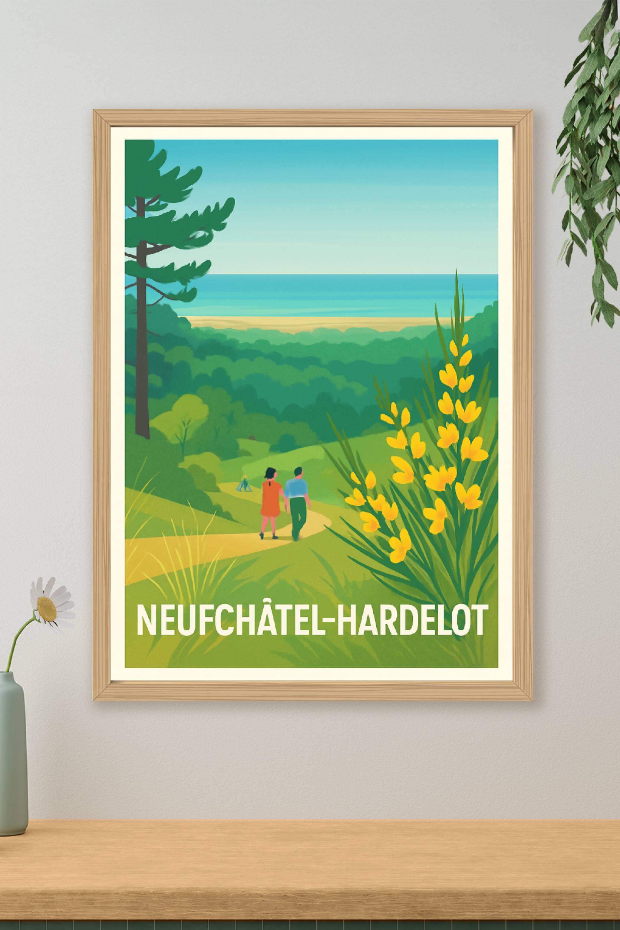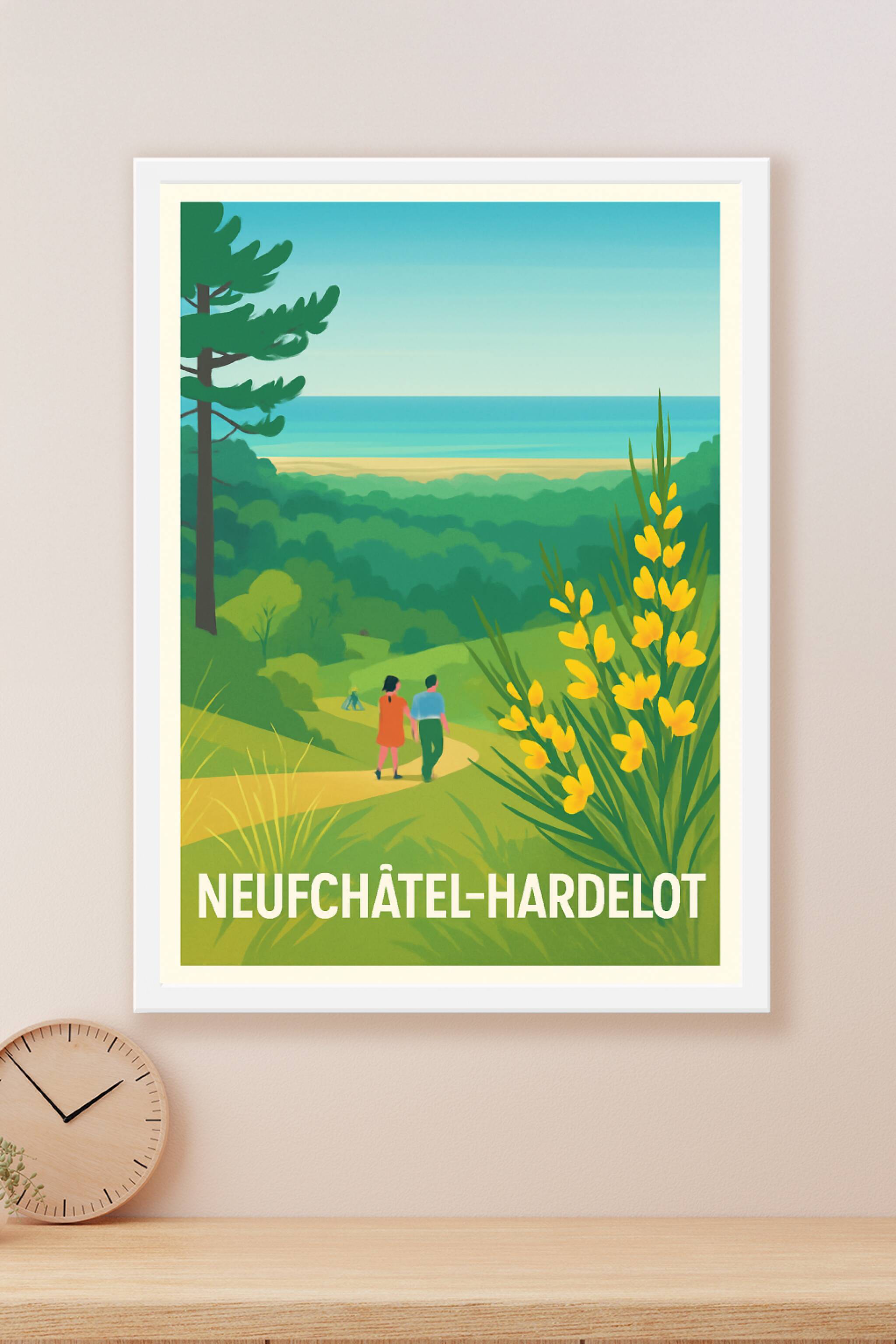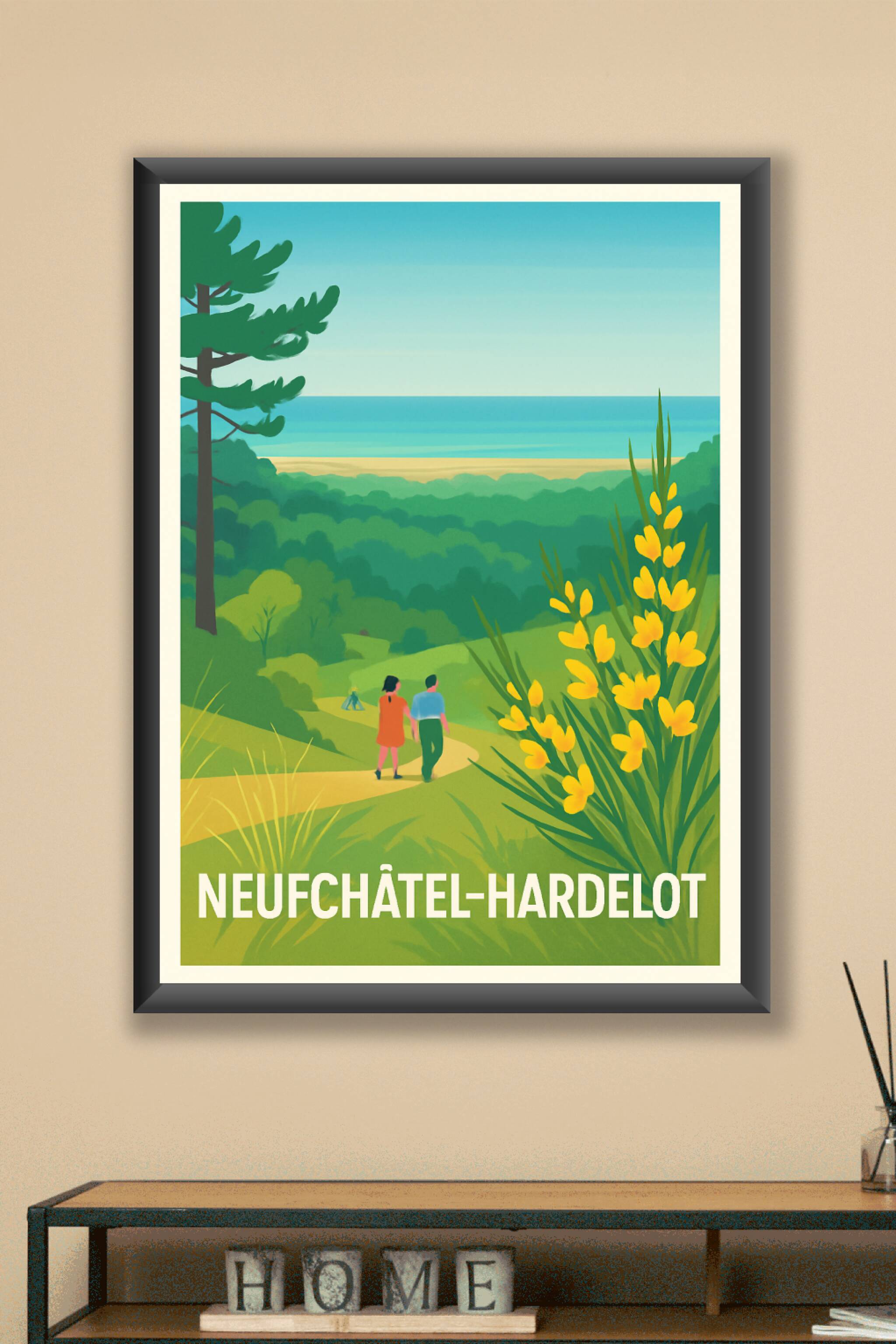 Découvrez la sérénité de Neufchâtel-Hardelot à travers cette affiche au style illustratif, mettant en scène un couple se promenant sur un sentier v...