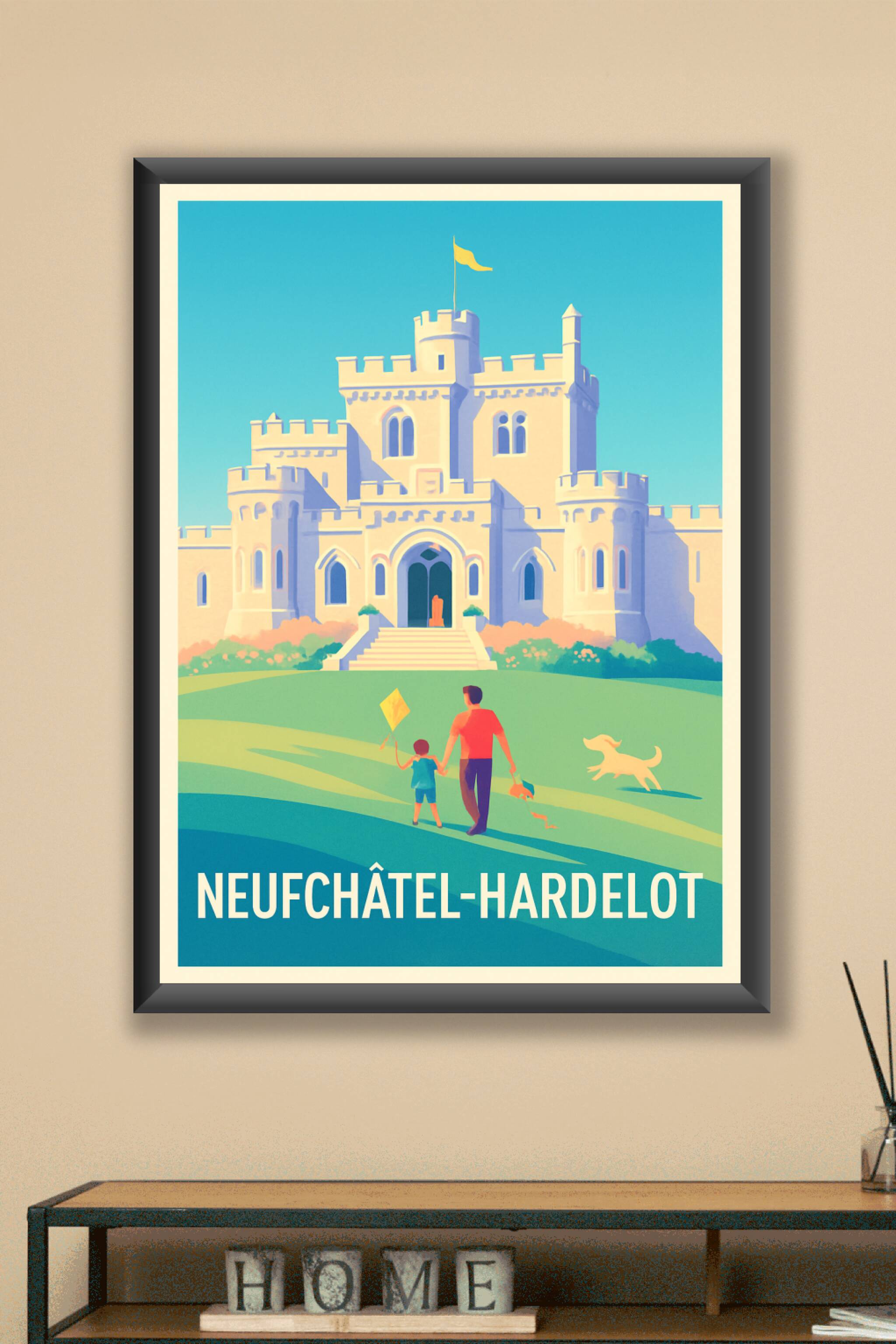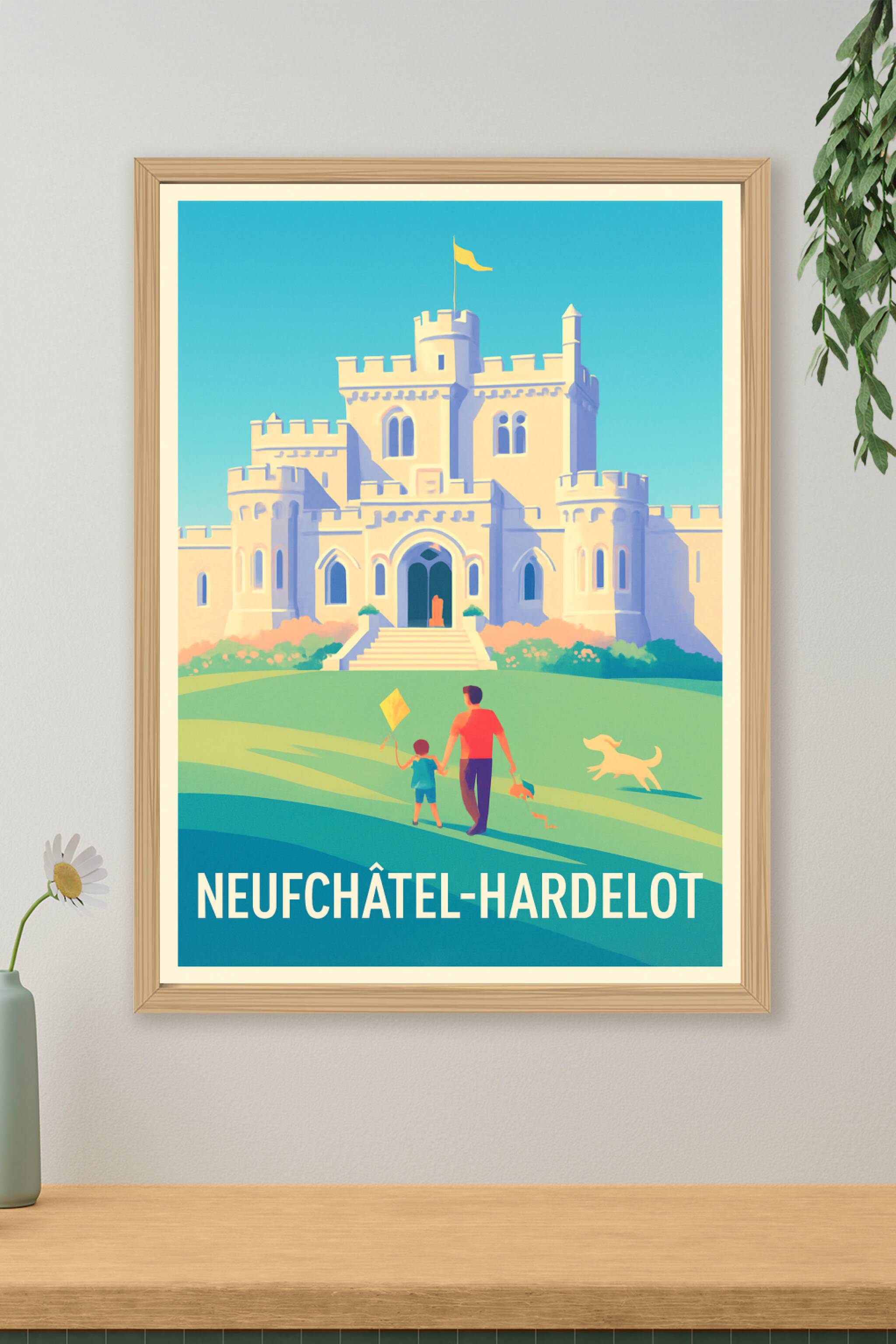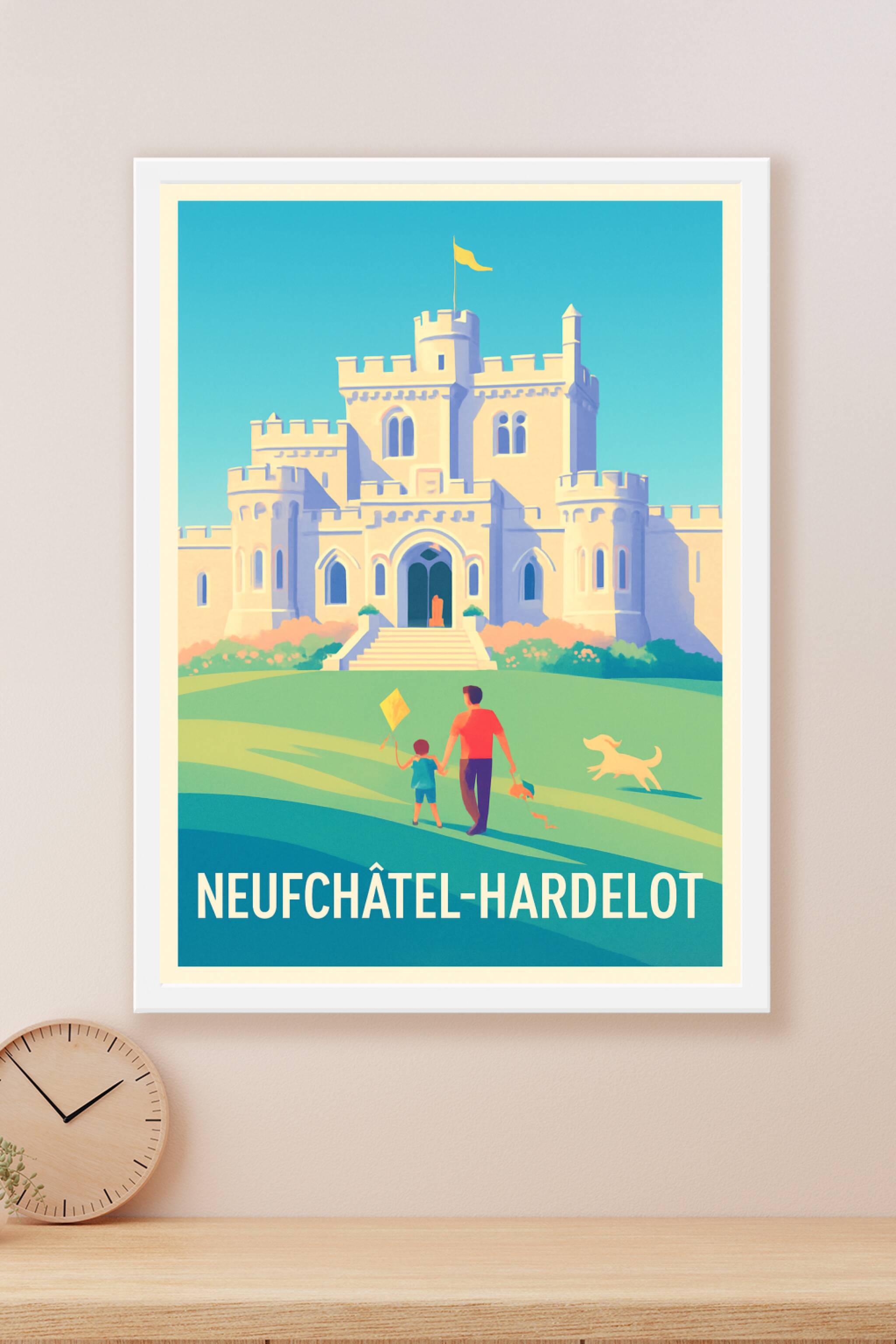 Capturez l'atmosphère paisible et familiale de Neufchâtel-Hardelot avec cette affiche illustrée mettant en scène le château emblématique de la vill...
