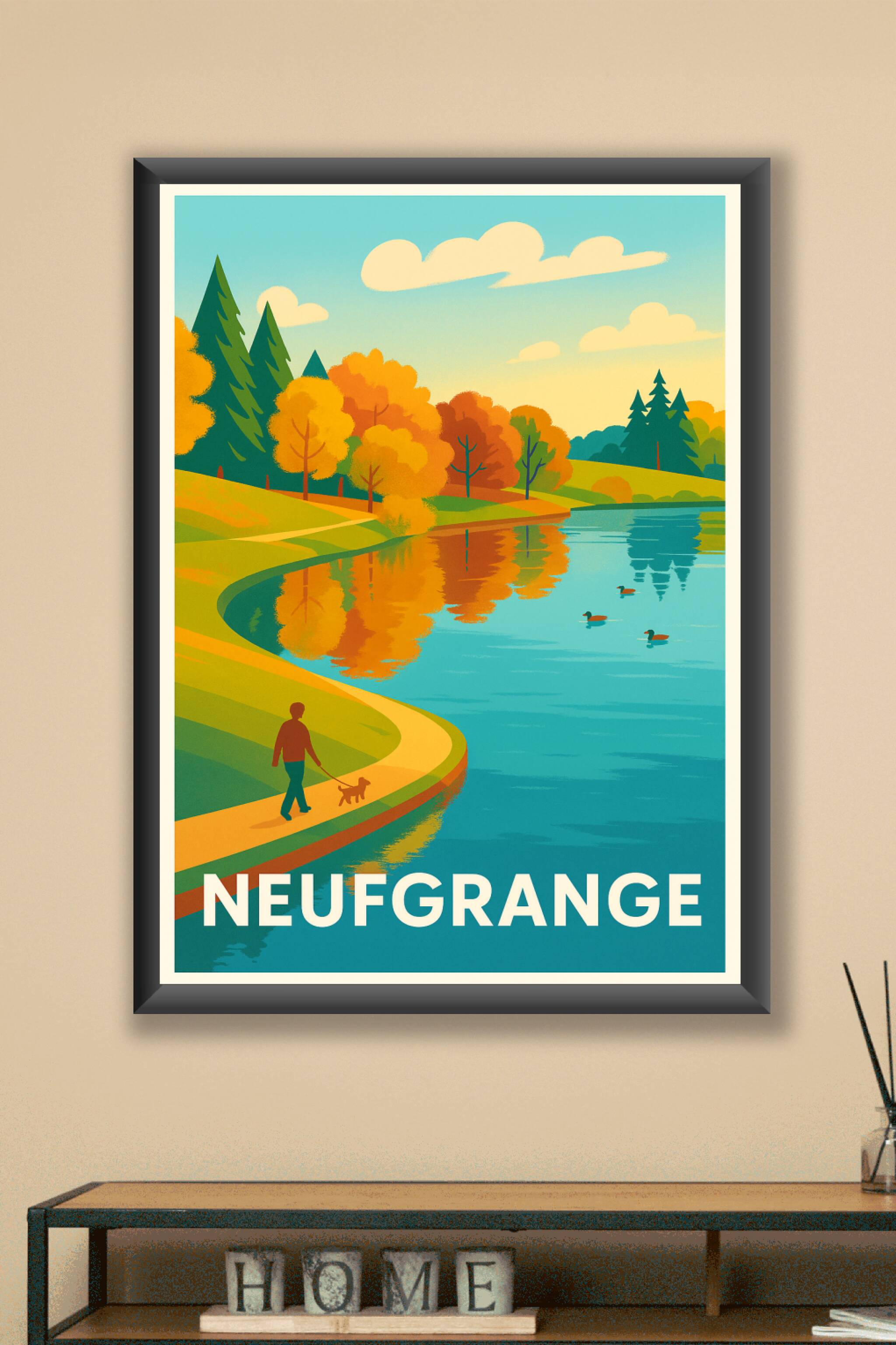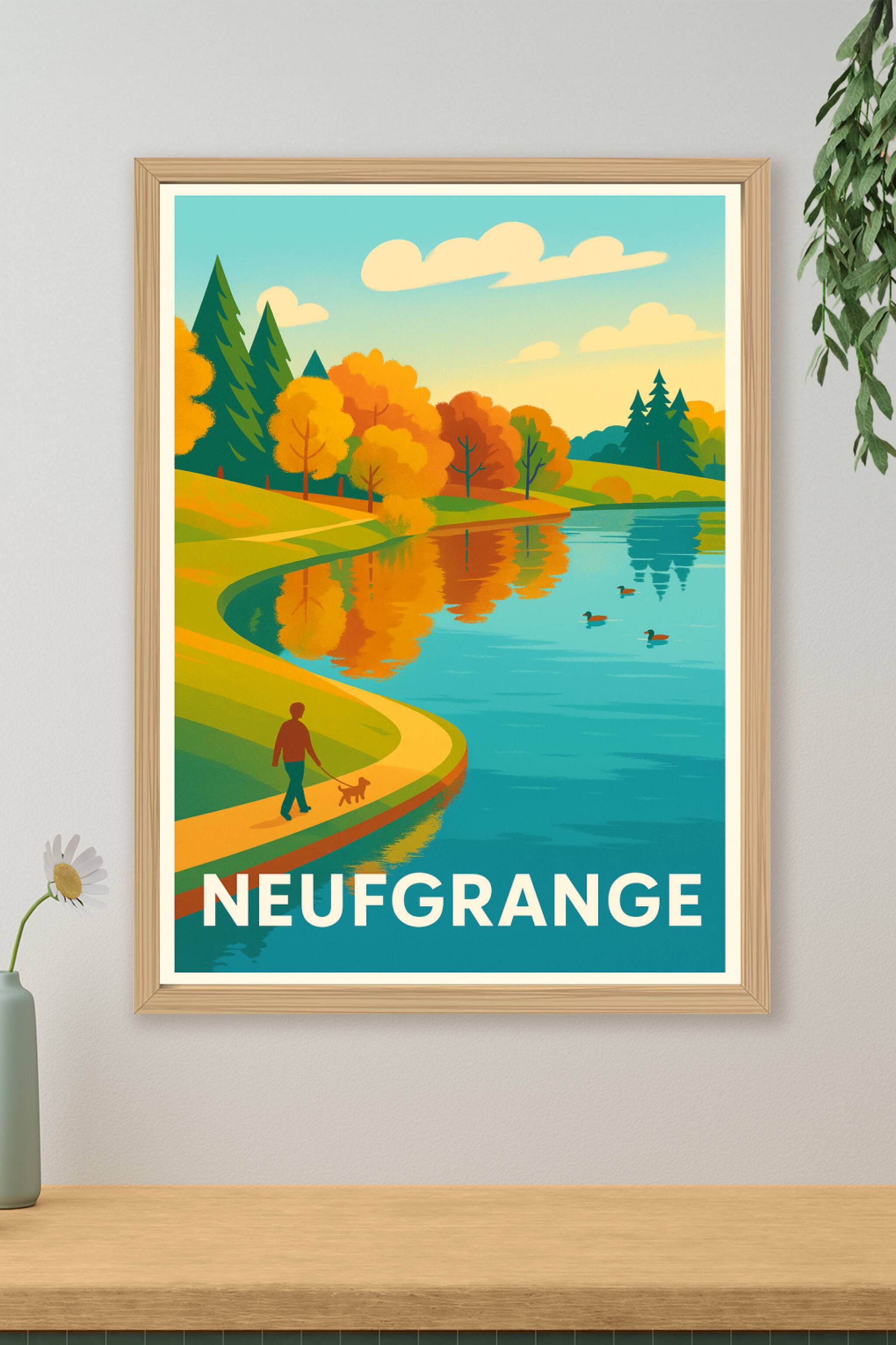 Découvrez l'élégance paisible du paysage de Neufgrange avec cette affiche au style vintage et coloré illustrant une promenade automnale au bord d'u...