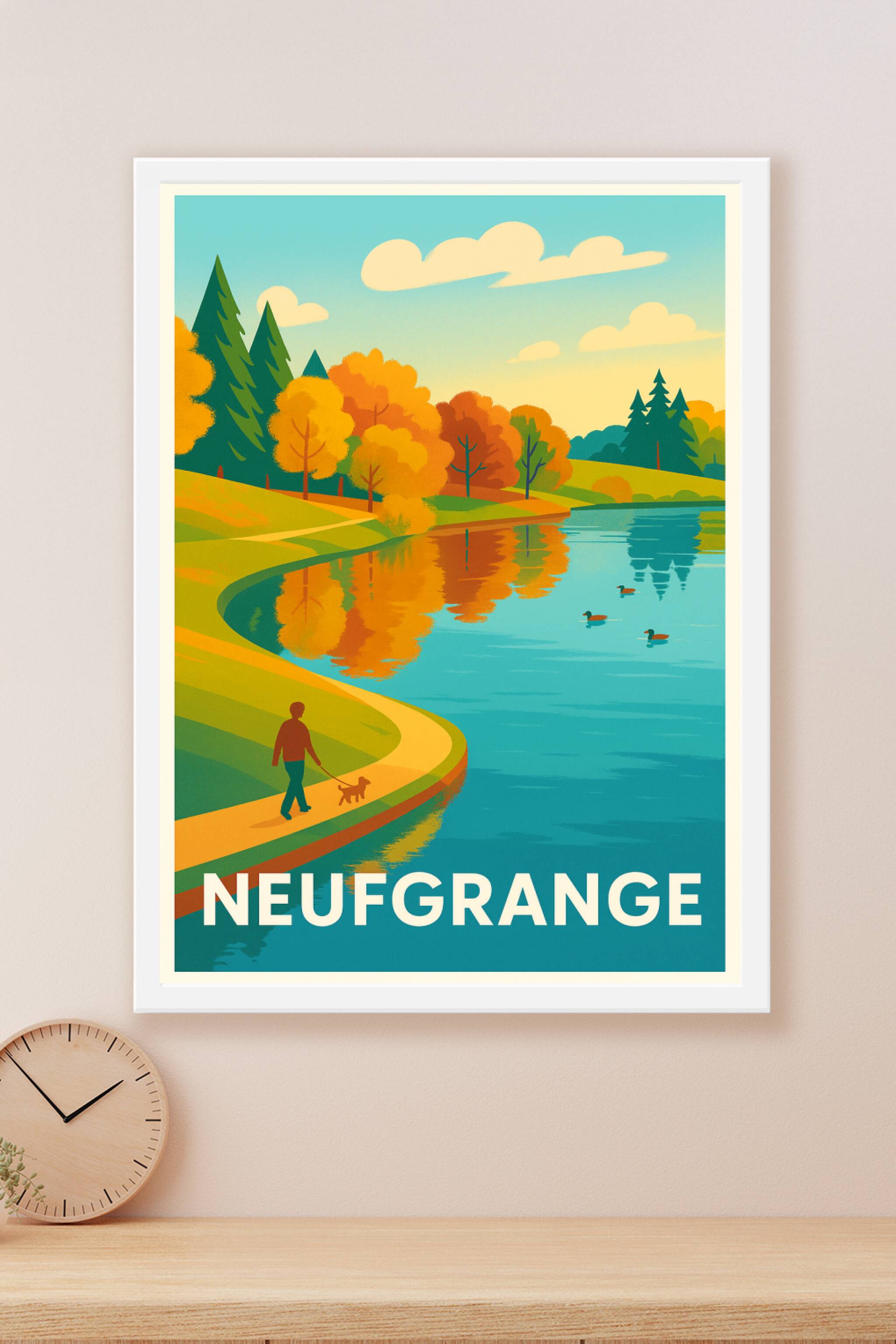 Découvrez l'élégance paisible du paysage de Neufgrange avec cette affiche au style vintage et coloré illustrant une promenade automnale au bord d'un lac. L'harmonie des arbres aux feuilles dorées, le reflet sur l'eau et la présence tranquille du promeneur avec son chien évoquent une atmosphère de calme et de nature ressourçante. Ce poster est imprimé en tirage "Fine Art" sur papier 305g coton, garantissant une restitution précise des couleurs et une qualité d'impression haut de gamme. Disponible en formats A1 à A4, avec ou sans cadre, il s'intégrera parfaitement dans votre intérieur pour apporter une touche chaleureuse et élégante. Offrez-vous ou offrez un souvenir raffiné de Neufgrange, imprimé avec soin et 100% fabriqué en France.