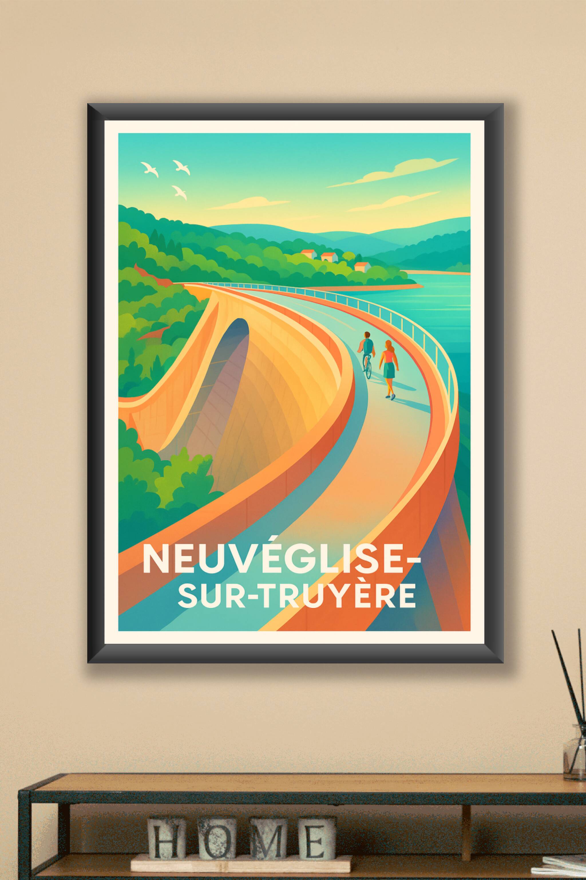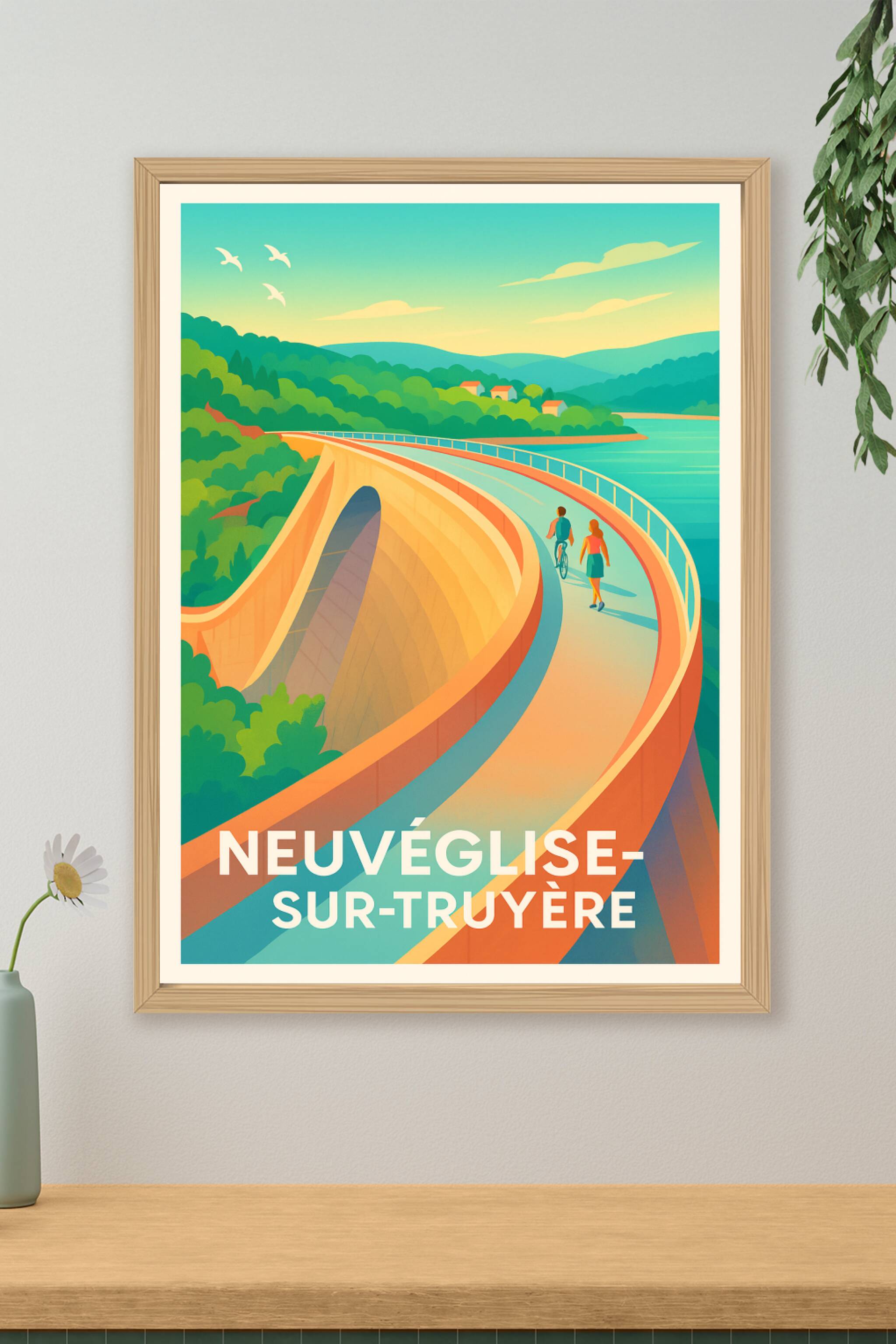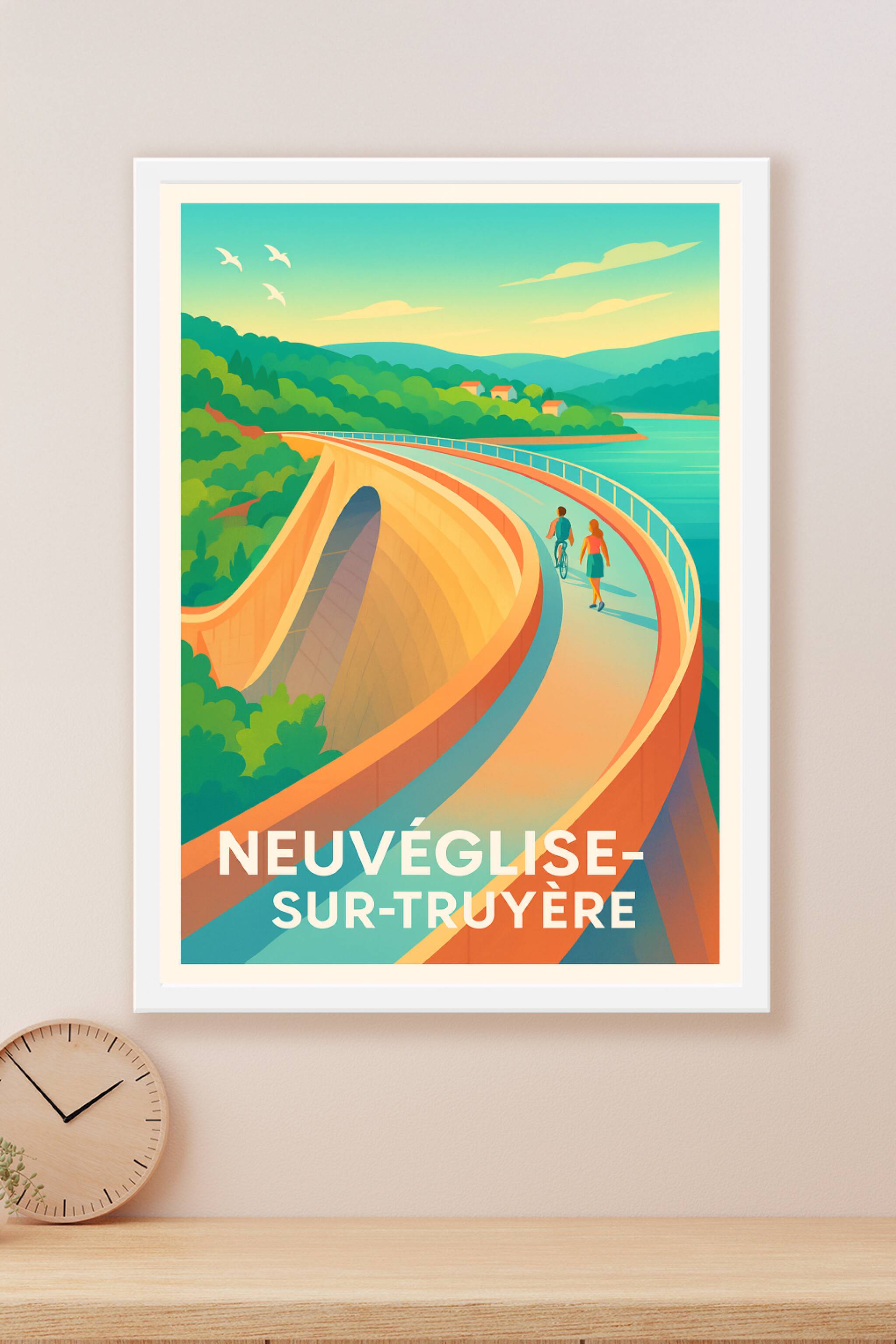 Découvrez la douceur de vivre à Neuvéglise-sur-Truyère avec cette affiche illustrée qui célèbre la sérénité des routes sinueuses au-dessus des eaux...