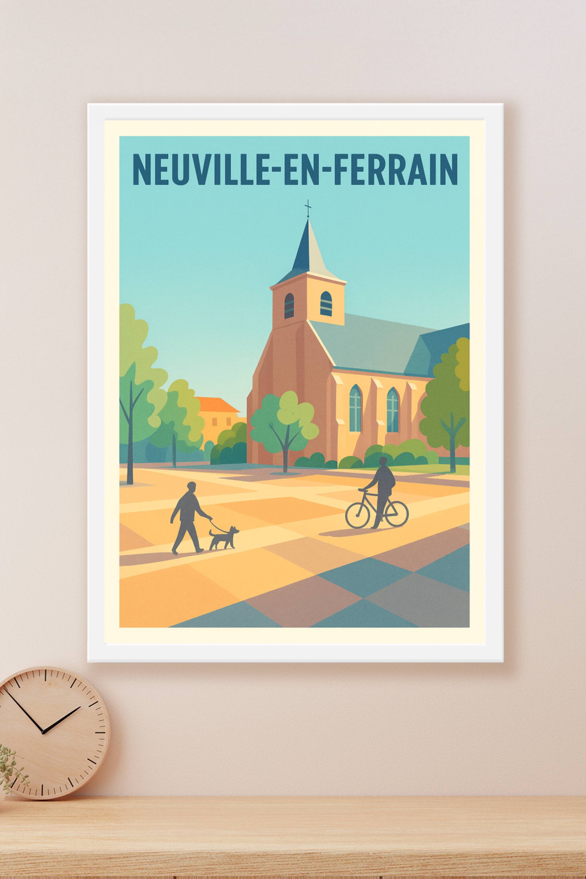 Découvrez l'élégance tranquille de Neuville-en-Ferrain avec cette affiche au style vintage qui met en lumière une charmante église entourée d'arbres et de silhouettes paisibles. Ce poster évoque une douce promenade en ville, où se mêlent nature et architecture historique.Cet article est imprimé en tirage "Fine Art" sur papier 305g coton, assurant une qualité d'impression durable et des couleurs profondes. Disponible du format A1 à A4, avec ou sans cadre, cette affiche s'adapte à toutes vos envies de décoration. Emportez un morceau de Neuville-en-Ferrain chez vous ou offrez-le en cadeau à un amoureux de cette belle commune, avec la garantie d'un tirage premium, 100% fabriqué en France.