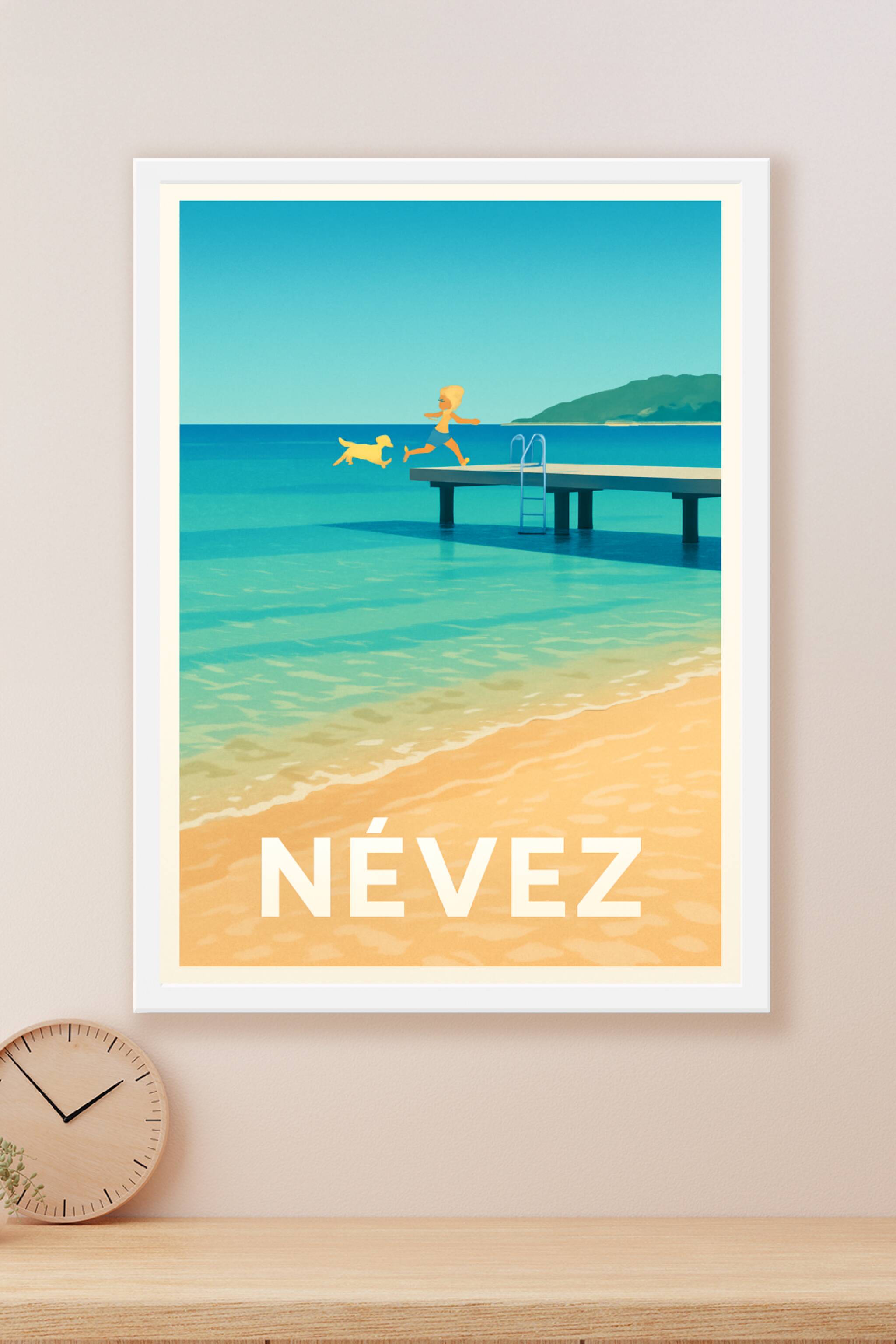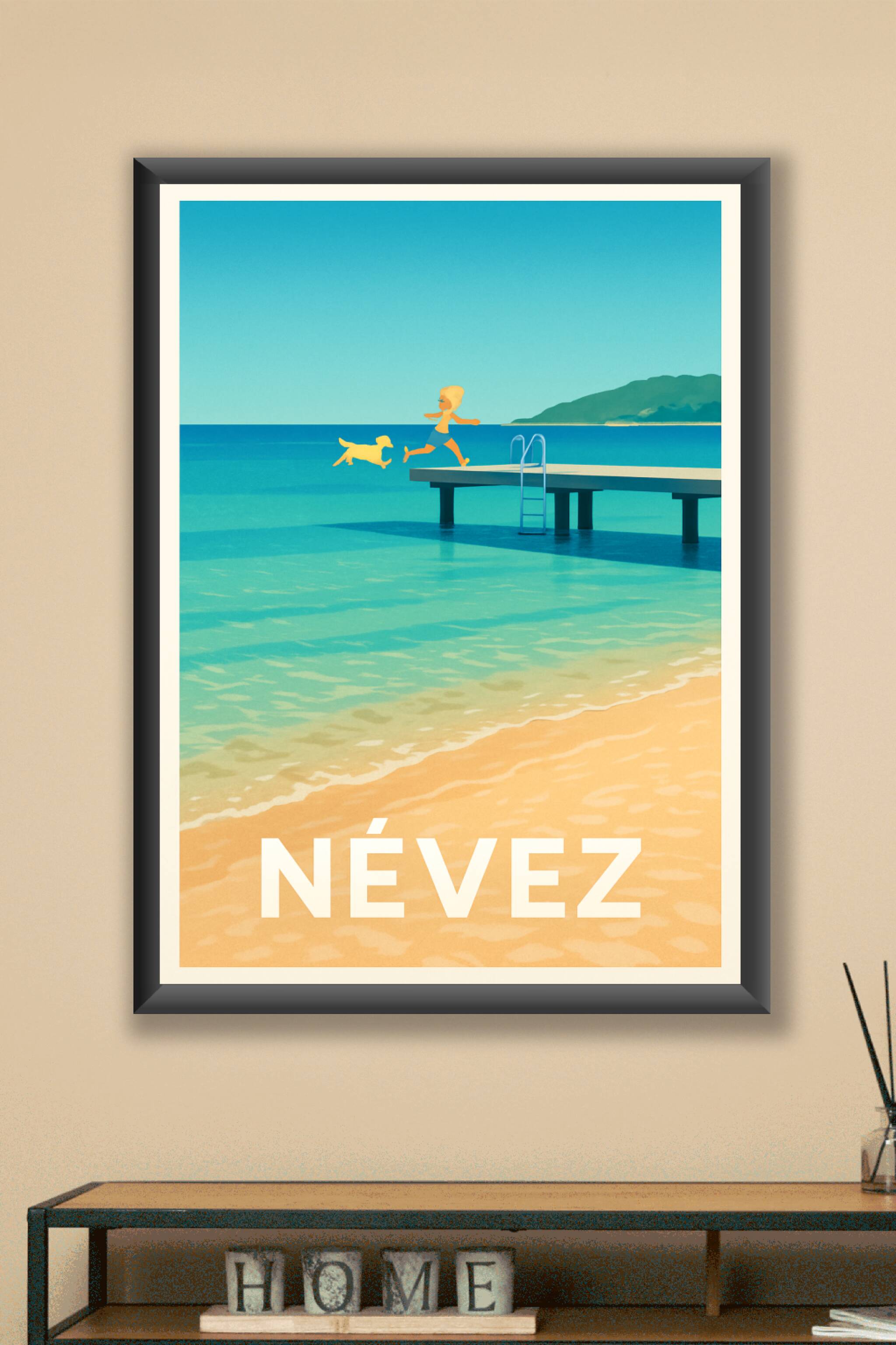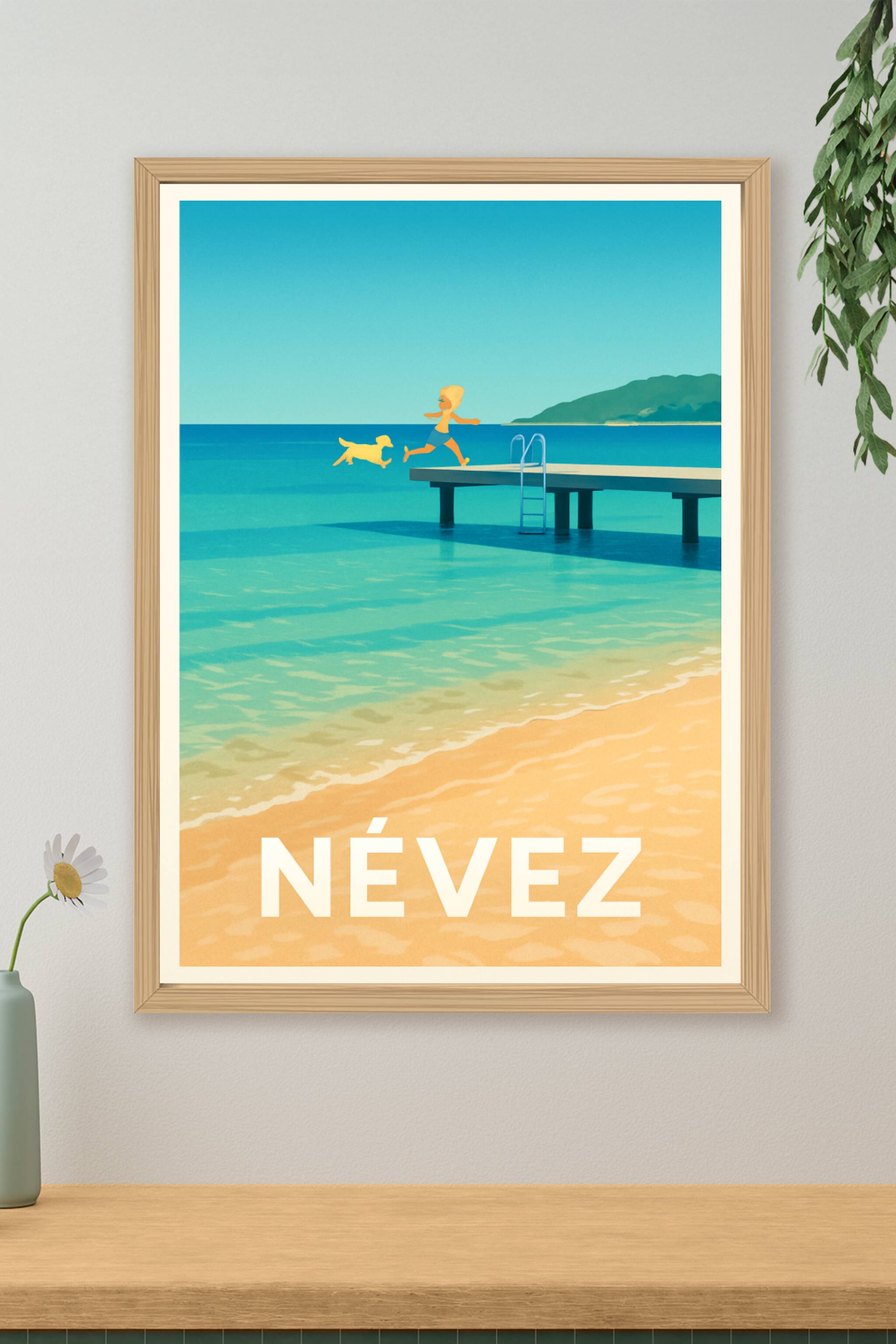 Découvrez la douceur de vivre à Névez avec cette affiche illustrée qui capture un moment d'insouciance sur un ponton face à la mer turquoise. Un en...