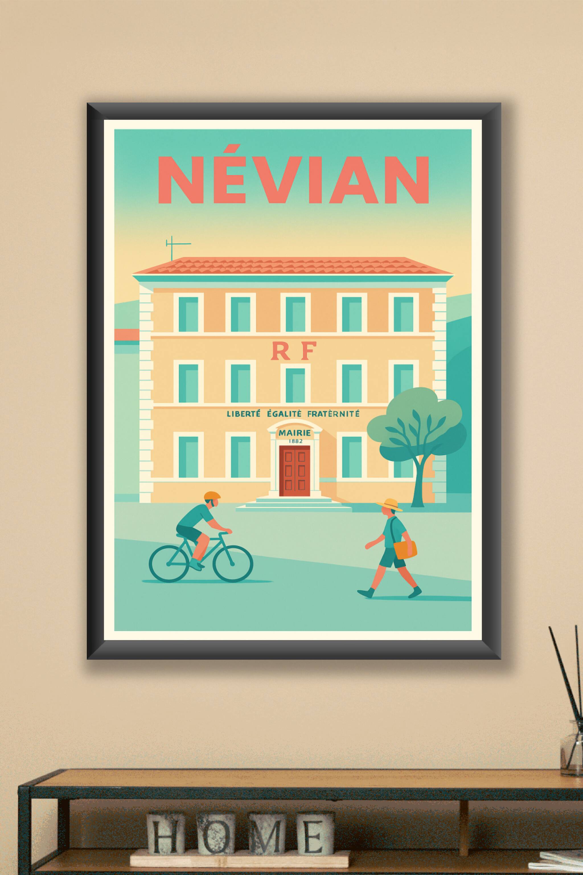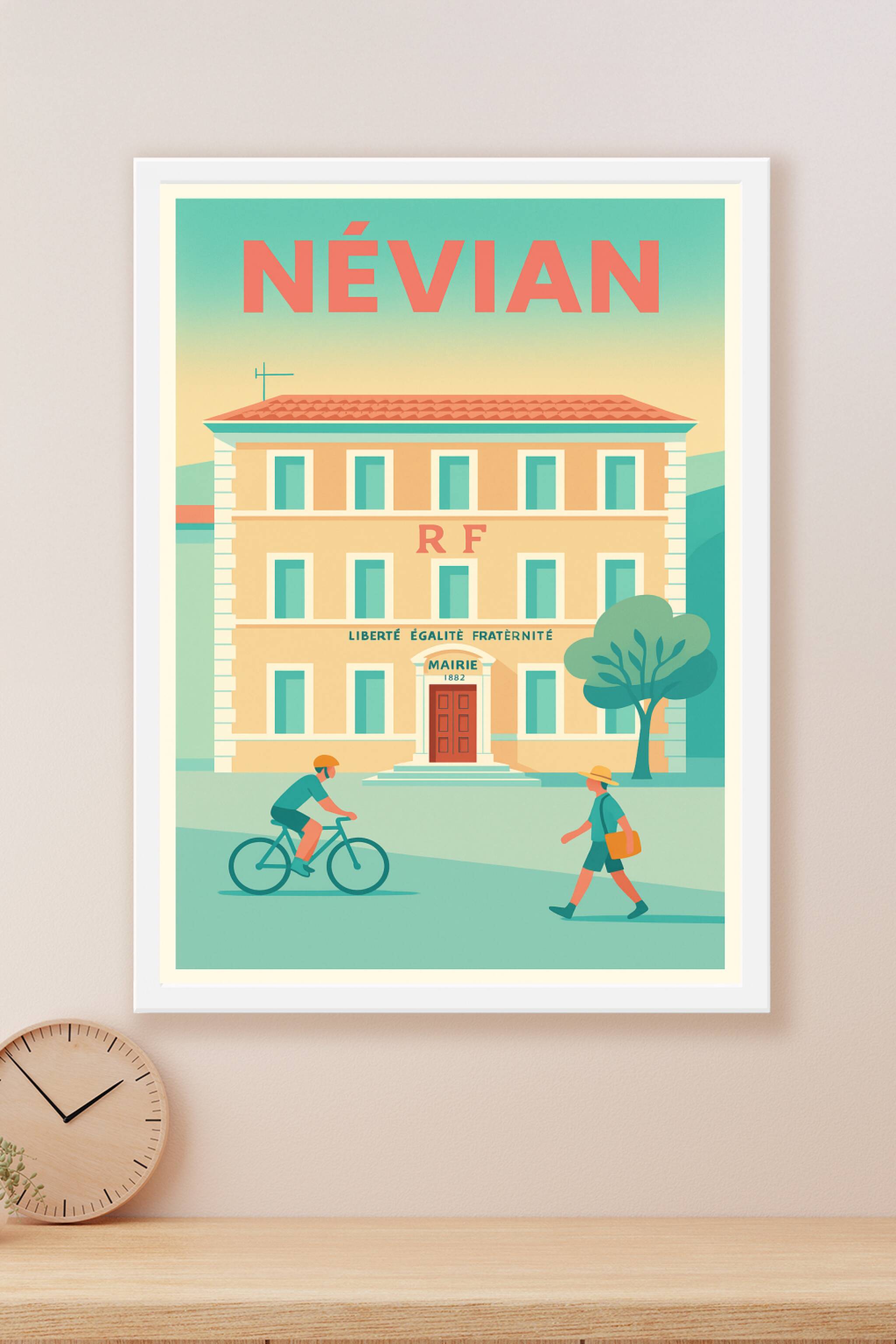 Découvrez l'affiche illustrée de Névian, mettant à l'honneur la mairie historique de la commune, symbole de liberté, égalité, fraternité, dans une ...