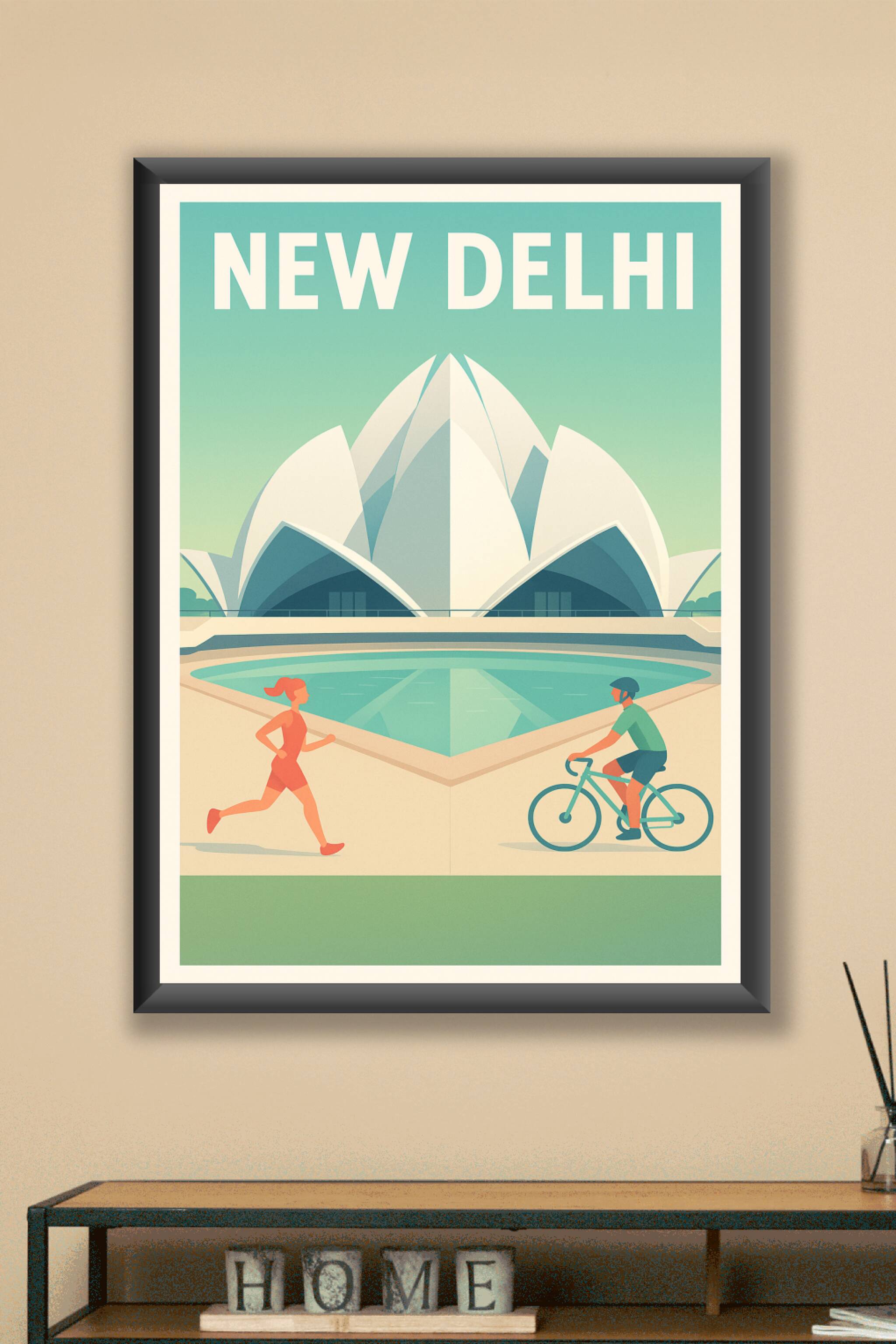 Découvrez l'atmosphère apaisante mais dynamique de New Delhi à travers cette affiche illustrée mettant en scène le célèbre Lotus Temple. Une joggeu...