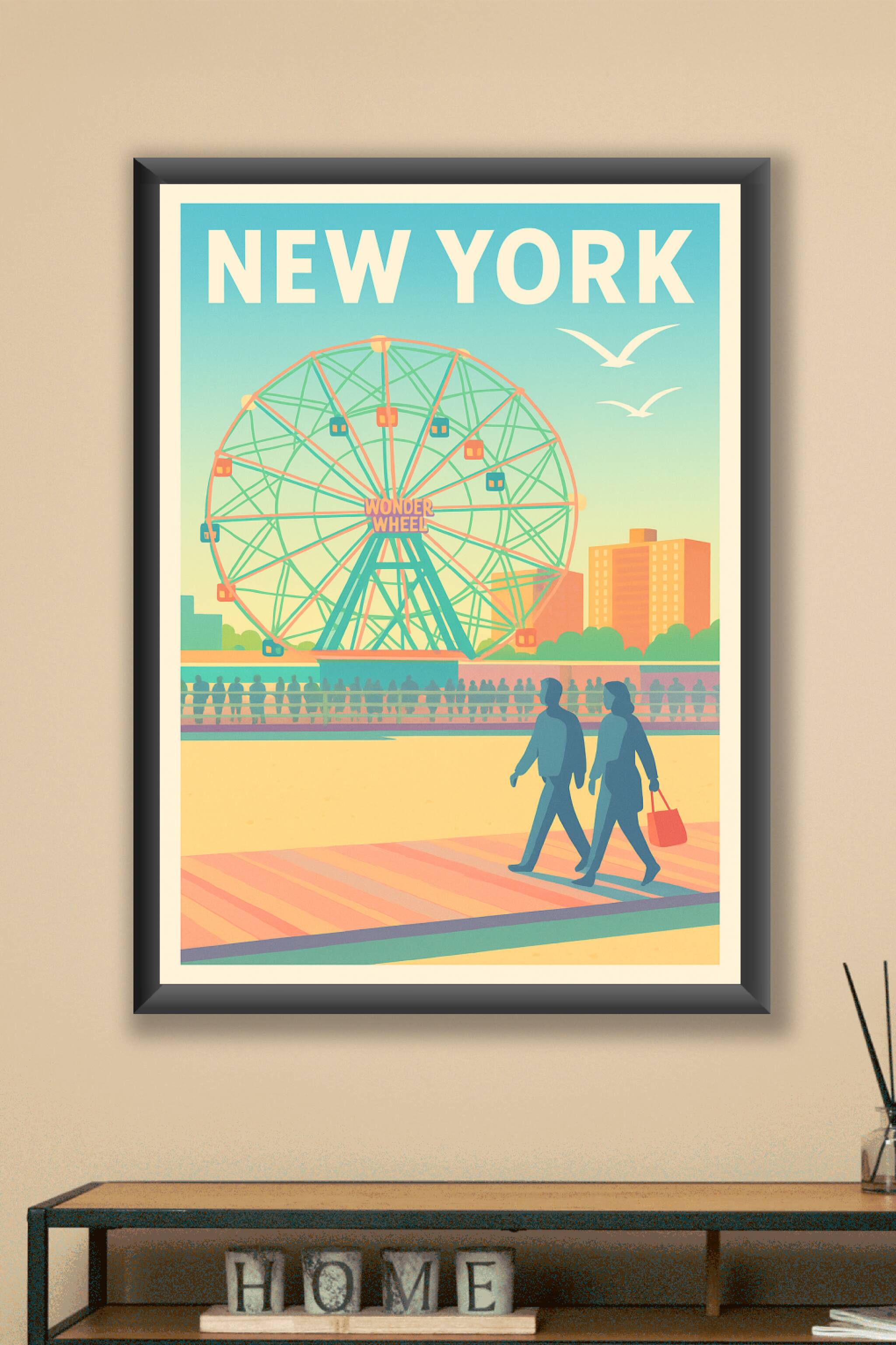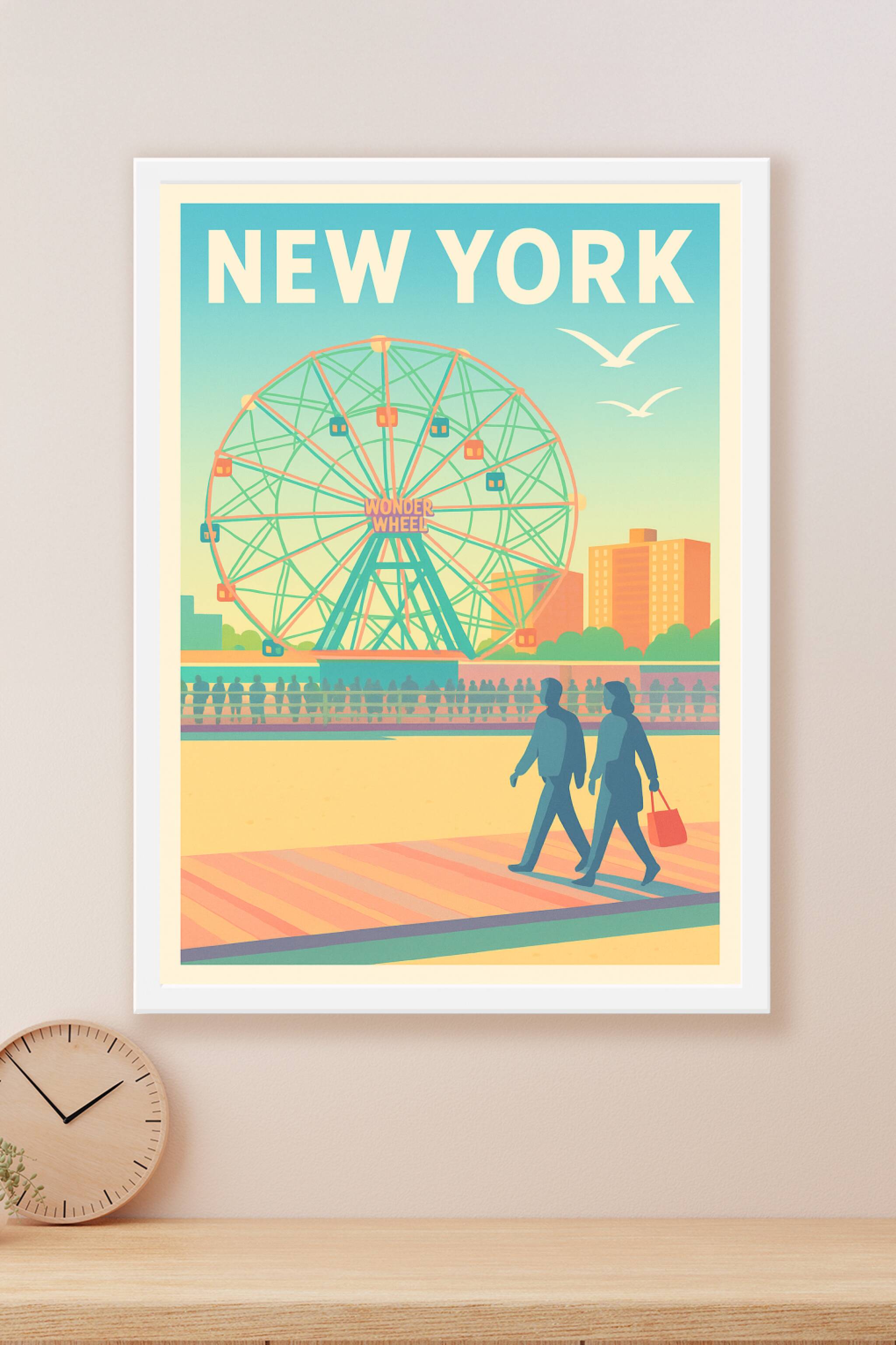 Découvrez l'ambiance nostalgique et colorée de New York avec cette affiche illustrée mettant en avant la célèbre Wonder Wheel, symbole emblématique...