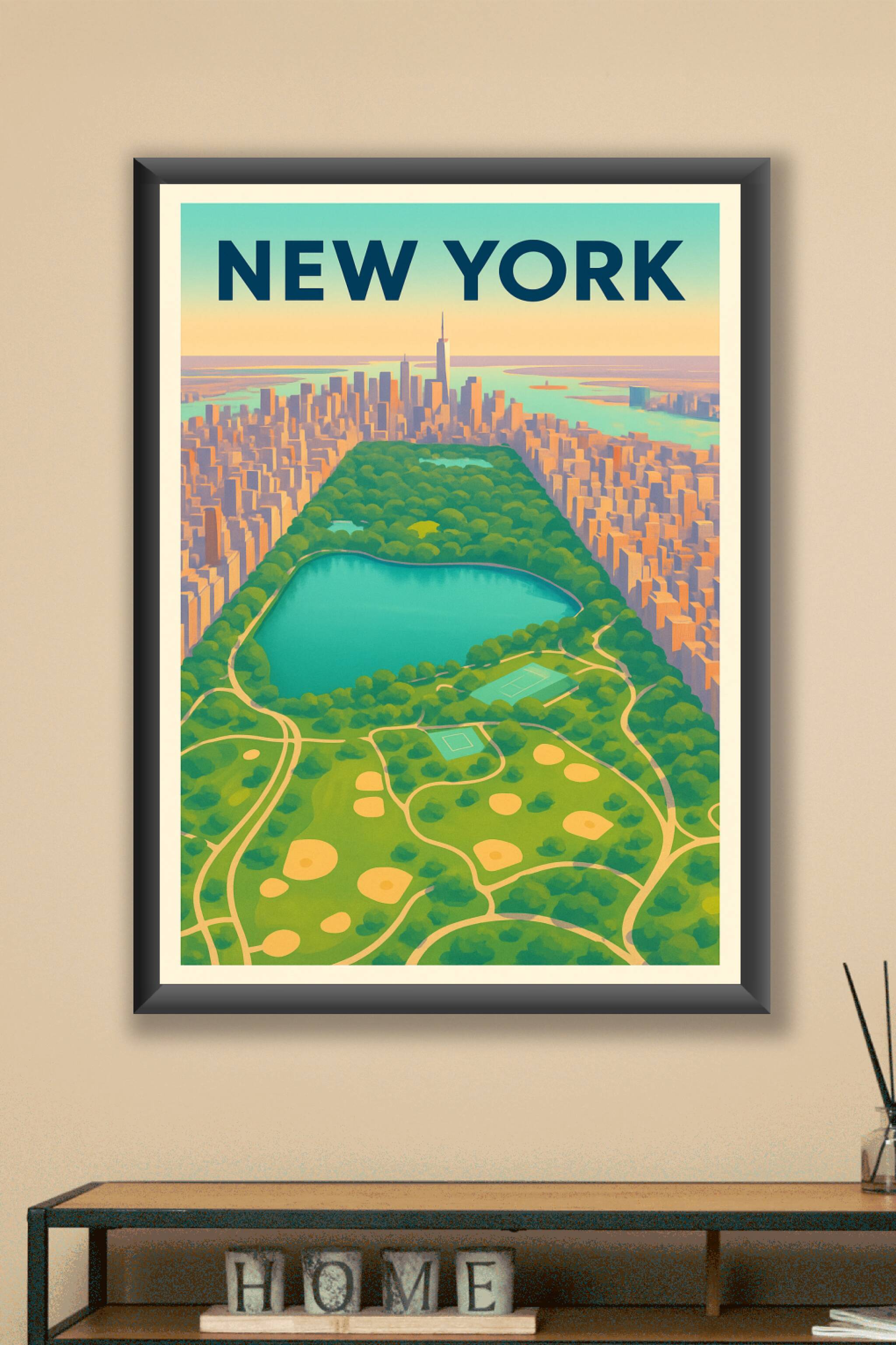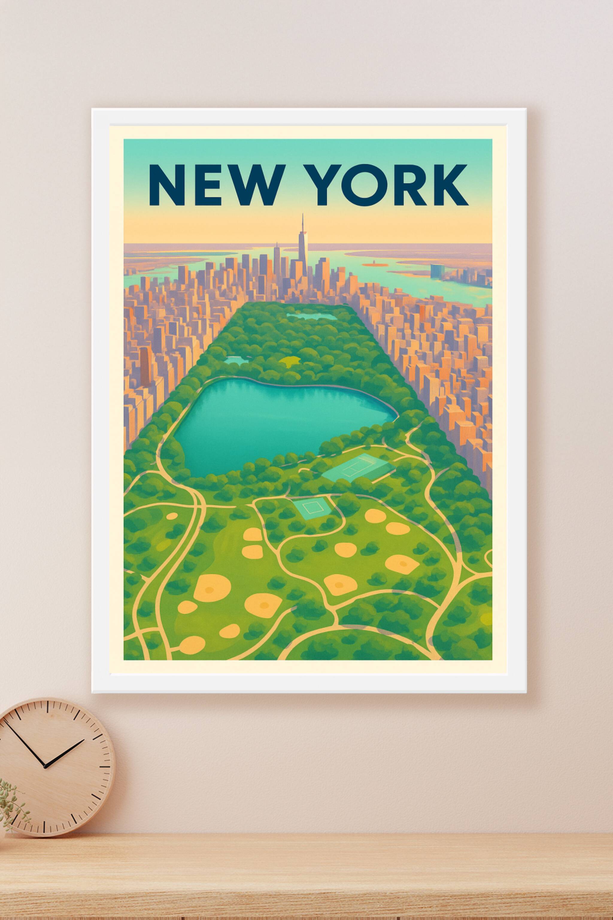 Apportez une touche new-yorkaise à votre décoration avec cette affiche illustrée présentant une vue aérienne emblématique de Central Park et du sky...