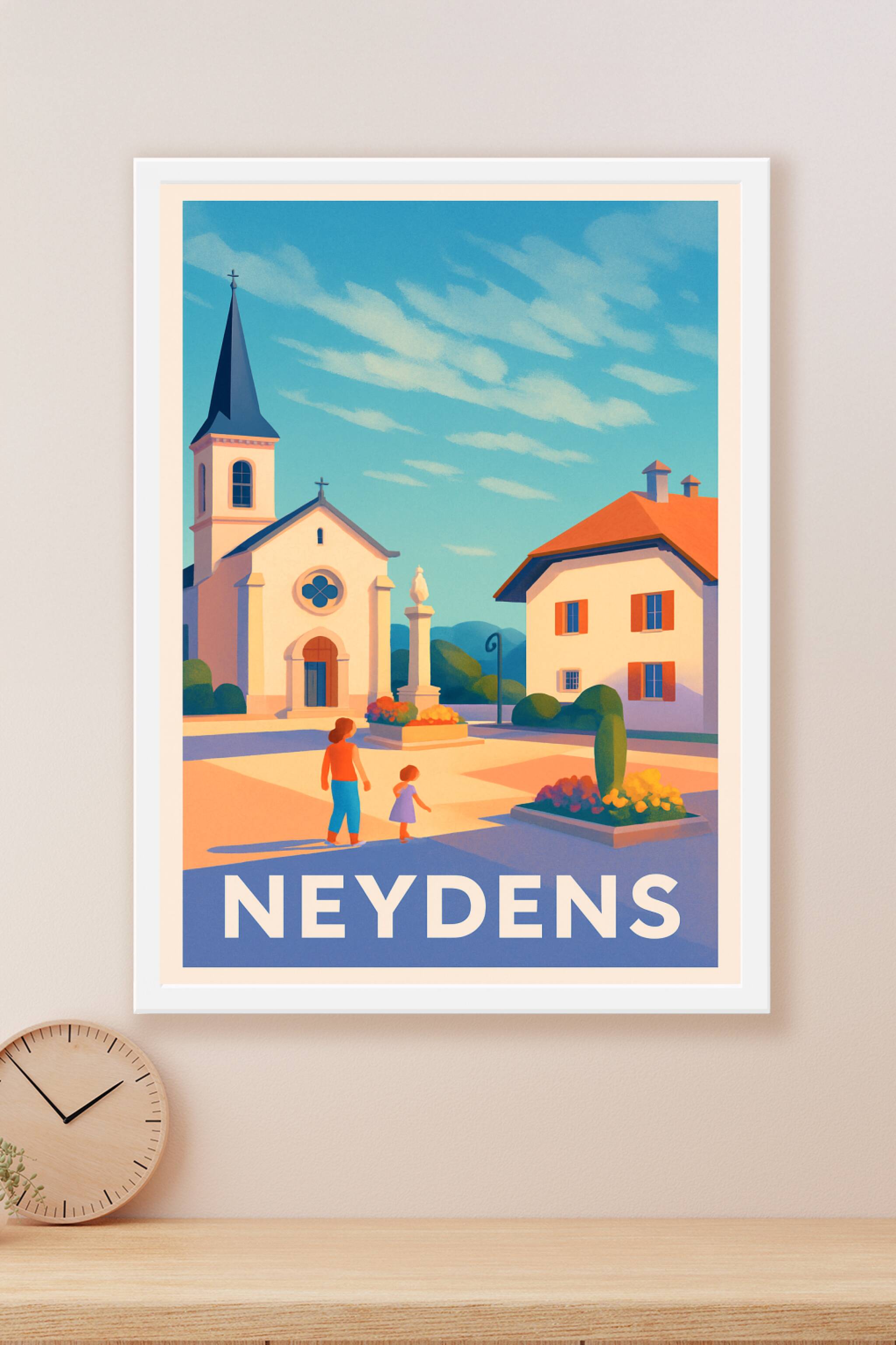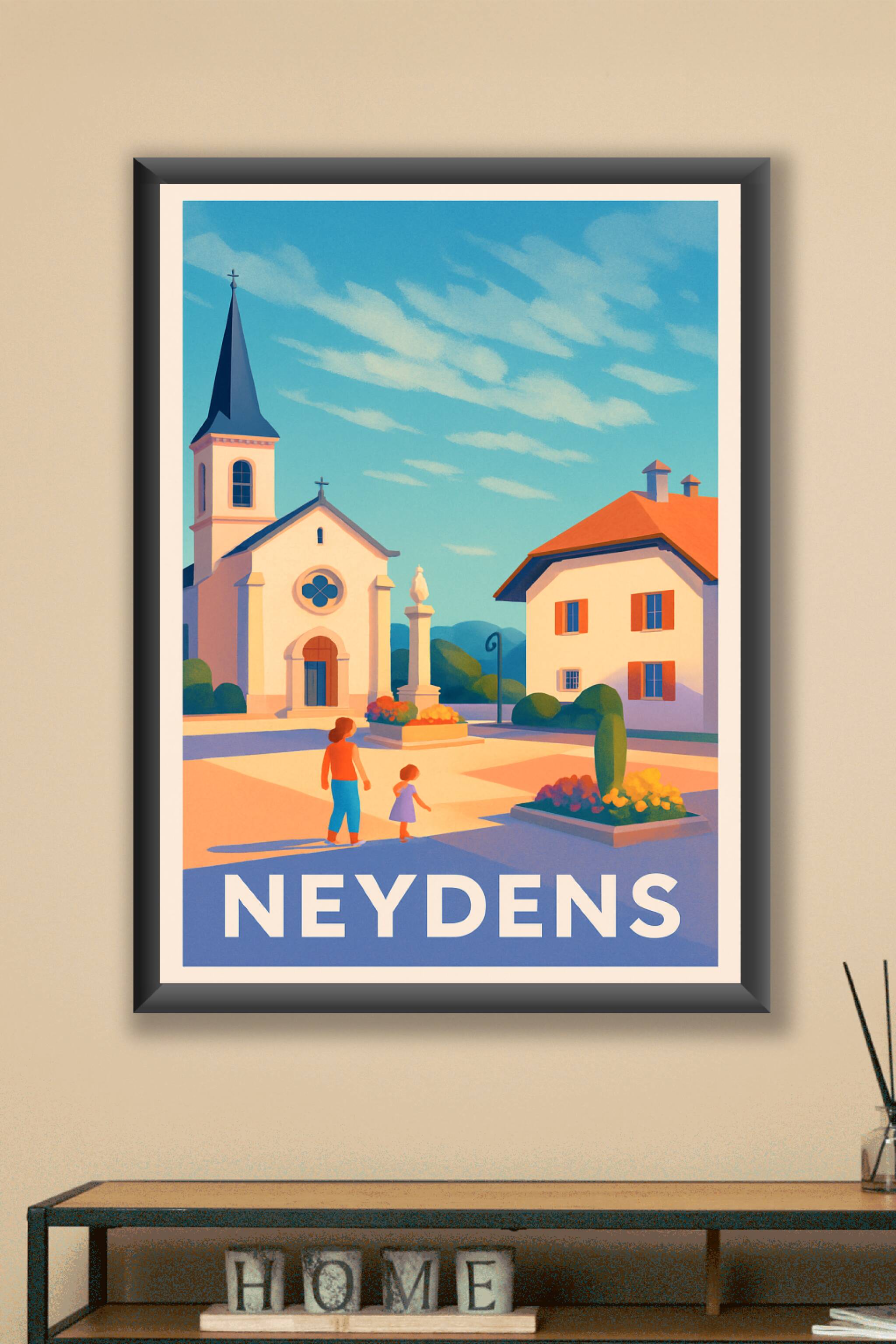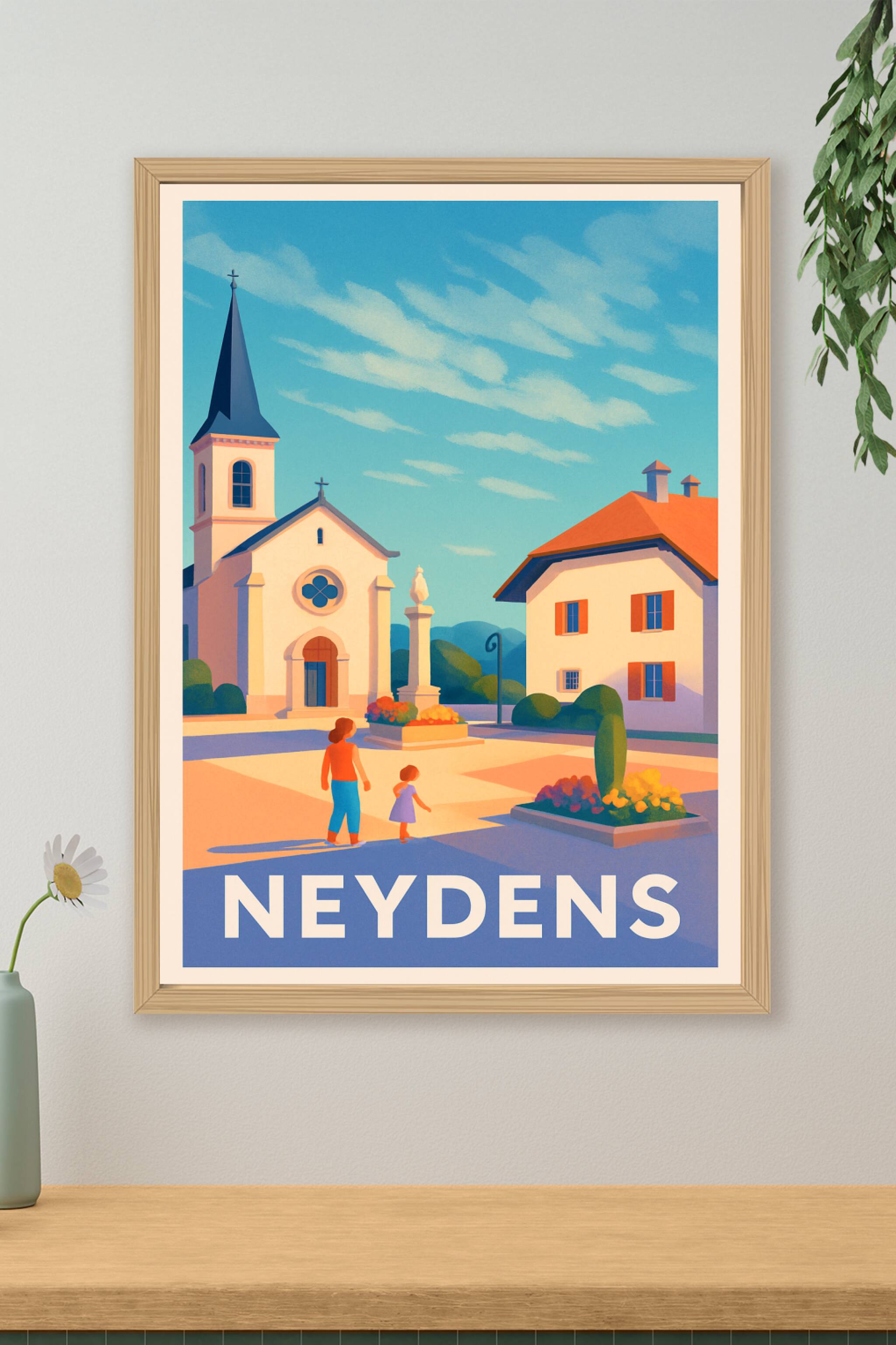 Découvrez l'élégance tranquille de Neydens à travers cette affiche vintage illustrée, mettant en scène une église pittoresque et une douce promenad...