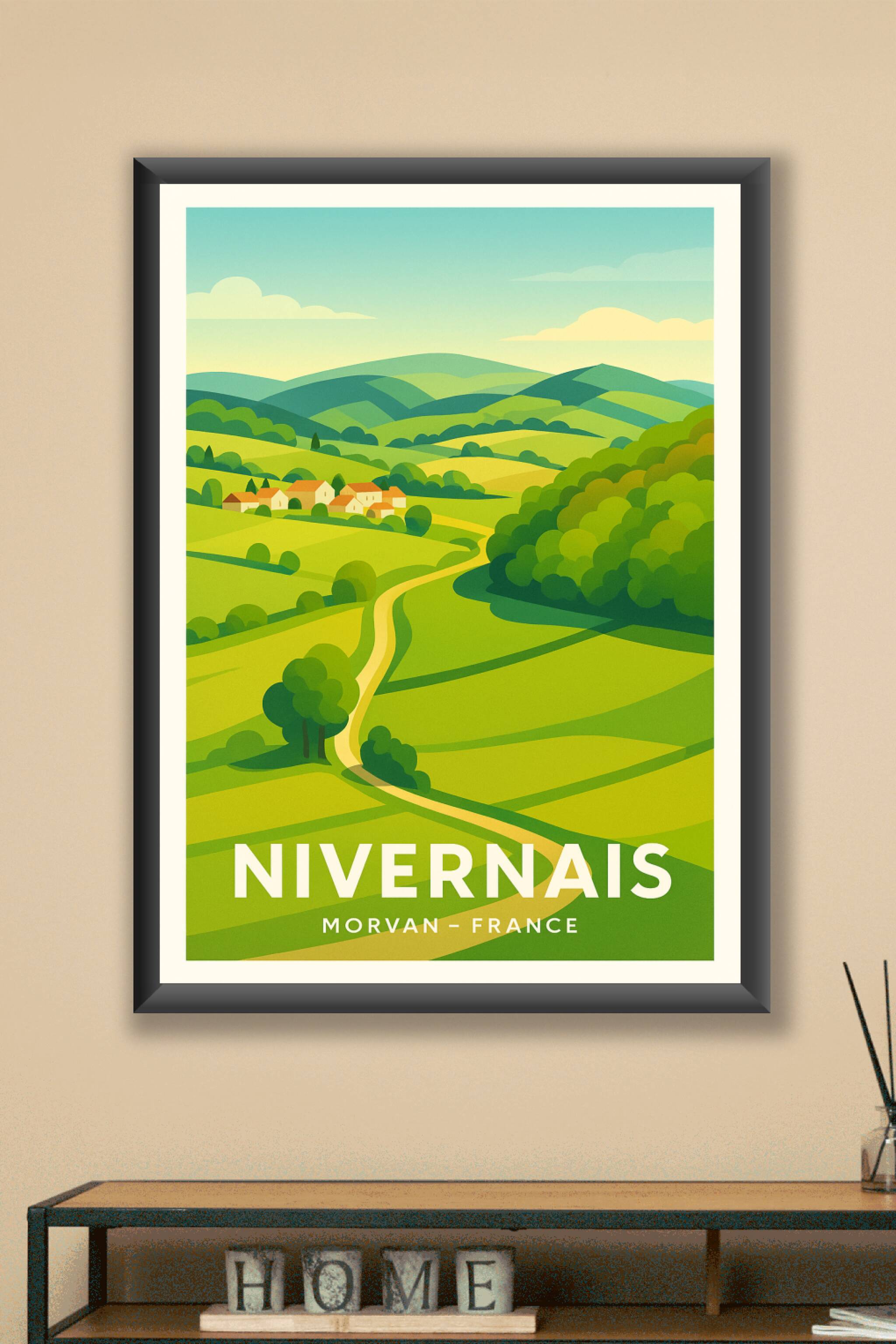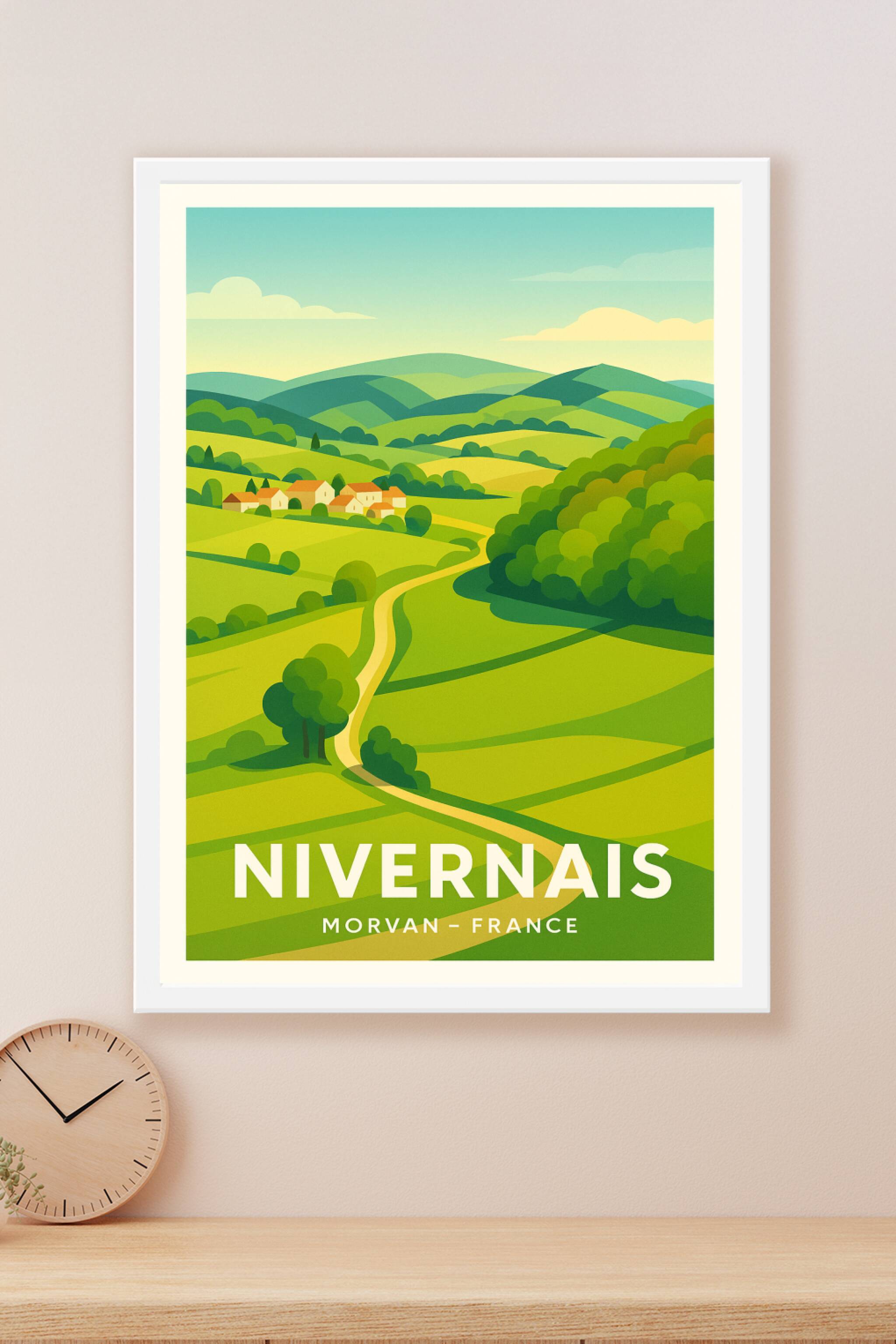 Découvrez l'essence paisible et verdoyante du Nivernais avec ce poster au style rétro moderne, illustrant les douces collines et chemins sinueux du...