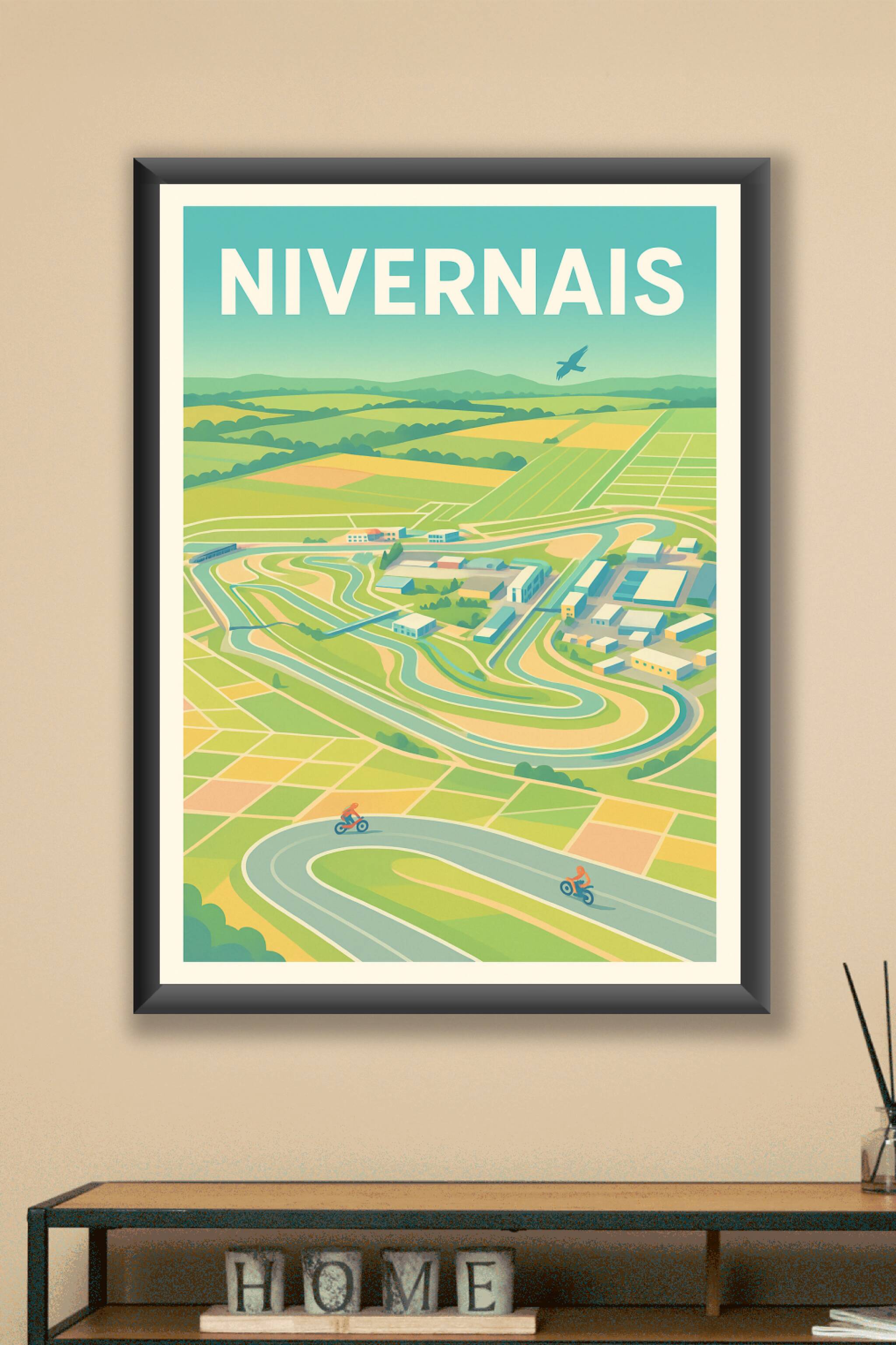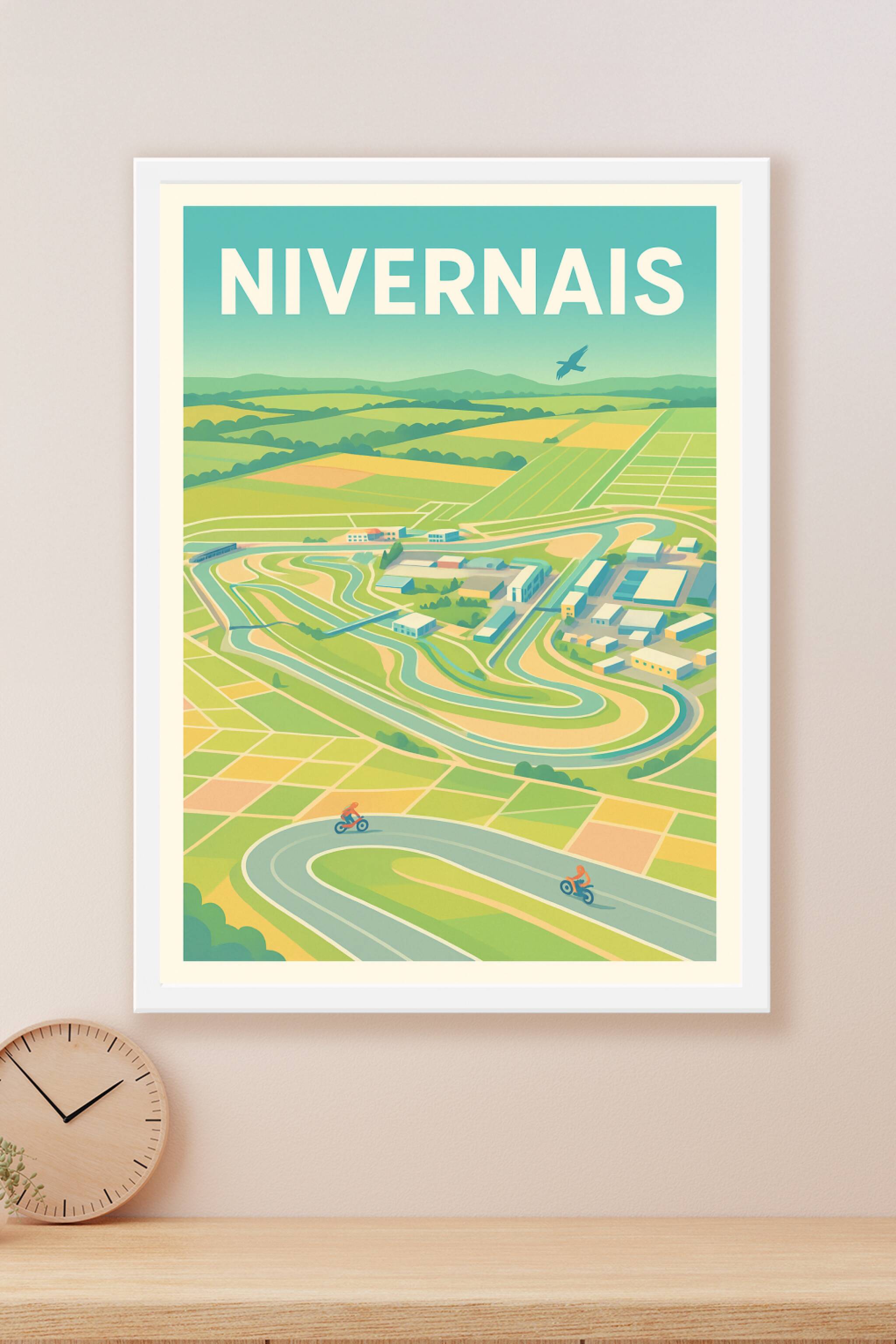 Découvrez l'esprit vibrant du Nivernais avec cette affiche pleine de dynamisme mettant en scène deux motards sur une route sinueuse entourée de paysages verdoyants et agricoles. Ce poster illustré au style rétro apporte une atmosphère à la fois paisible et pleine d'énergie à votre intérieur. Imprimé en tirage "Fine Art" sur papier 305g coton pour une qualité d'image et de texture exceptionnelle, cette affiche est disponible en formats A1 à A4, avec ou sans cadre selon votre choix. Offrez-vous ce poster d'exception, 100% fabriqué en France, pour sublimer votre décoration ou faire un cadeau élégant aux passionnés de paysages et sensations.