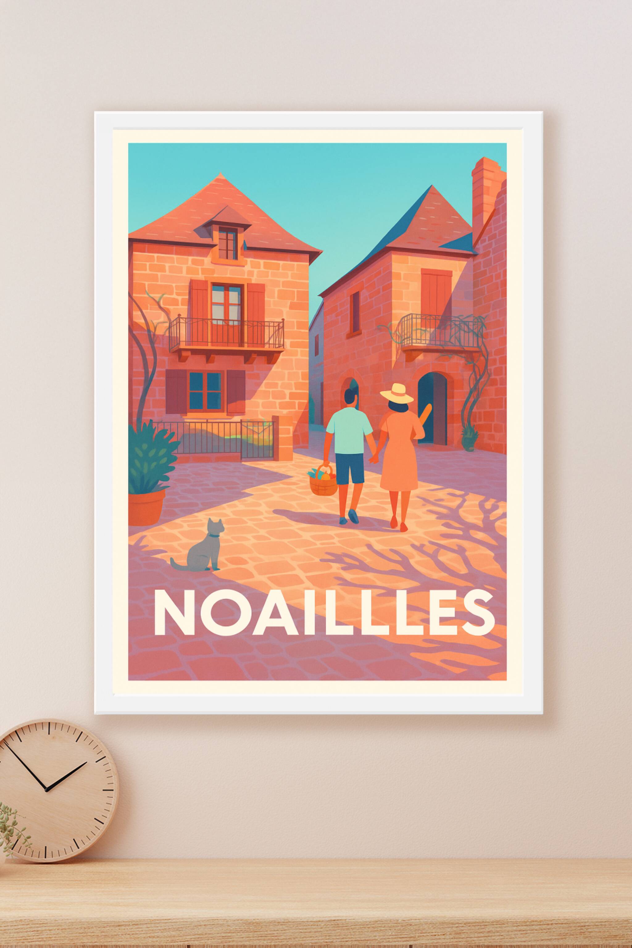 Découvrez l'ambiance paisible et chaleureuse de Noailles avec cette affiche illustrée aux couleurs douces et lumineuses. Cette scène intime montre un couple se promenant dans les ruelles pavées, entouré de belles maisons en pierre typiques, sous un ciel d'un bleu éclatant. Ce poster est imprimé en tirage "Fine Art" sur un papier 305g coton d'une qualité exceptionnelle, garantissant une finesse et une richesse des couleurs pour sublimer votre décoration intérieure. Disponible en plusieurs formats de A1 à A4, avec ou sans cadre, cette affiche s'intègre parfaitement dans tout espace, qu'il soit moderne ou classique. Offrez-vous un souvenir élégant ou un cadeau raffiné avec cette représentation délicate et ensoleillée de Noailles, 100% fabriquée en France.
