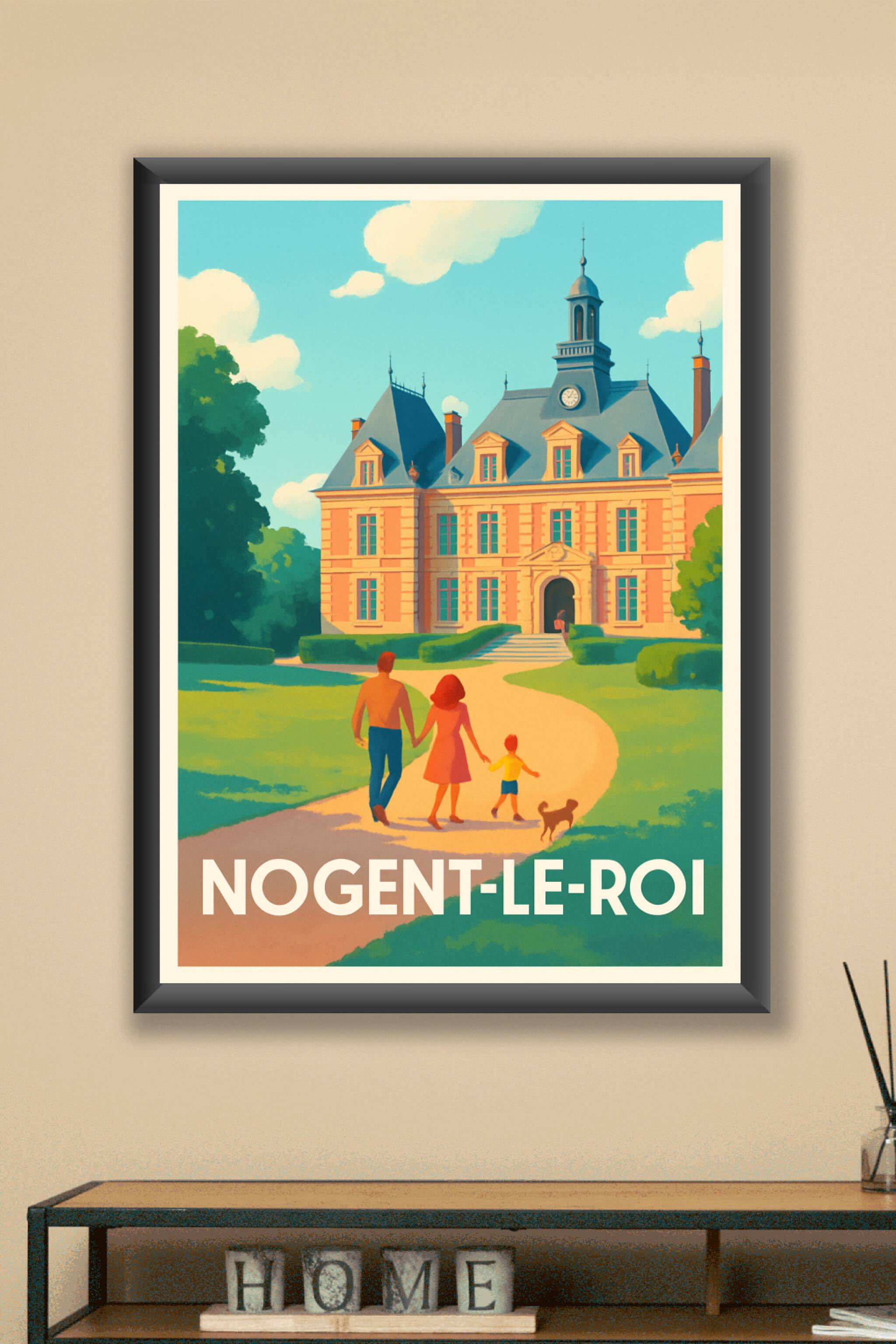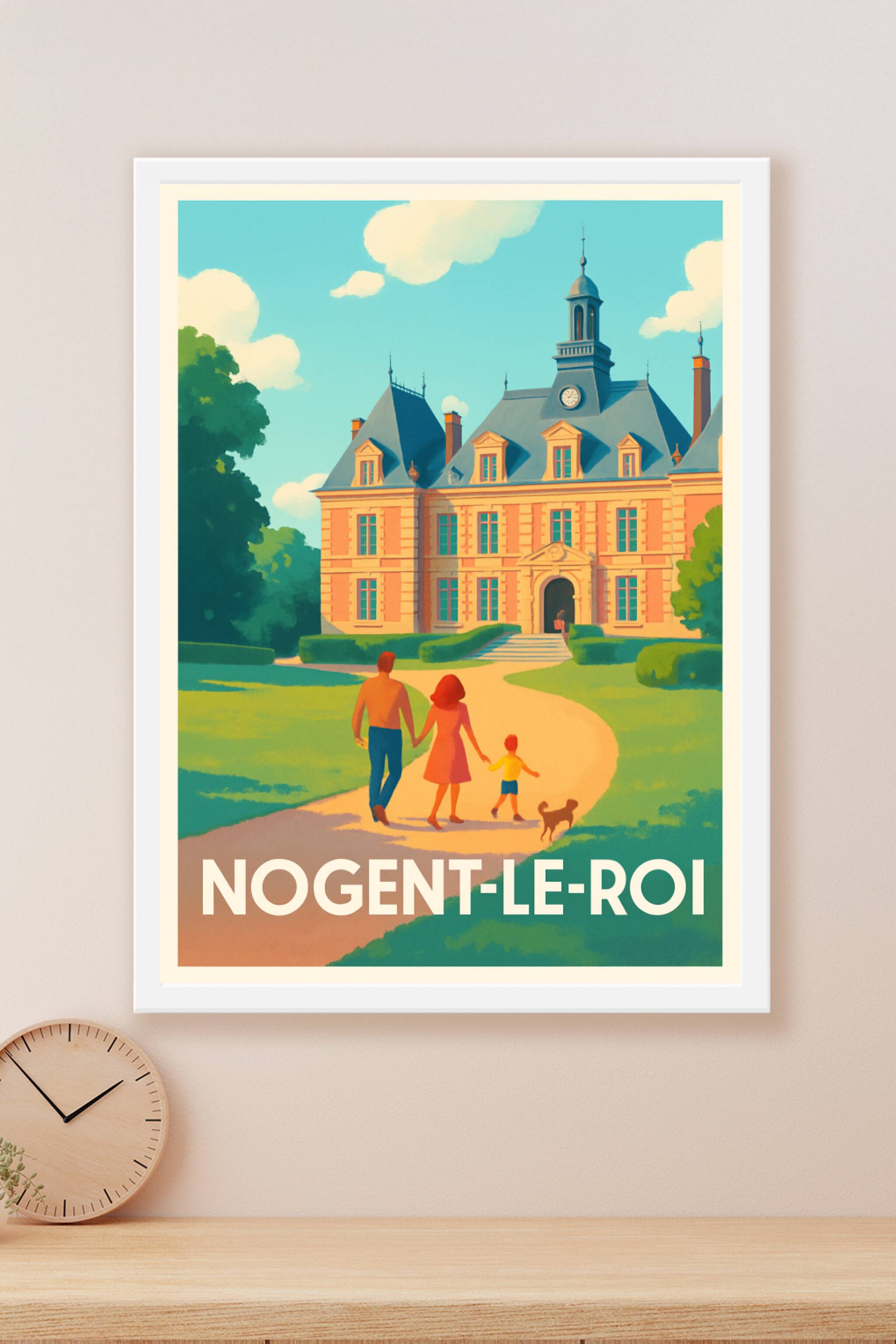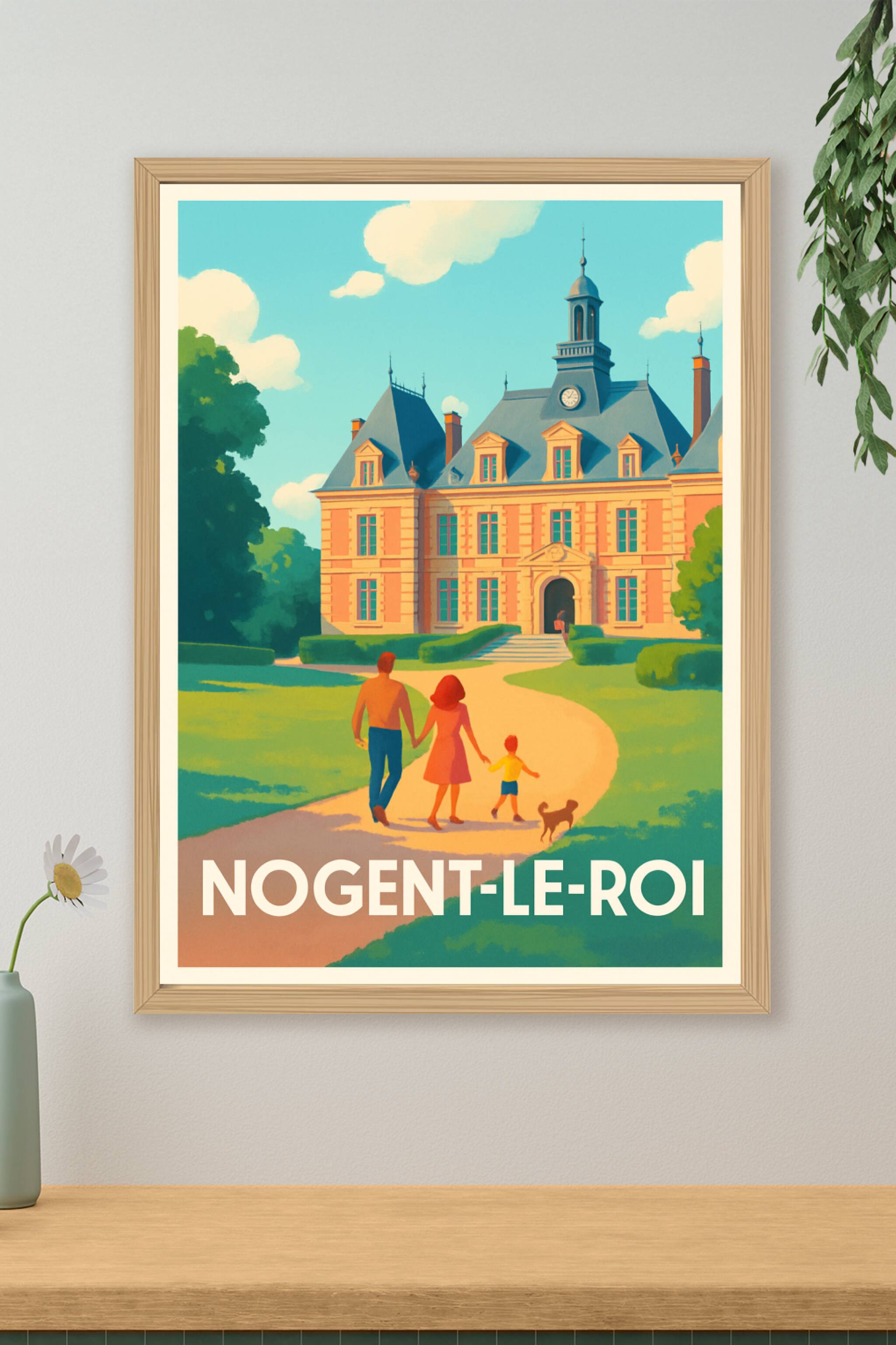 Découvrez le charme intemporel de Nogent-le-Roi avec cette affiche illustrée mettant en scène une famille se dirigeant vers le majestueux château d...