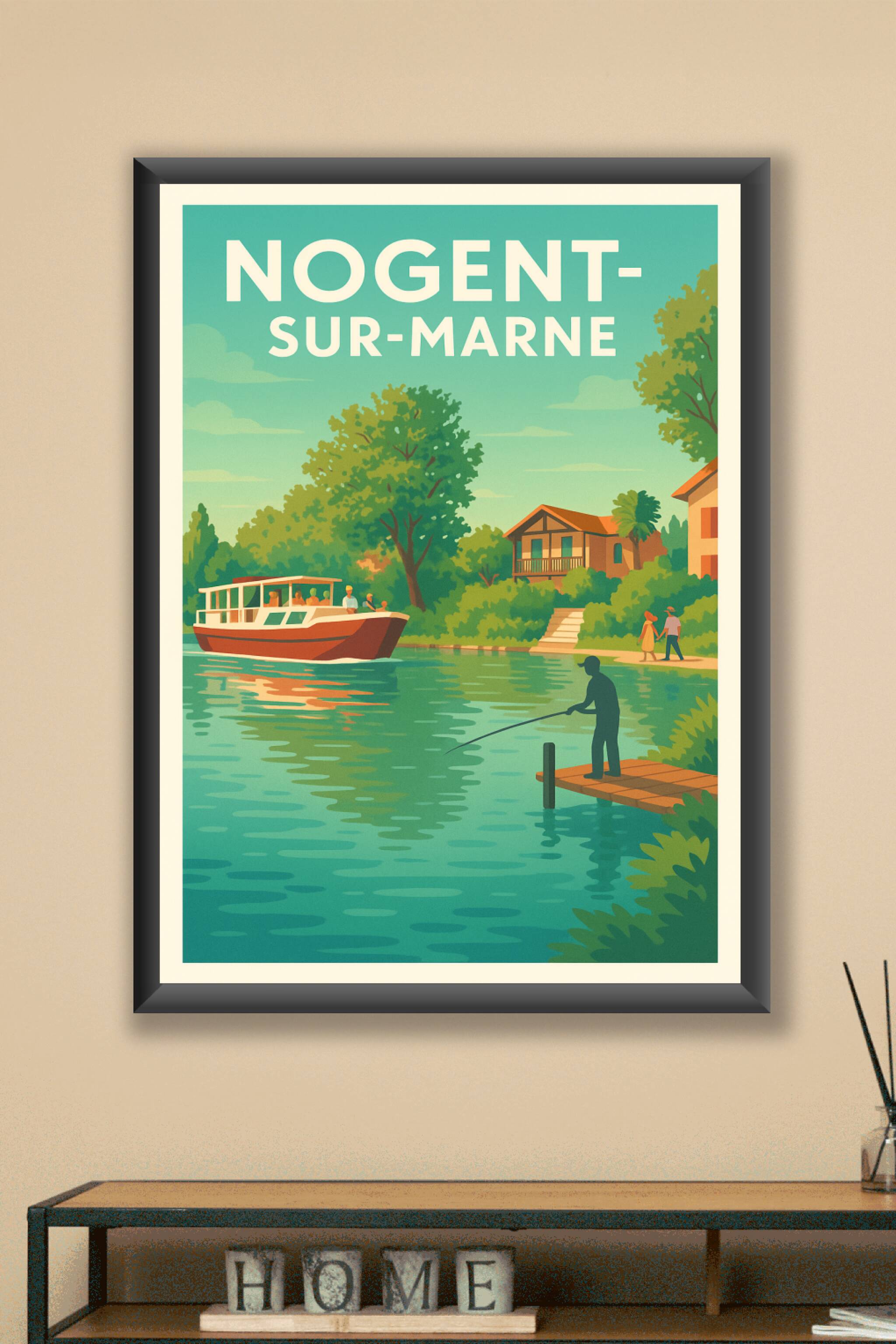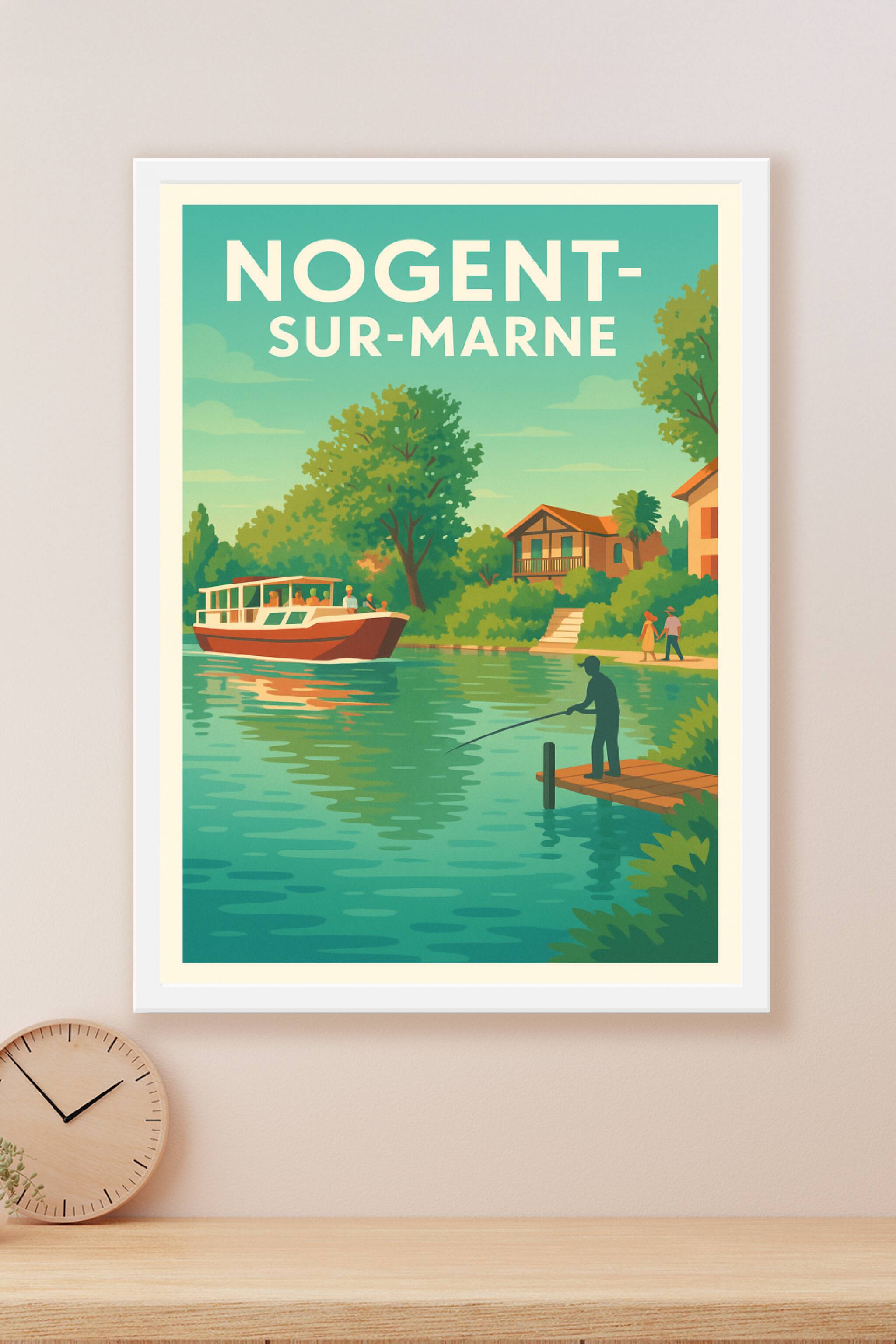 Découvrez la quiétude de Nogent-sur-Marne avec cette affiche illustrant une scène paisible entre nature verdoyante et flots calmes. Un pêcheur sur ...