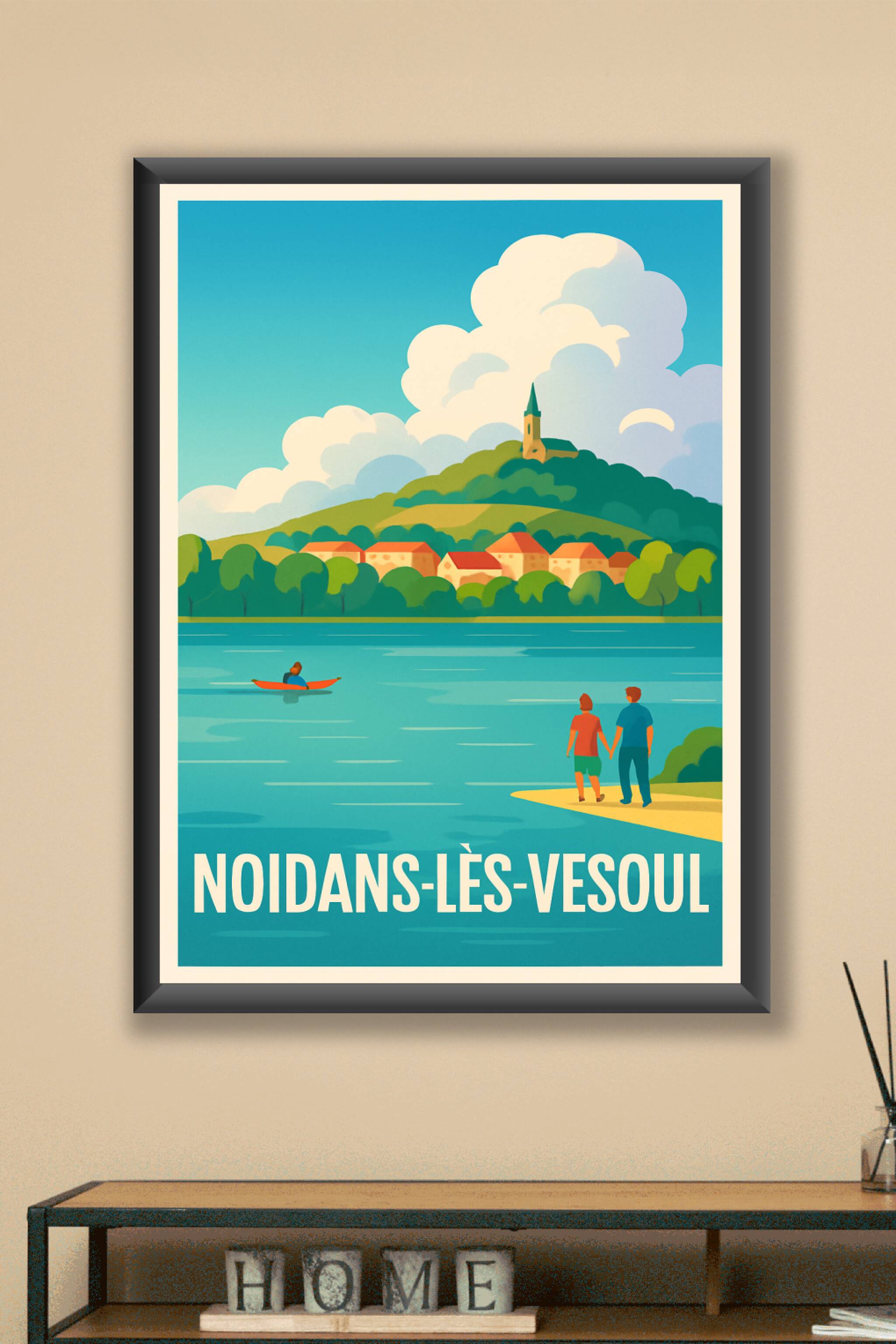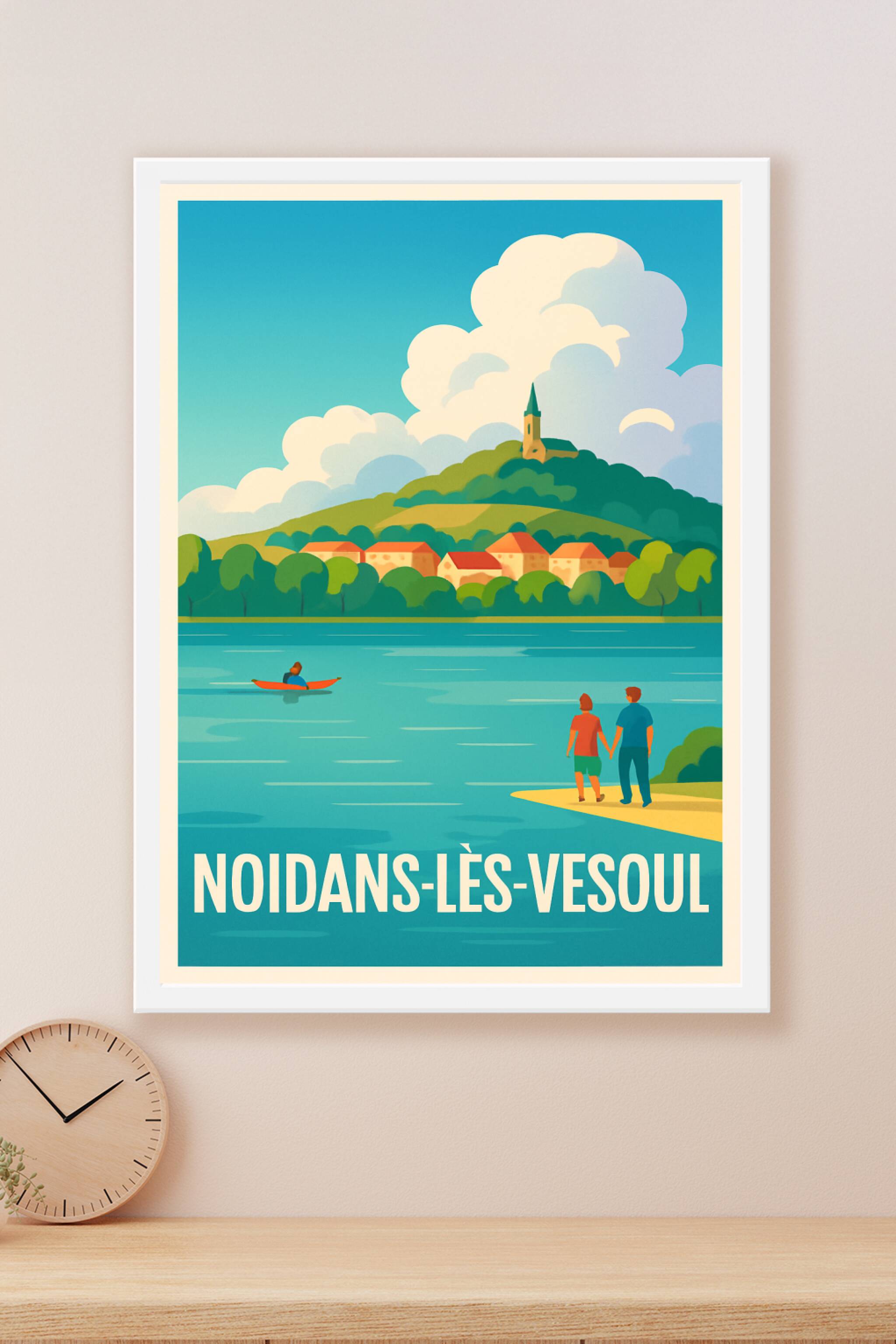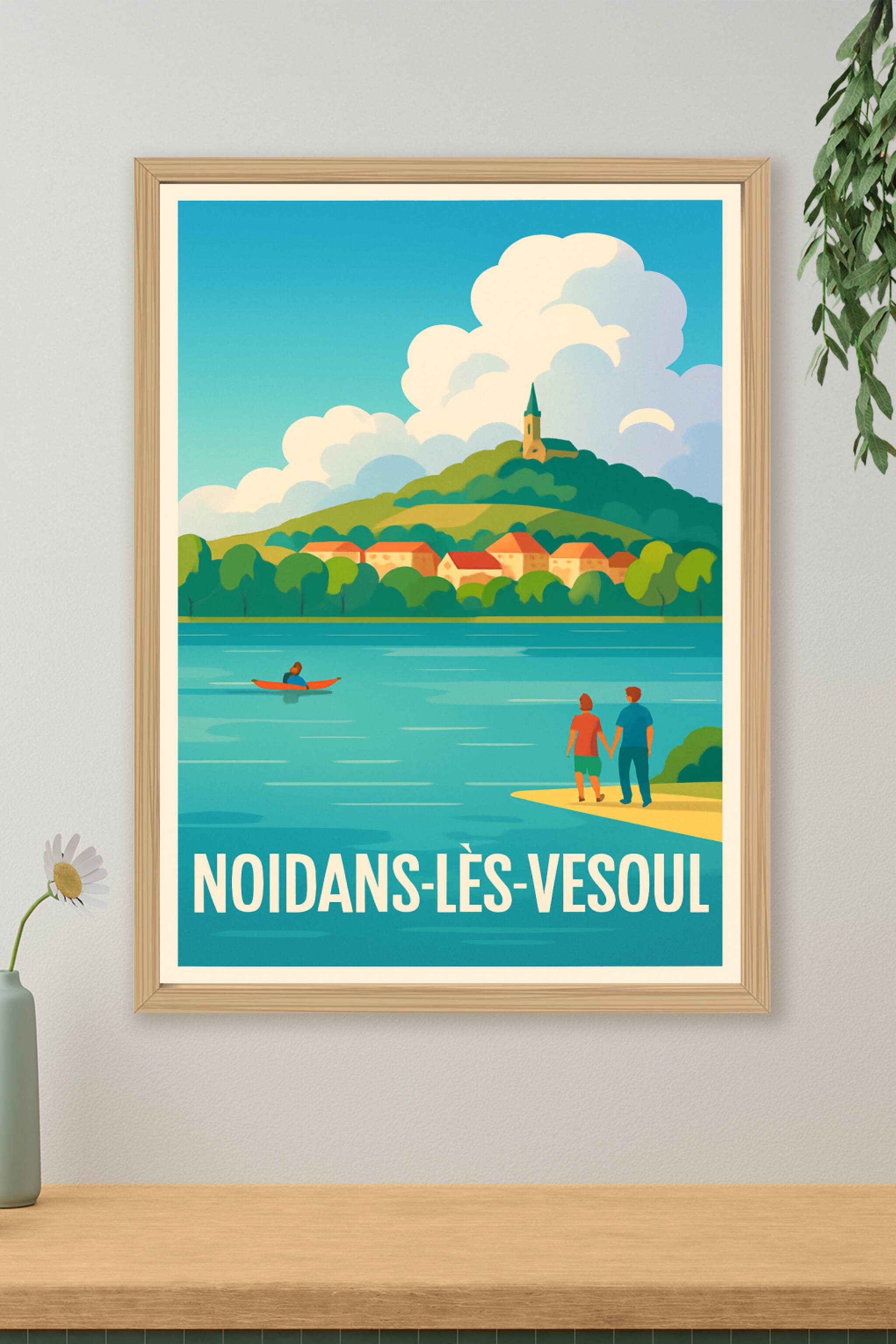 Découvrez la sérénité de Noidans-lès-Vesoul avec cette affiche illustrée mettant en scène un paysage bucolique jonché de maisons au toit rouge, une colline verdoyante surmontée d'une église, et un plan d'eau où une personne navigue en kayak. Deux promeneurs profitent de ce décor apaisant, parfait pour une décoration murale qui invite à la détente.Ce poster est imprimé en tirage "Fine Art" sur papier 305g coton, garantissant une qualité d'impression exceptionnelle et des couleurs éclatantes. Disponible en plusieurs formats de A1 à A4, avec ou sans cadre, cette affiche apportera une touche de douceur et d'authenticité à votre intérieur. Profitez d'un produit artisanal 100% fabriqué en France, idéal pour embellir votre maison ou offrir un cadeau raffiné aux amateurs de paysages pittoresques.