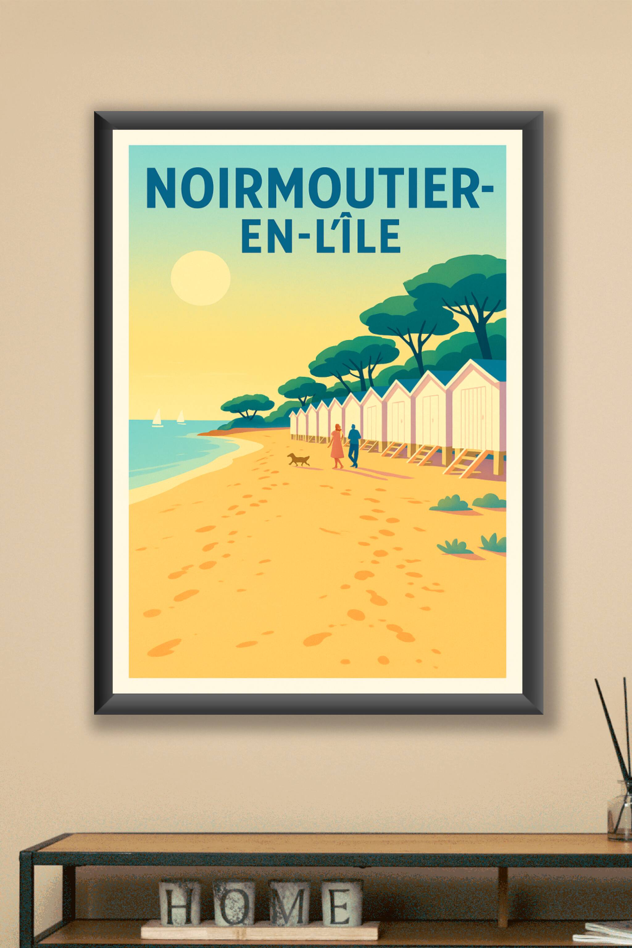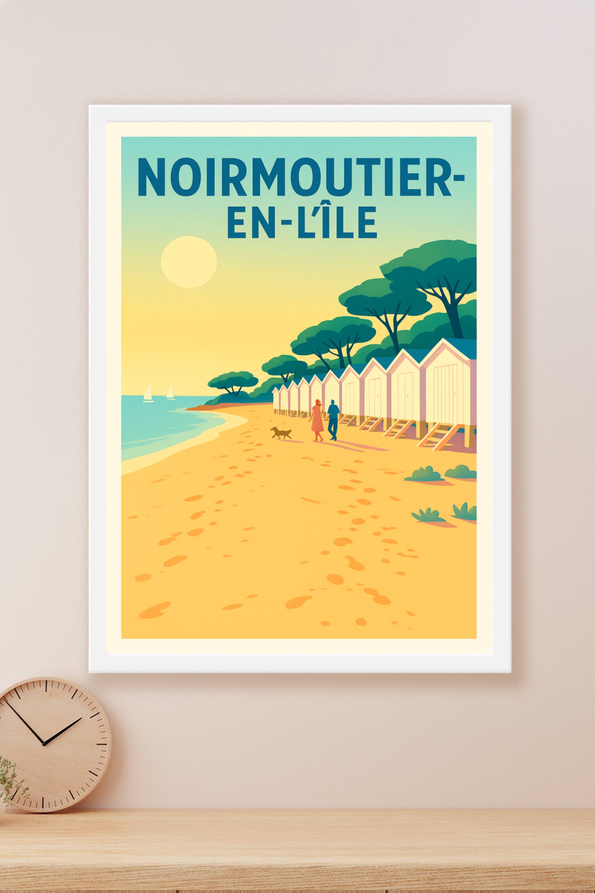 Découvrez l'atmosphère apaisante et lumineuse de Noirmoutier-en-l'Île avec cette affiche illustrée mettant en scène une plage bordée de cabanes bla...