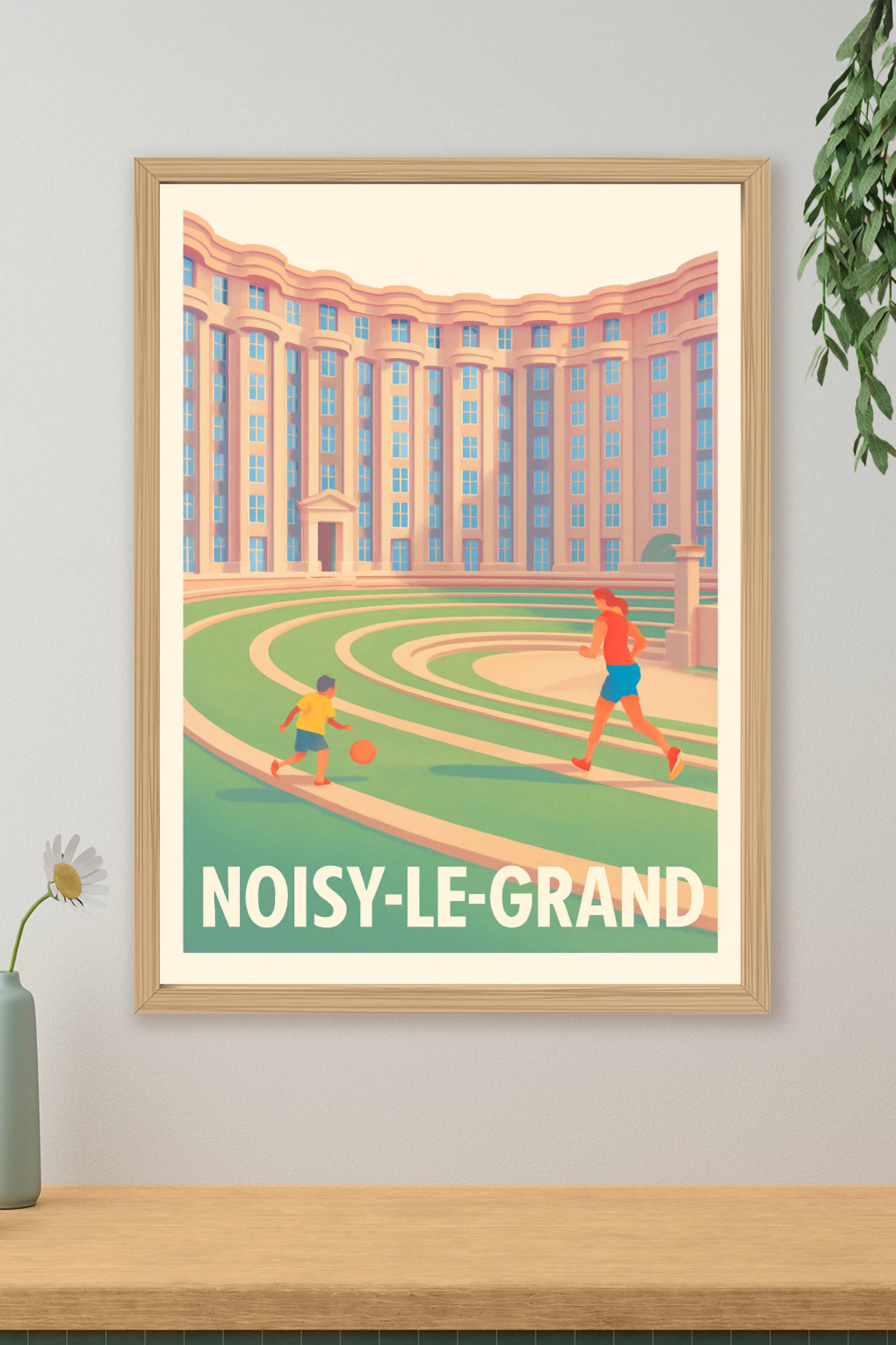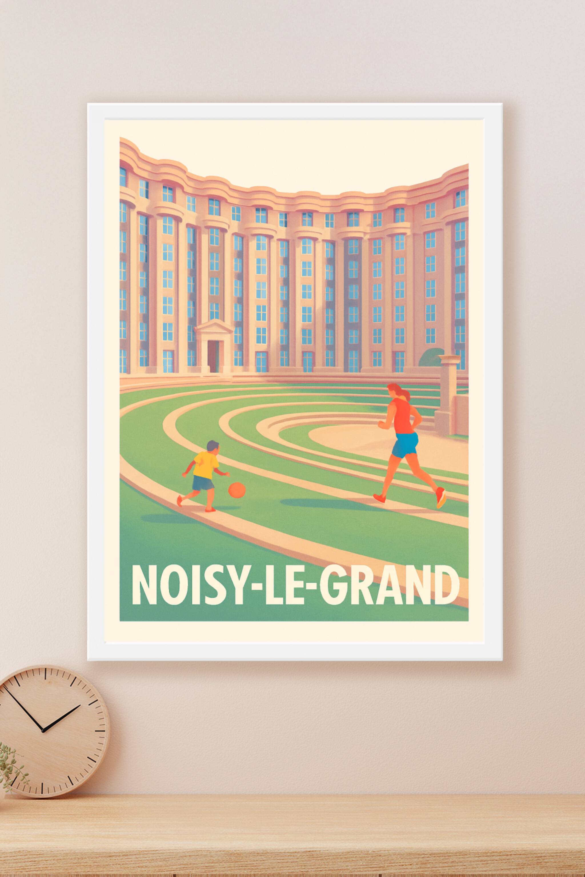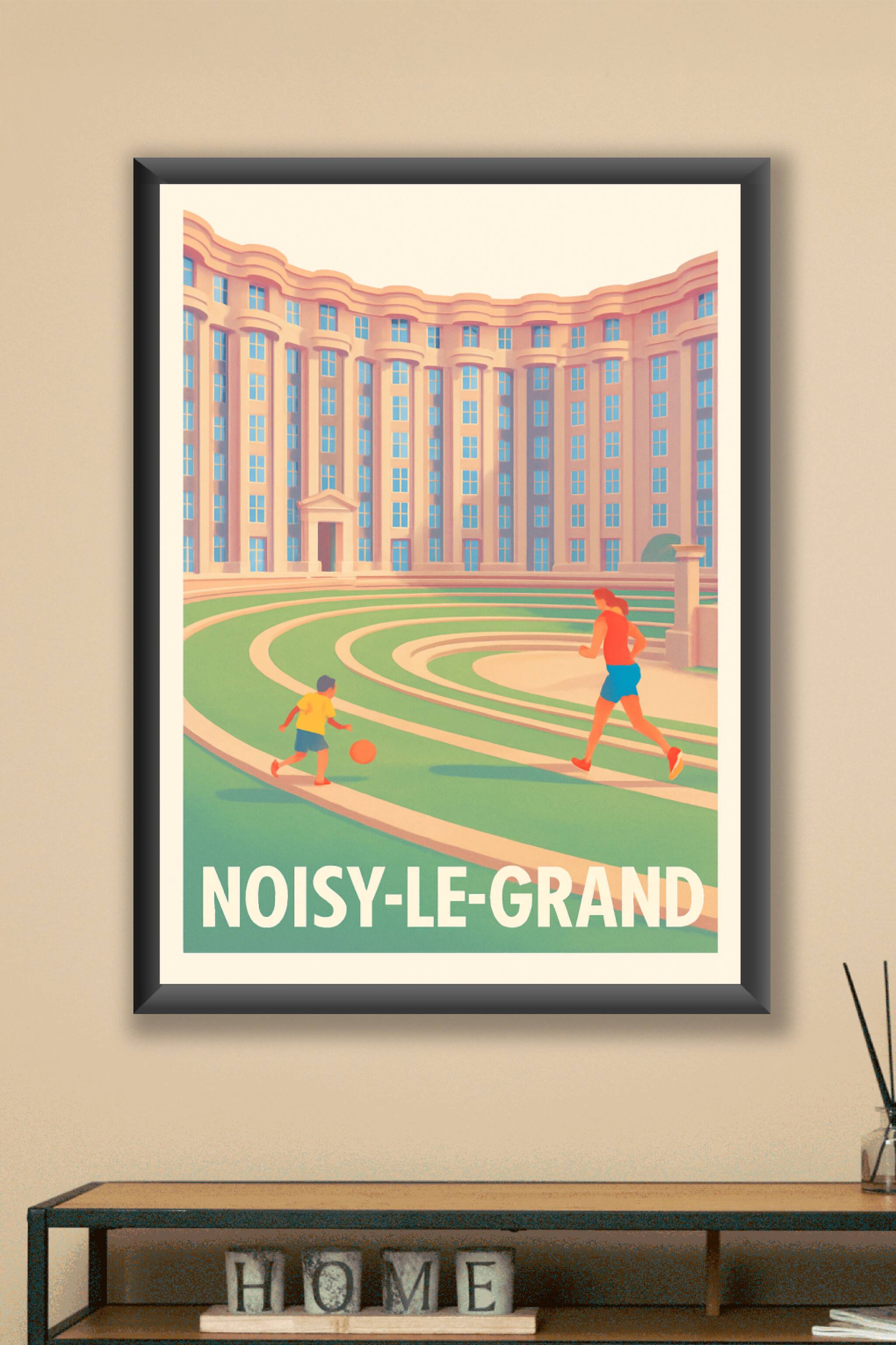 Découvrez cette superbe affiche illustrant l'architecture emblématique de Noisy-le-Grand, un quartier où modernité rime avec convivialité. Ce poste...