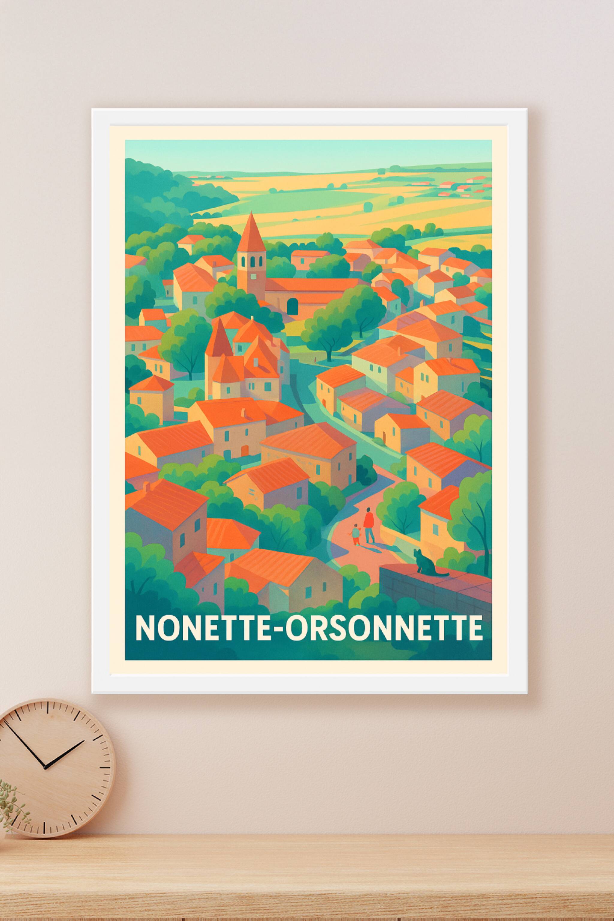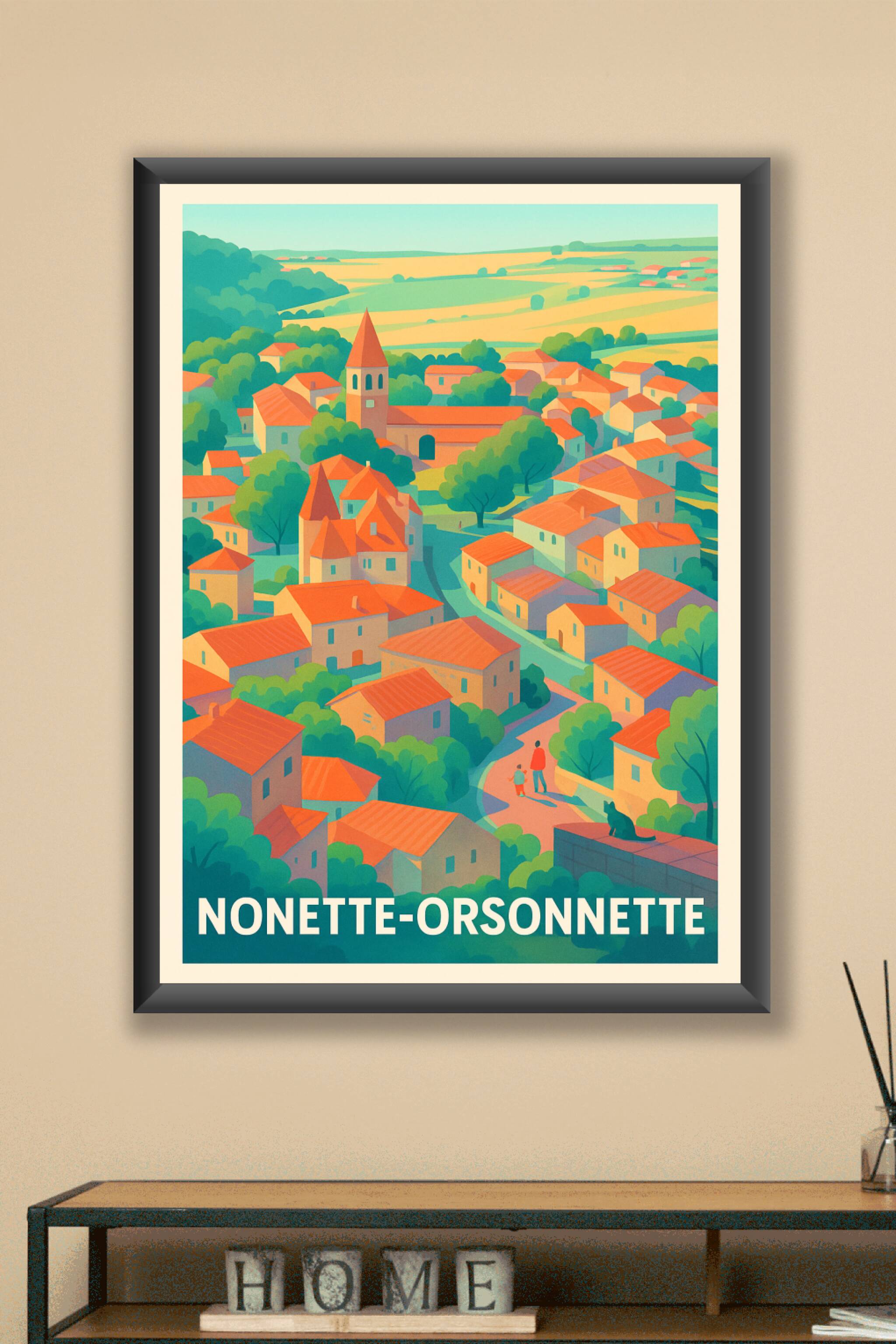 Découvrez le charme bucolique et coloré de Nonette-Orsonnette avec cette affiche artistique à l'ambiance chaleureuse et paisible. Illustrant le vil...