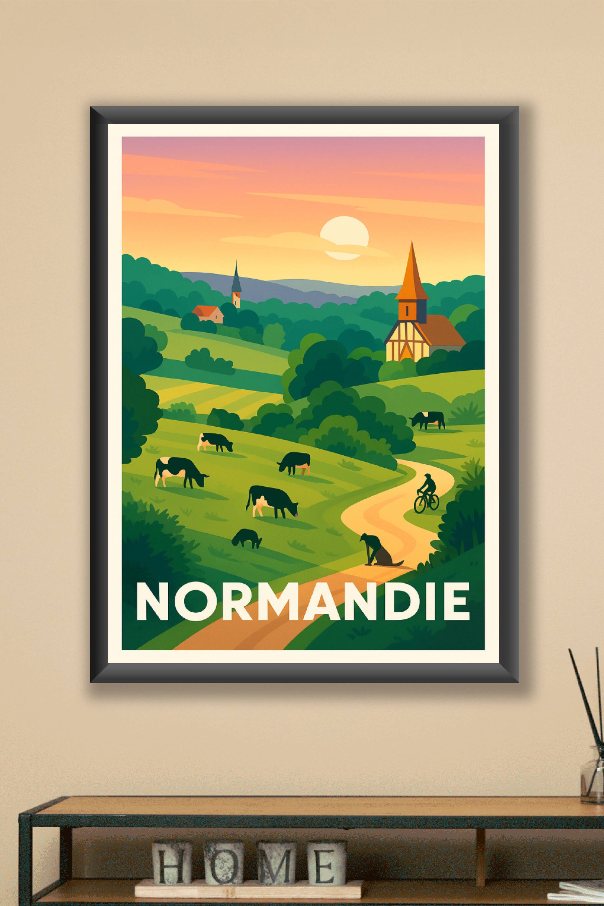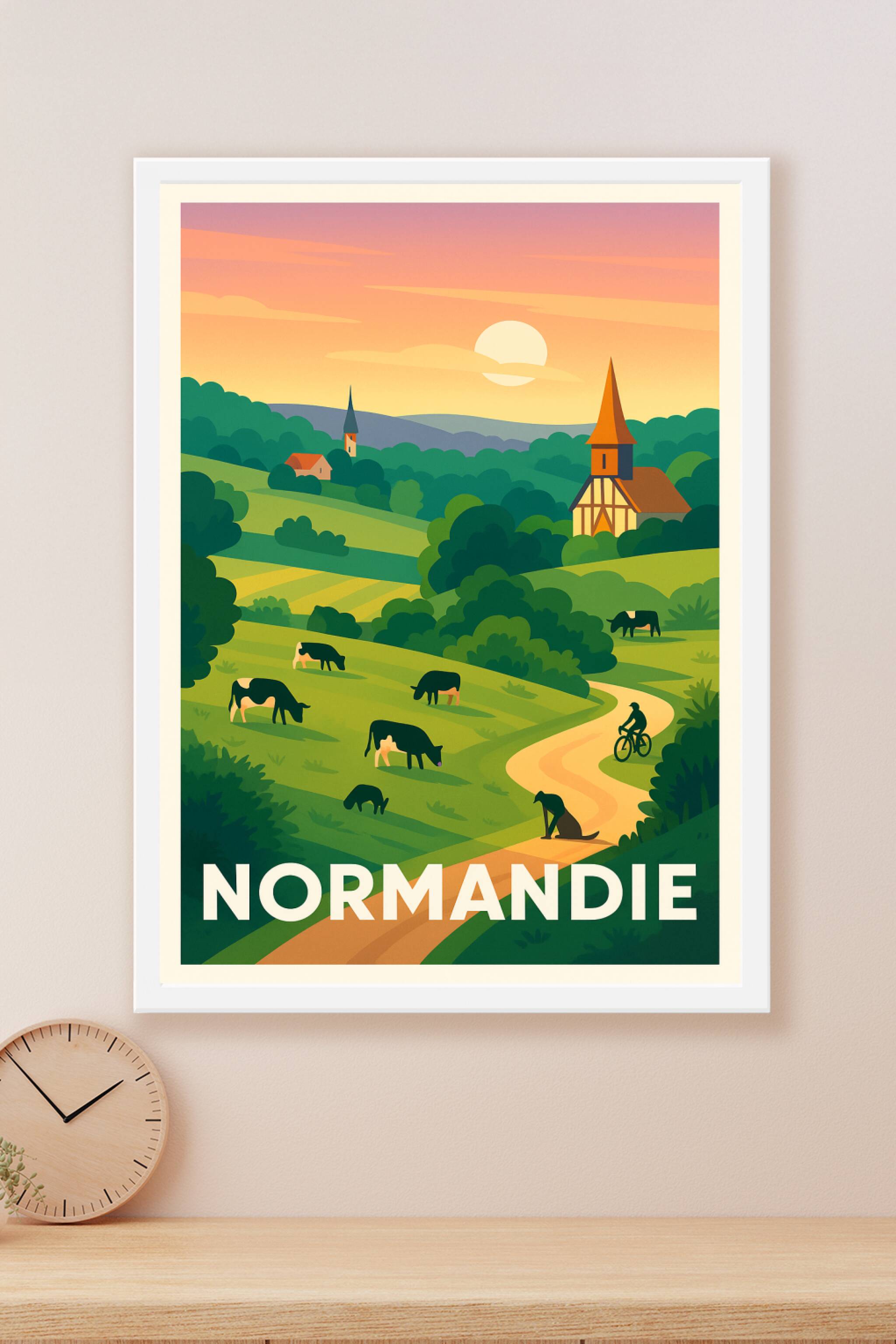 Découvrez la douceur de vivre normande avec cette affiche illustrée représentant un paysage rural paisible au coucher du soleil, où vaches, chemins...