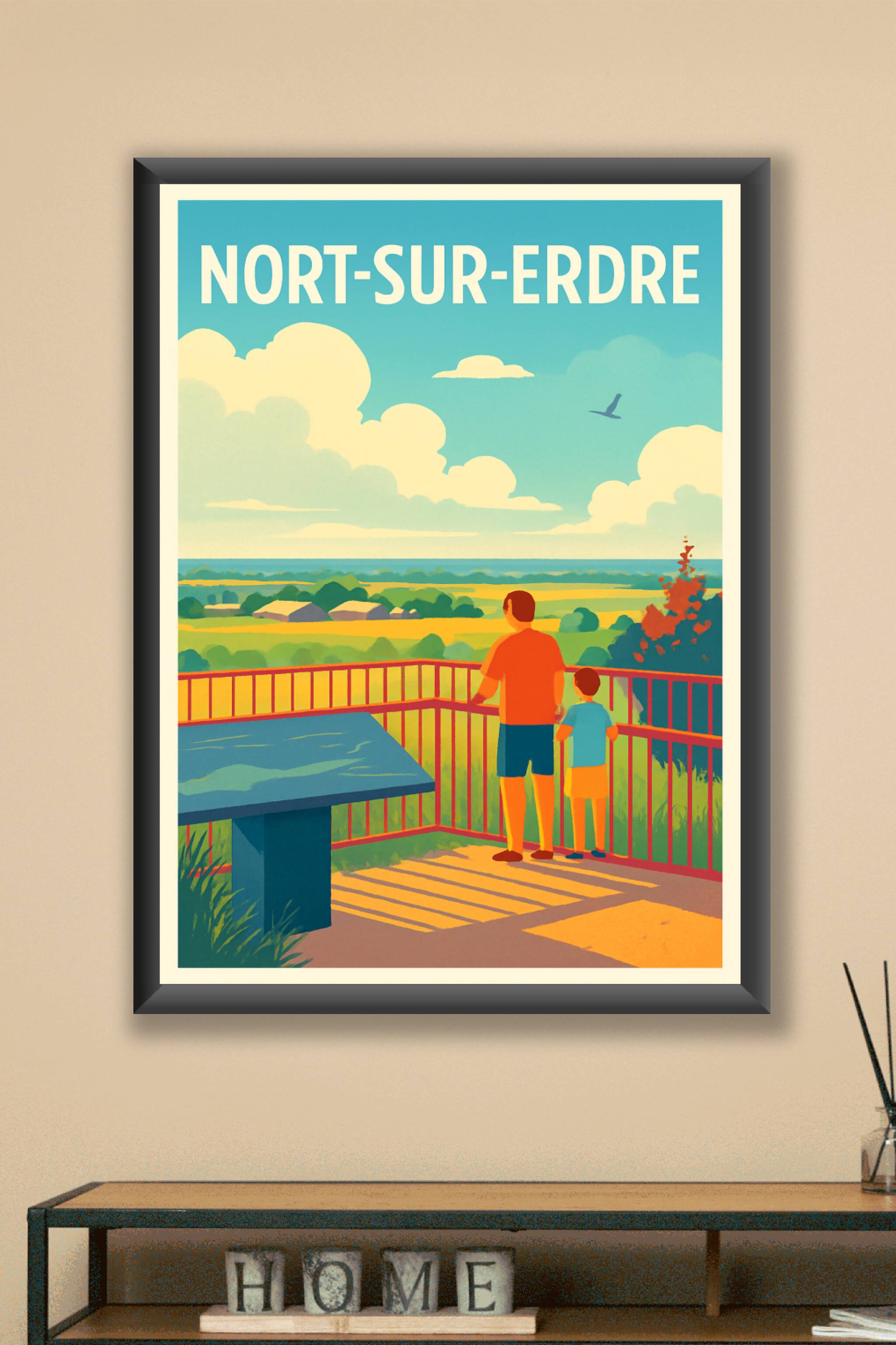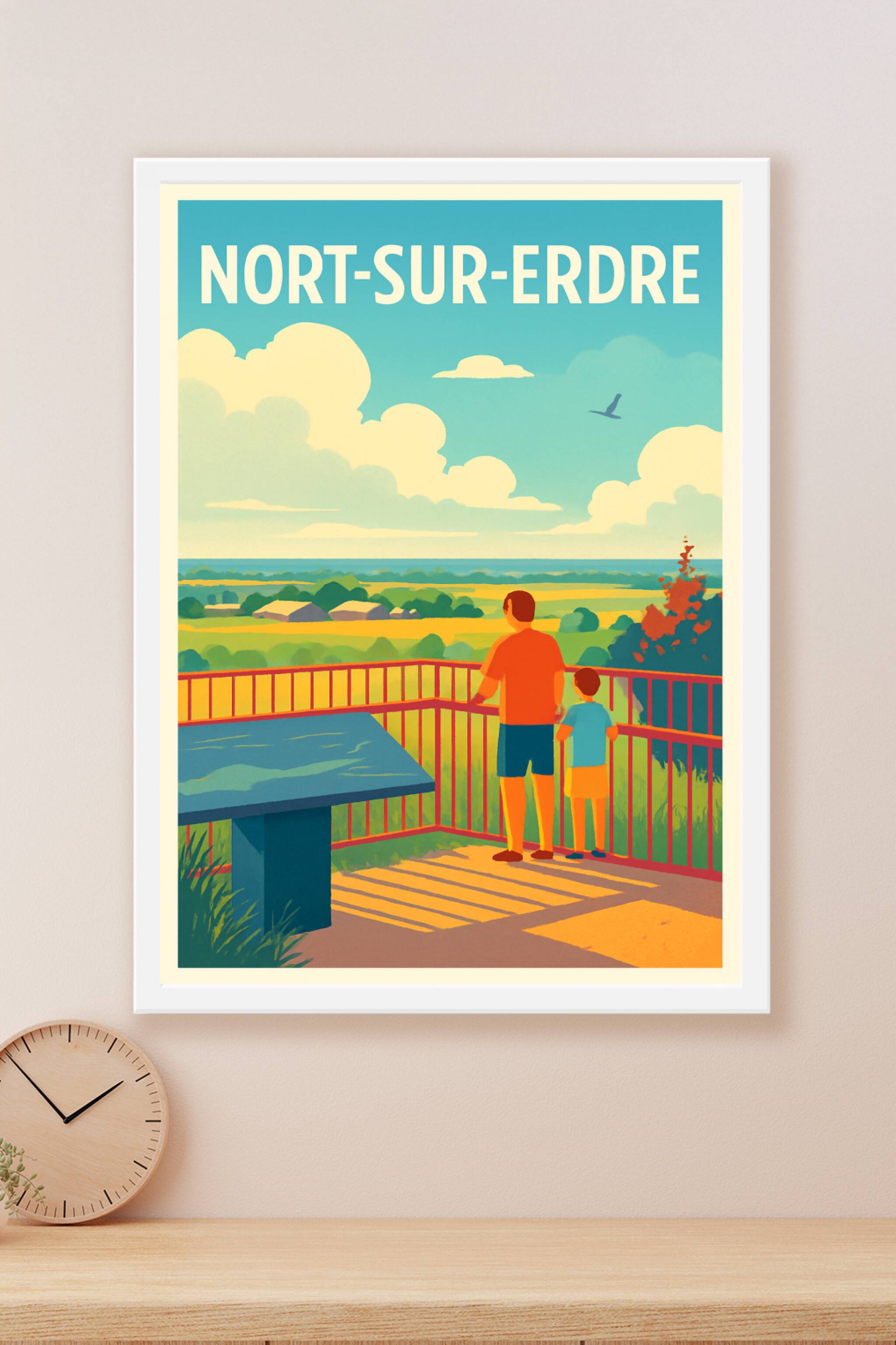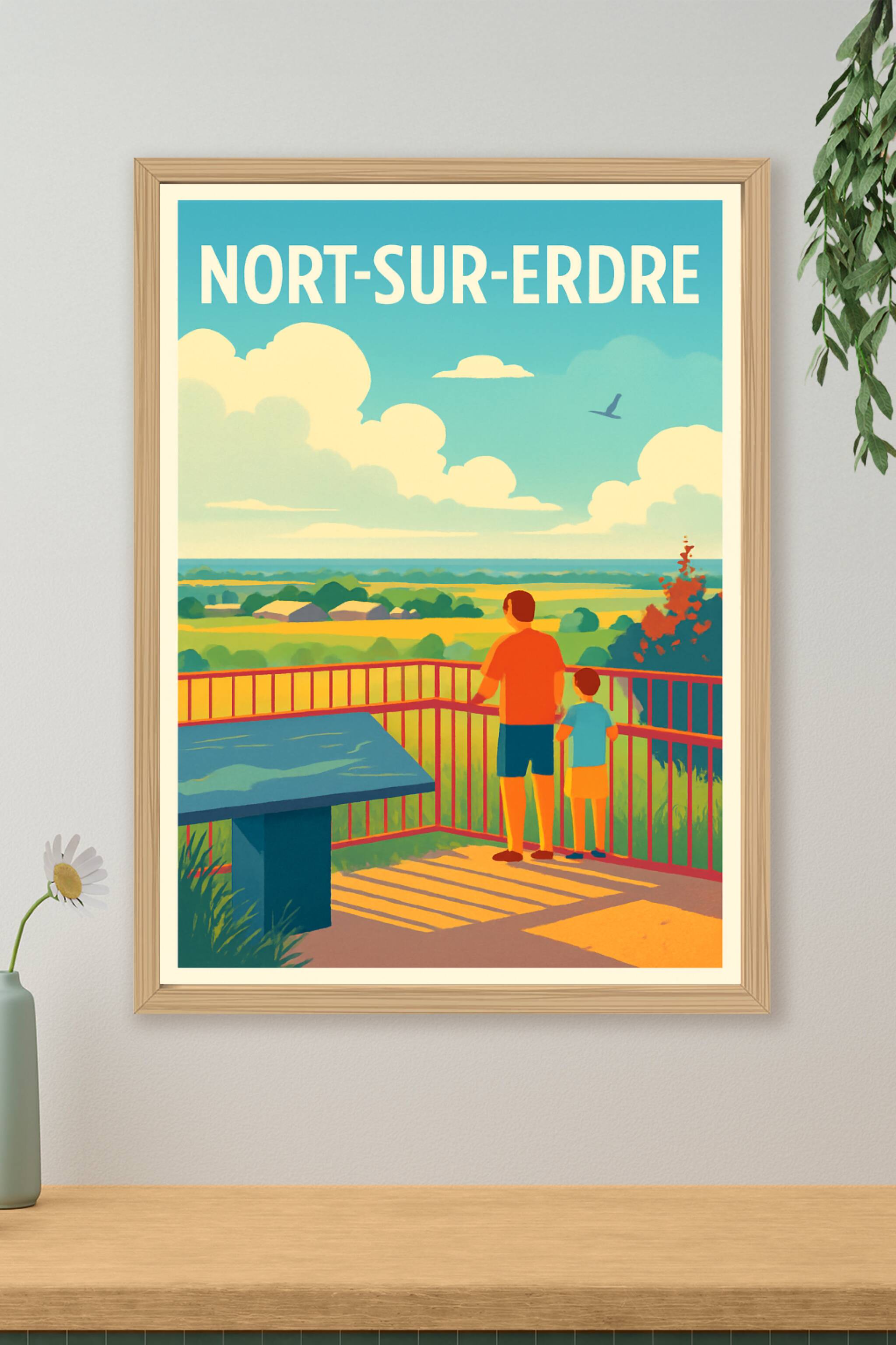 Découvrez la sérénité des paysages de Nort-sur-Erdre avec cette affiche illustrant un moment complice entre un père et son enfant, admirant les vas...