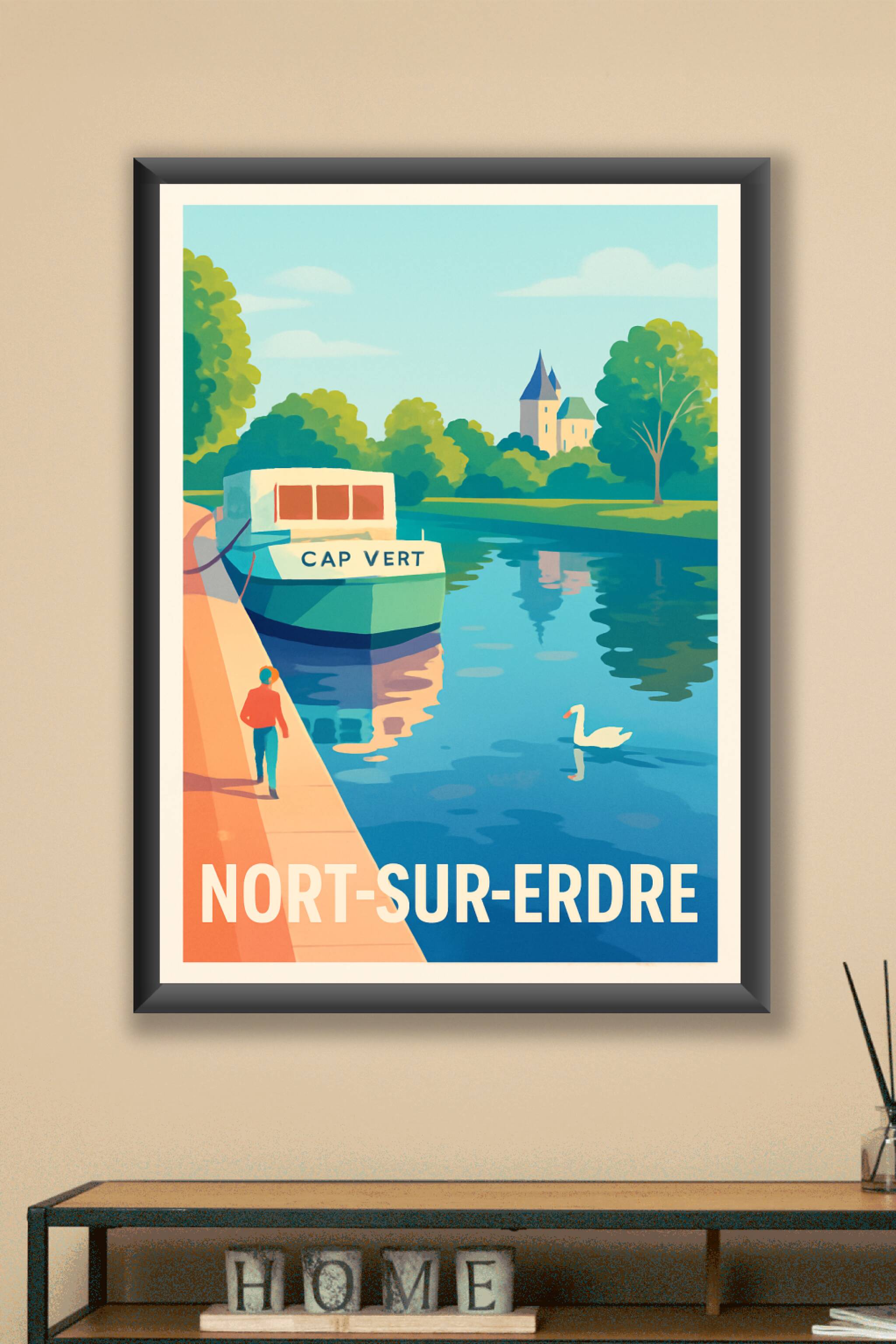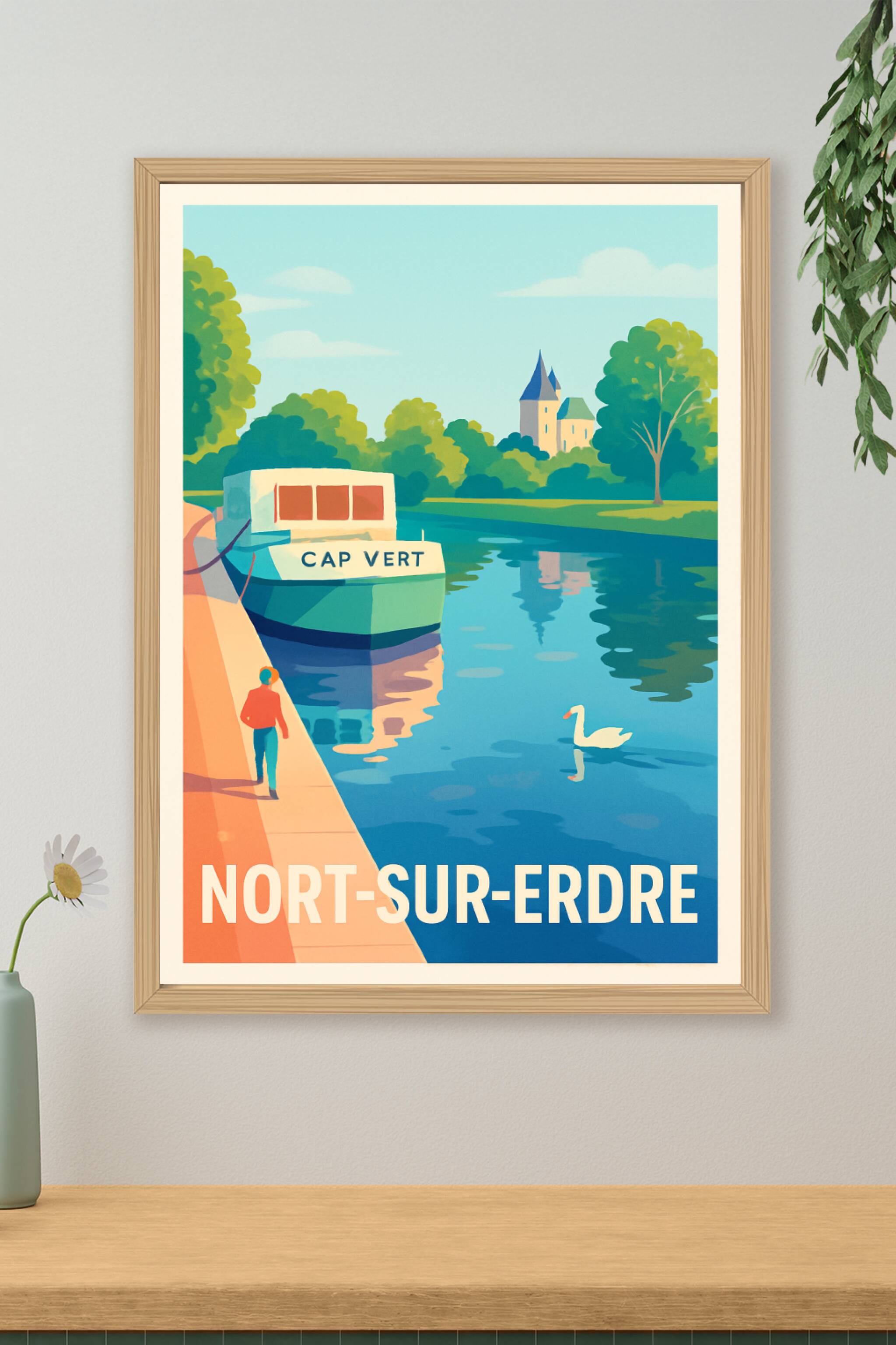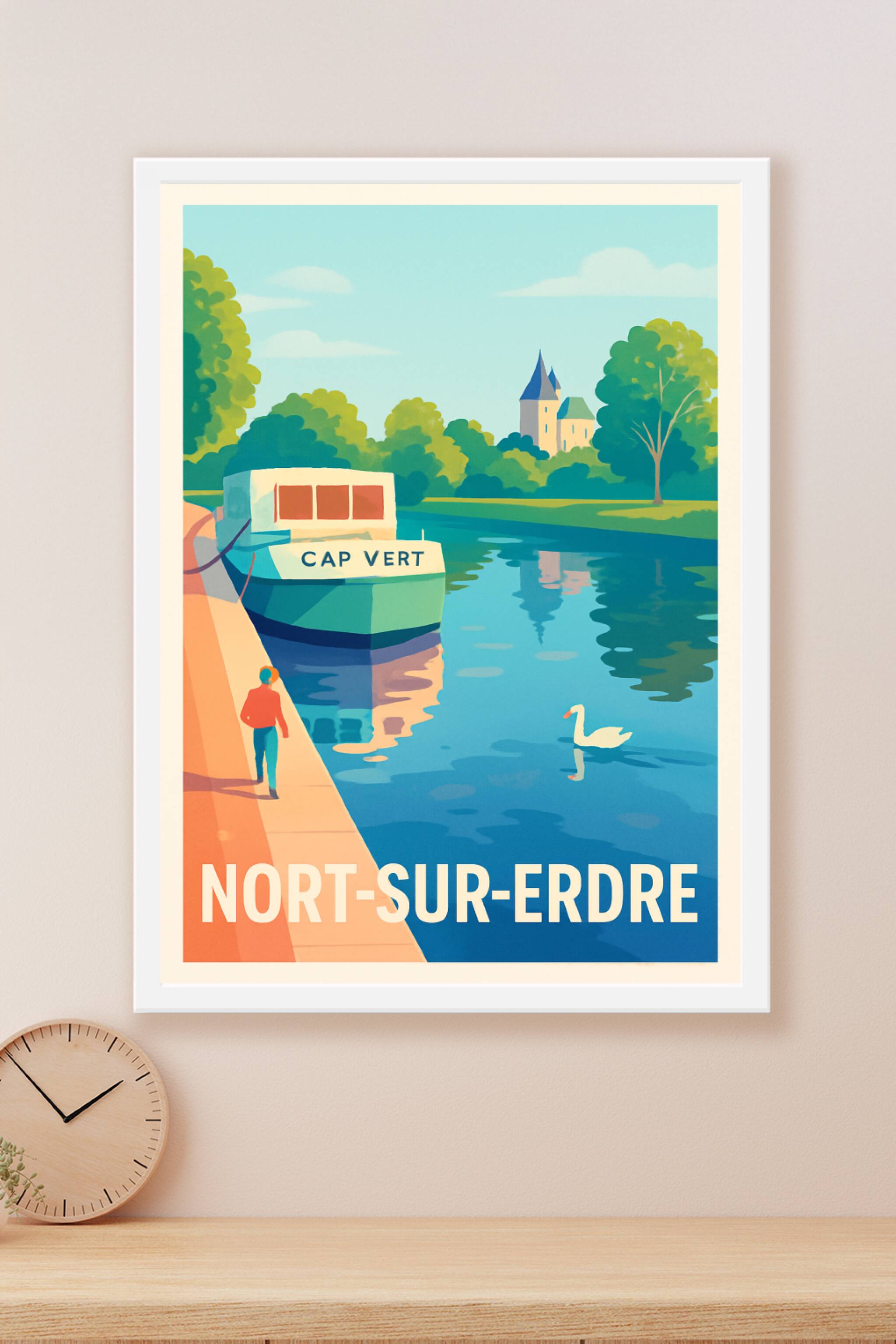 Apportez une touche de calme et de fraîcheur à votre intérieur avec cette affiche illustrée représentant la rivière paisible de Nort-sur-Erdre, où un bateau nommé "Cap Vert" se mêle au reflet des arbres et à la silhouette d'un château. Ce poster au style vintage évoque la douceur de vivre au bord de l'eau. Imprimée en tirage "Fine Art" sur un papier 305g coton de très haute qualité, cette affiche garantit des couleurs éclatantes et une durabilité optimale. Disponible aux formats A1, A2, A3 et A4, avec ou sans cadre, elle s'adapte parfaitement à tous vos espaces. Offrez-vous ou offrez un souvenir élégant et authentique de Nort-sur-Erdre grâce à ce poster unique, 100% fabriqué en France.