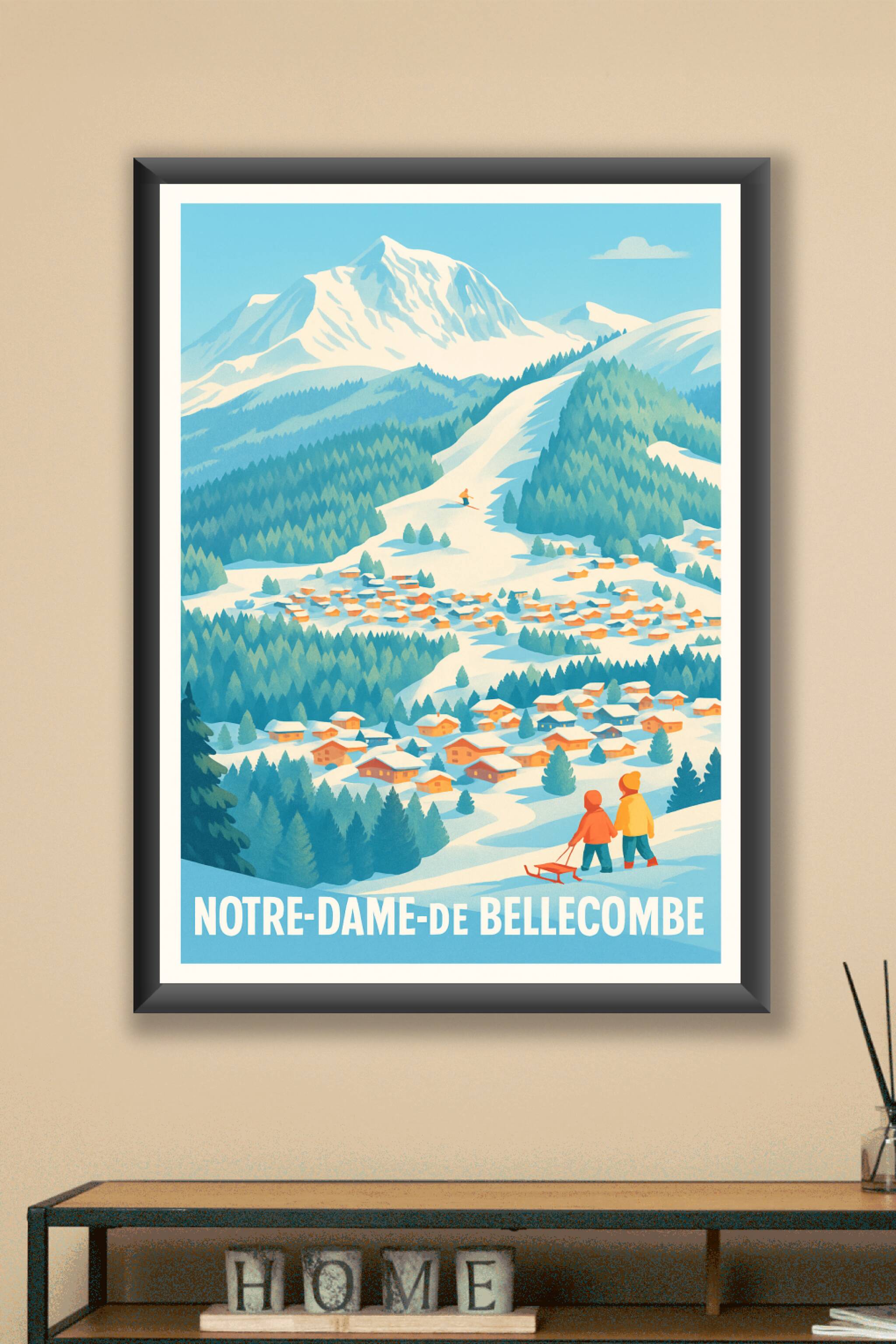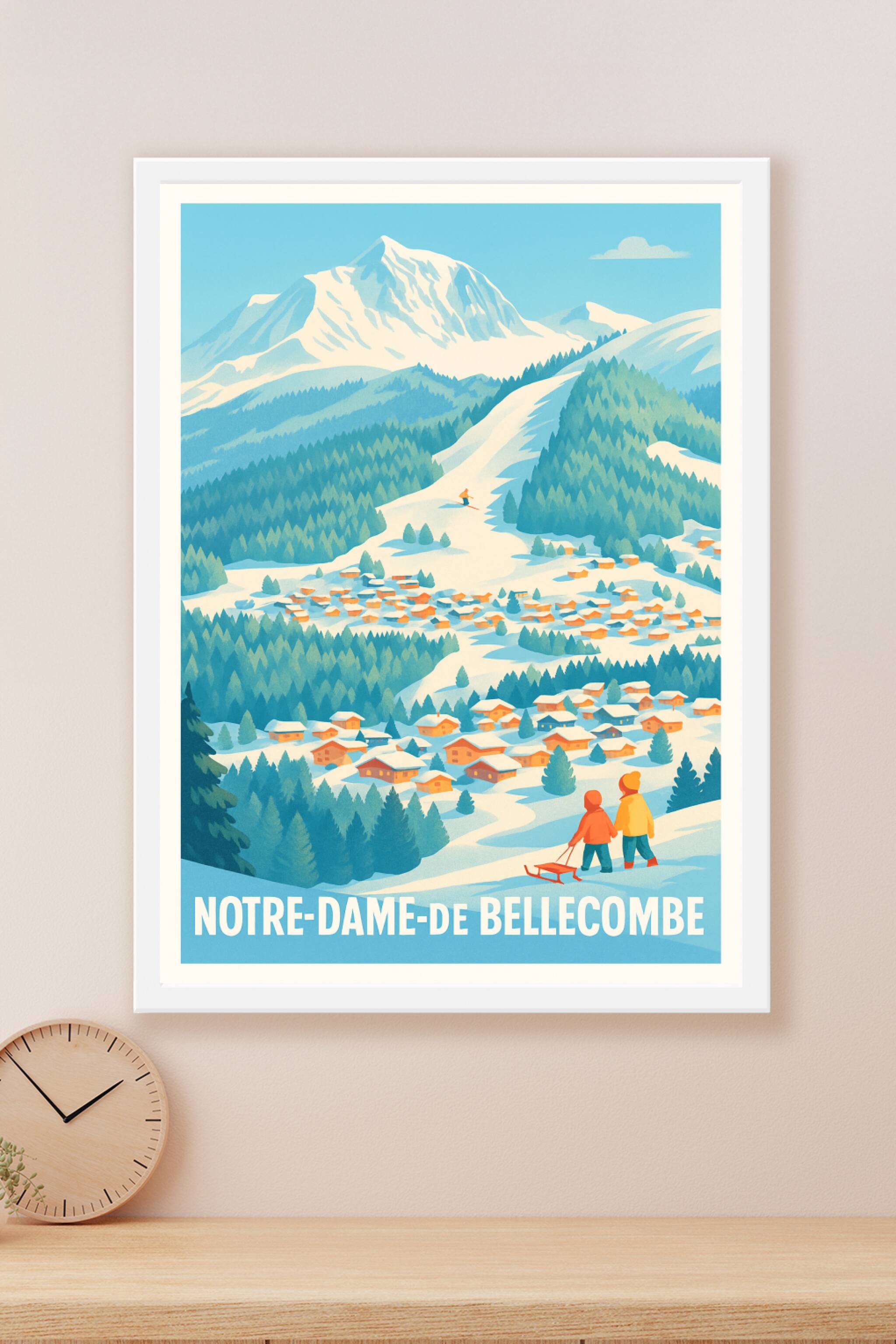Découvrez la douceur hivernale de Notre-Dame-de-Bellecombe avec cette affiche au style rétro qui capture un village alpin paisible sous la neige. L'illustration met en scène deux enfants avec leur luge au premier plan, un skieur descendant les pistes, et les chalets typiques entourés de forêts au pied de majestueuses montagnes enneigées.Ce poster est imprimé en tirage "Fine Art" sur papier 305g coton, garantissant une qualité d'impression supérieure et une longévité optimale. Disponible en formats A1 à A4, avec ou sans cadre, cet article apportera une touche chaleureuse et authentique à votre décoration intérieure. Une création 100% fabriquée en France parfaite pour les amoureux des paysages montagnards et du charme des Alpes.