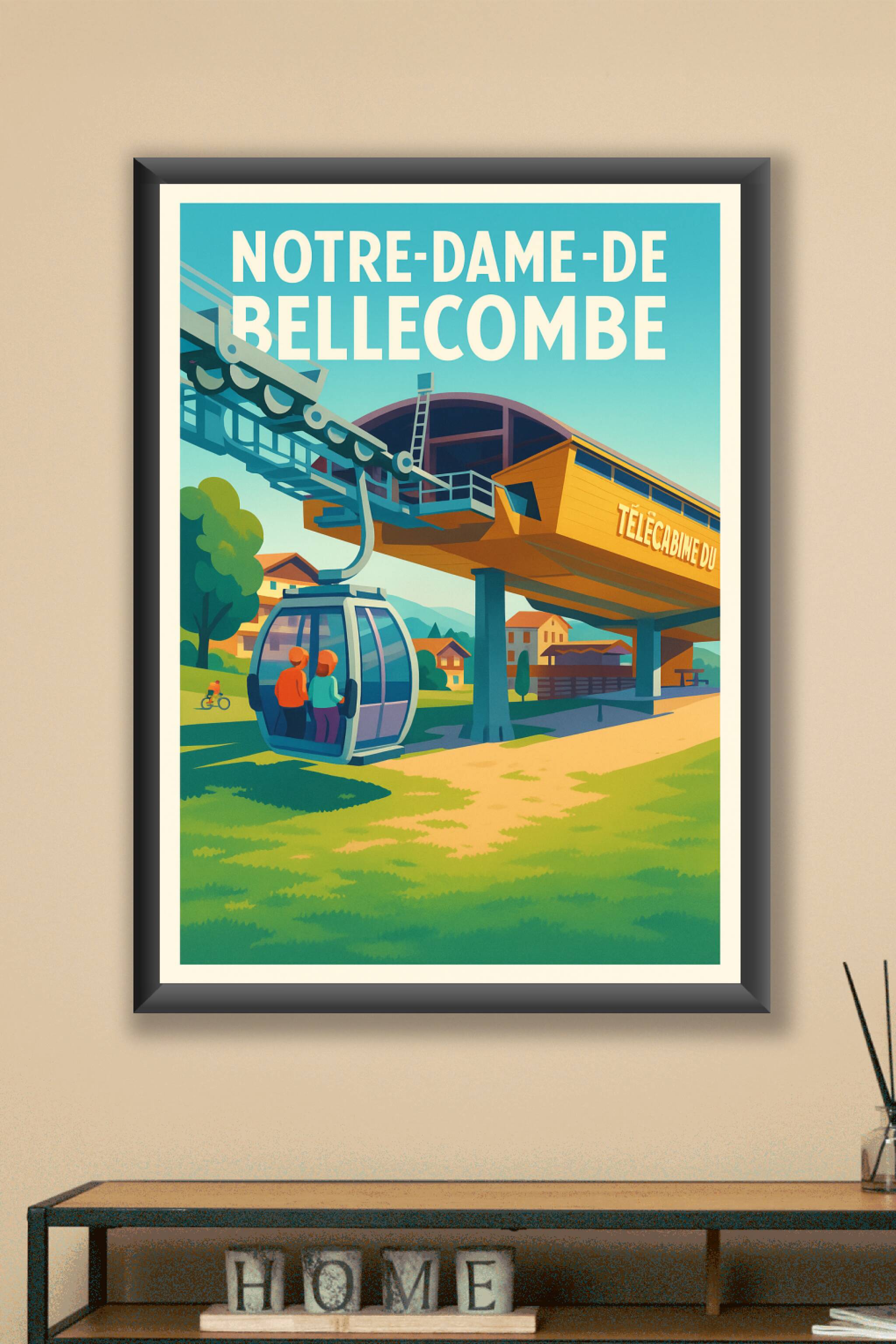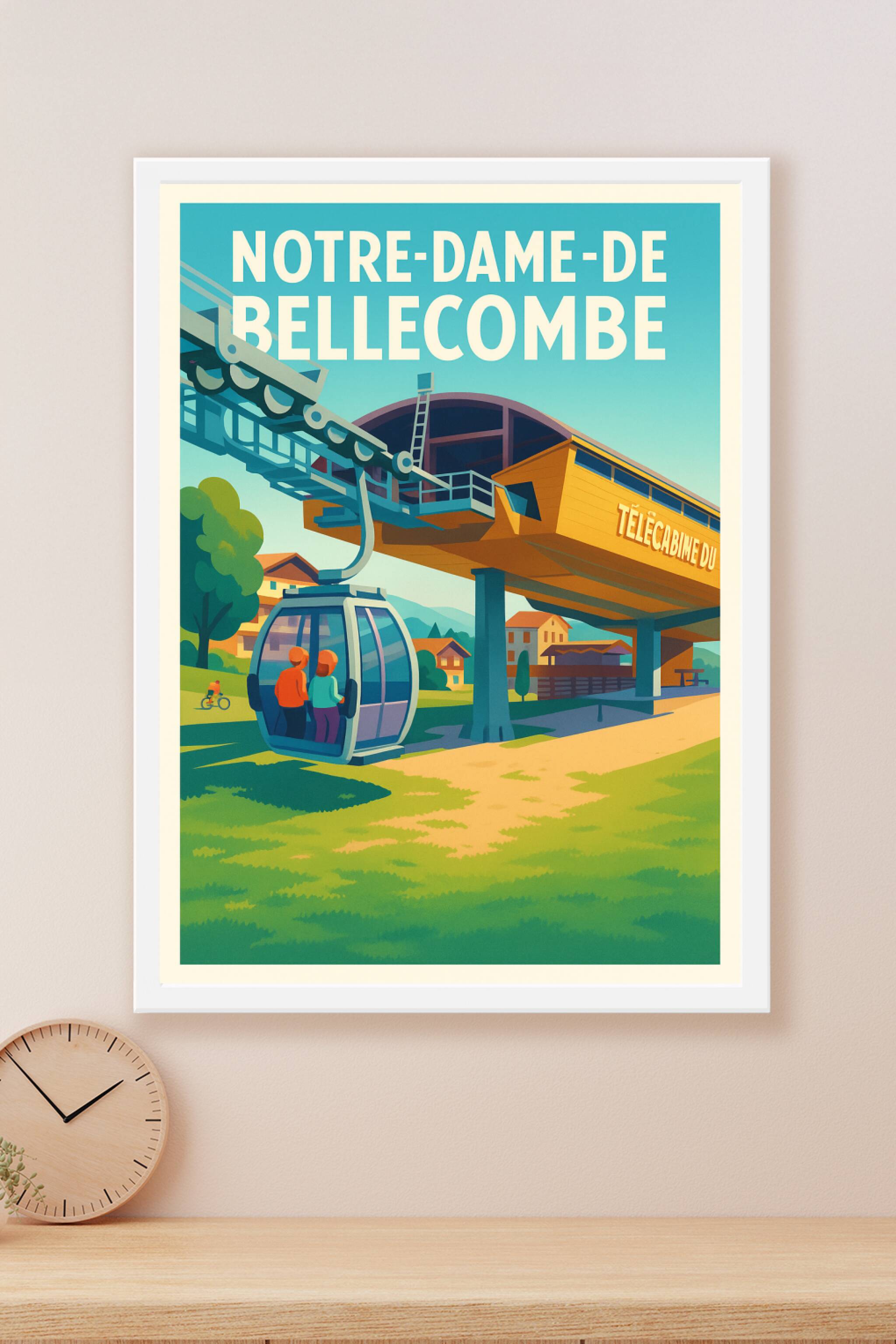 Découvrez l'ambiance montagnarde et le charme authentique de Notre-Dame-de-Bellecombe avec cette affiche illustrée mettant en scène le téléphérique...