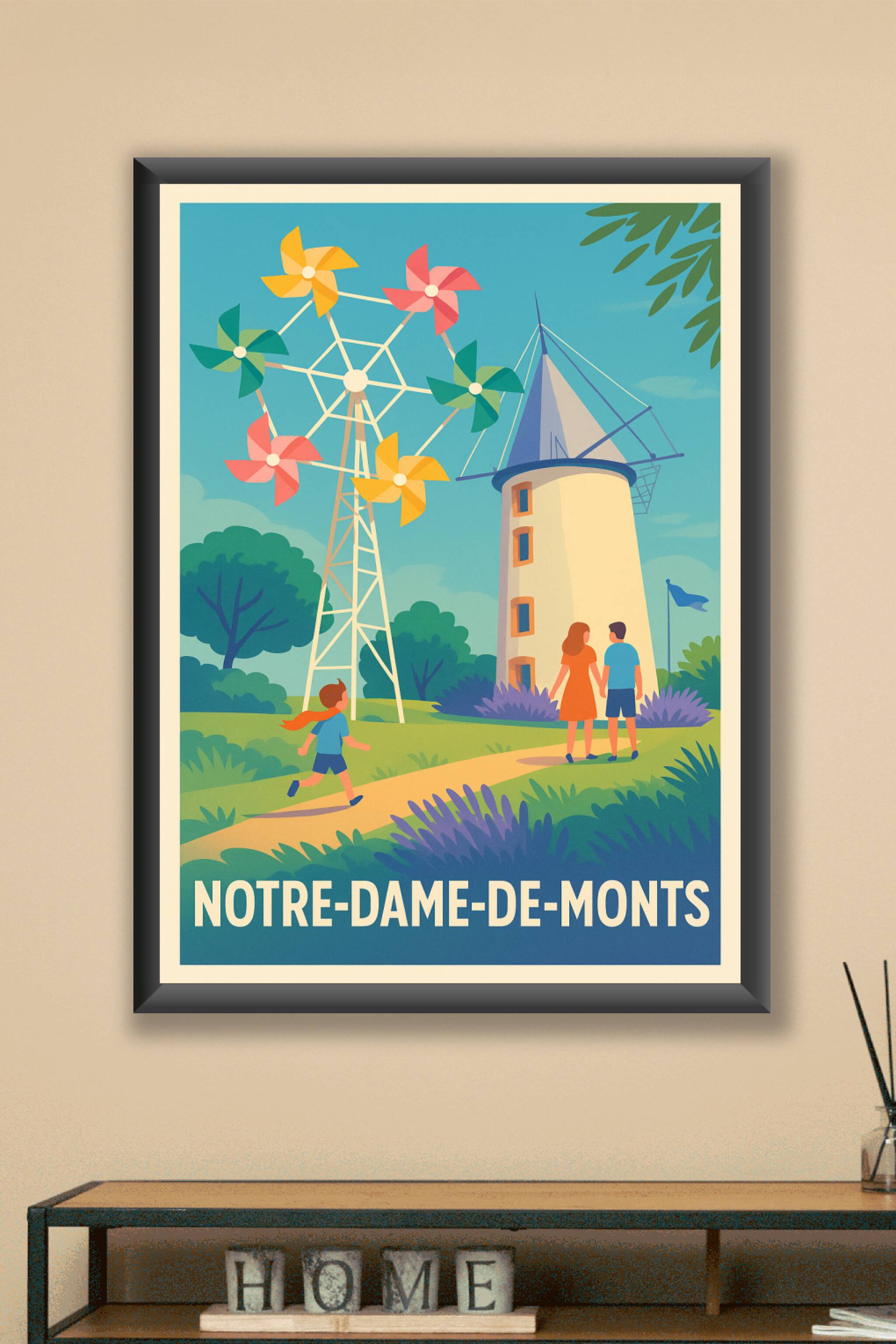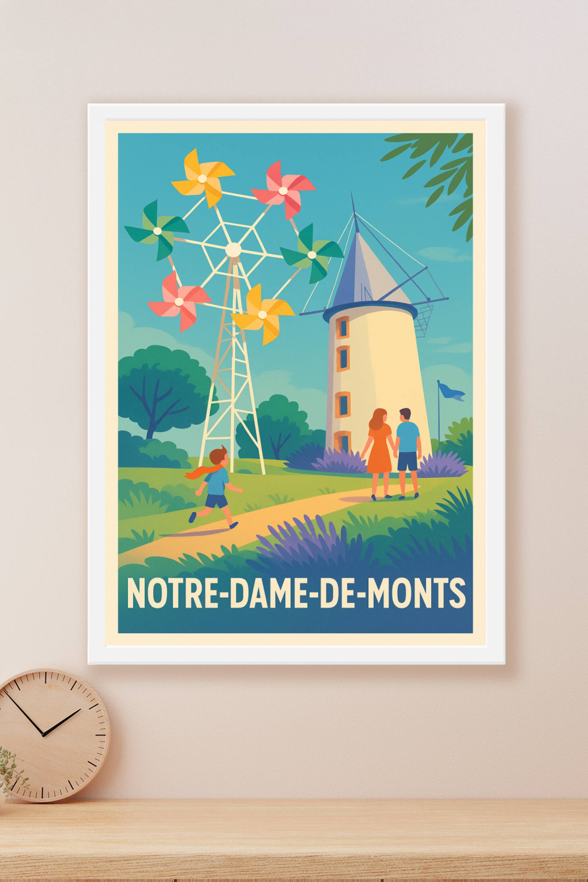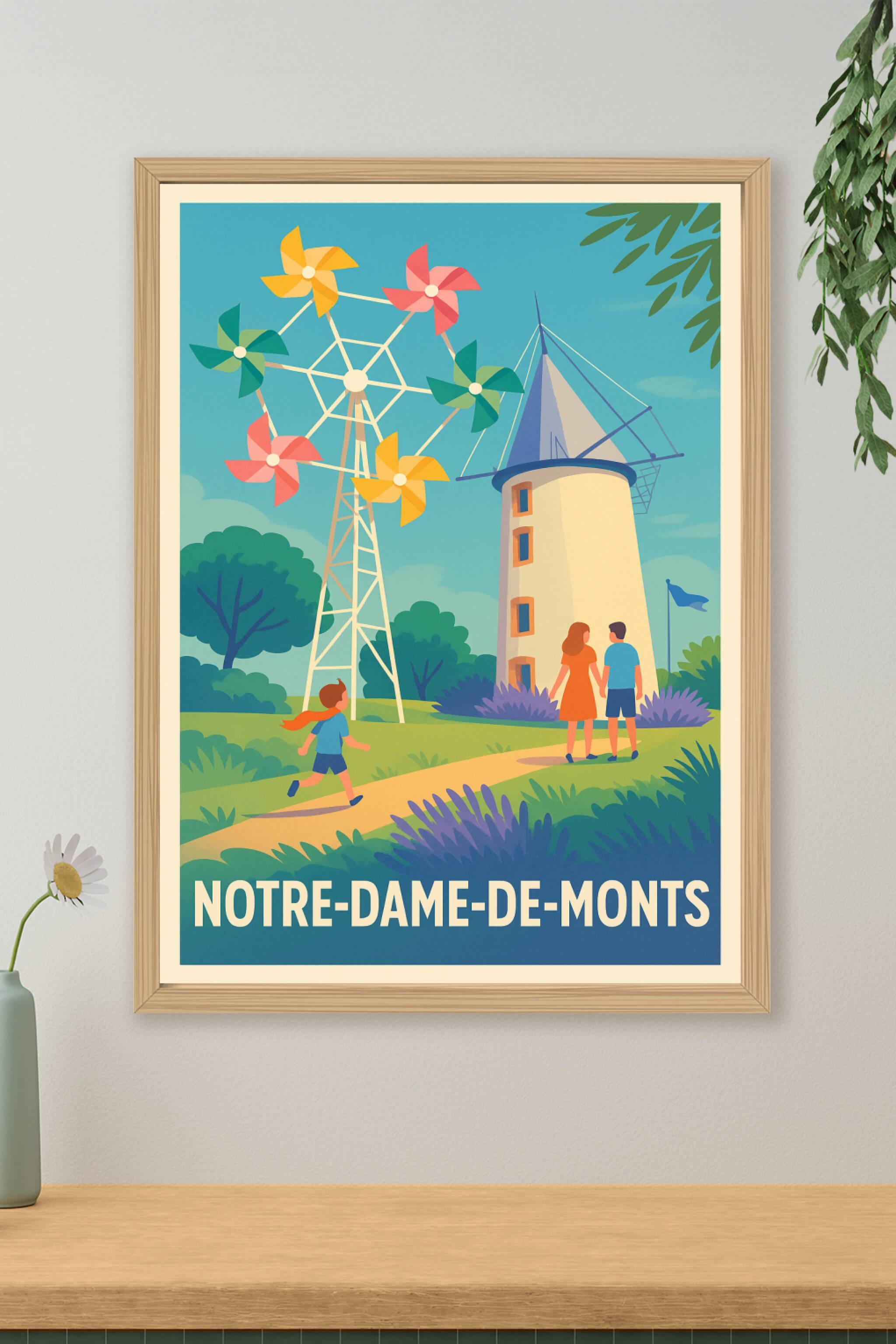 Découvrez l'ambiance paisible et colorée de Notre-Dame-de-Monts à travers cette affiche vintage illustrée. Ce poster évoque la fin d'une journée ensoleillée avec son moulin typique et ses éoliennes colorées, où une famille profite d'une promenade au cœur de la nature vendéenne. Imprimée en tirage "Fine Art" sur un papier 305g coton, cette affiche garantit une qualité d'impression exceptionnelle et une richesse des couleurs, idéale pour sublimer votre intérieur. Disponible en formats A1 à A4, avec ou sans cadre, cette décoration murale unique est un hommage délicat à cette charmante destination. Fabriquée en France, elle est parfaite pour offrir ou enrichir votre collection d'affiches de villes françaises.
